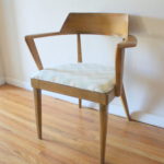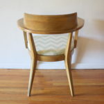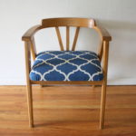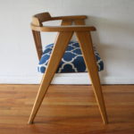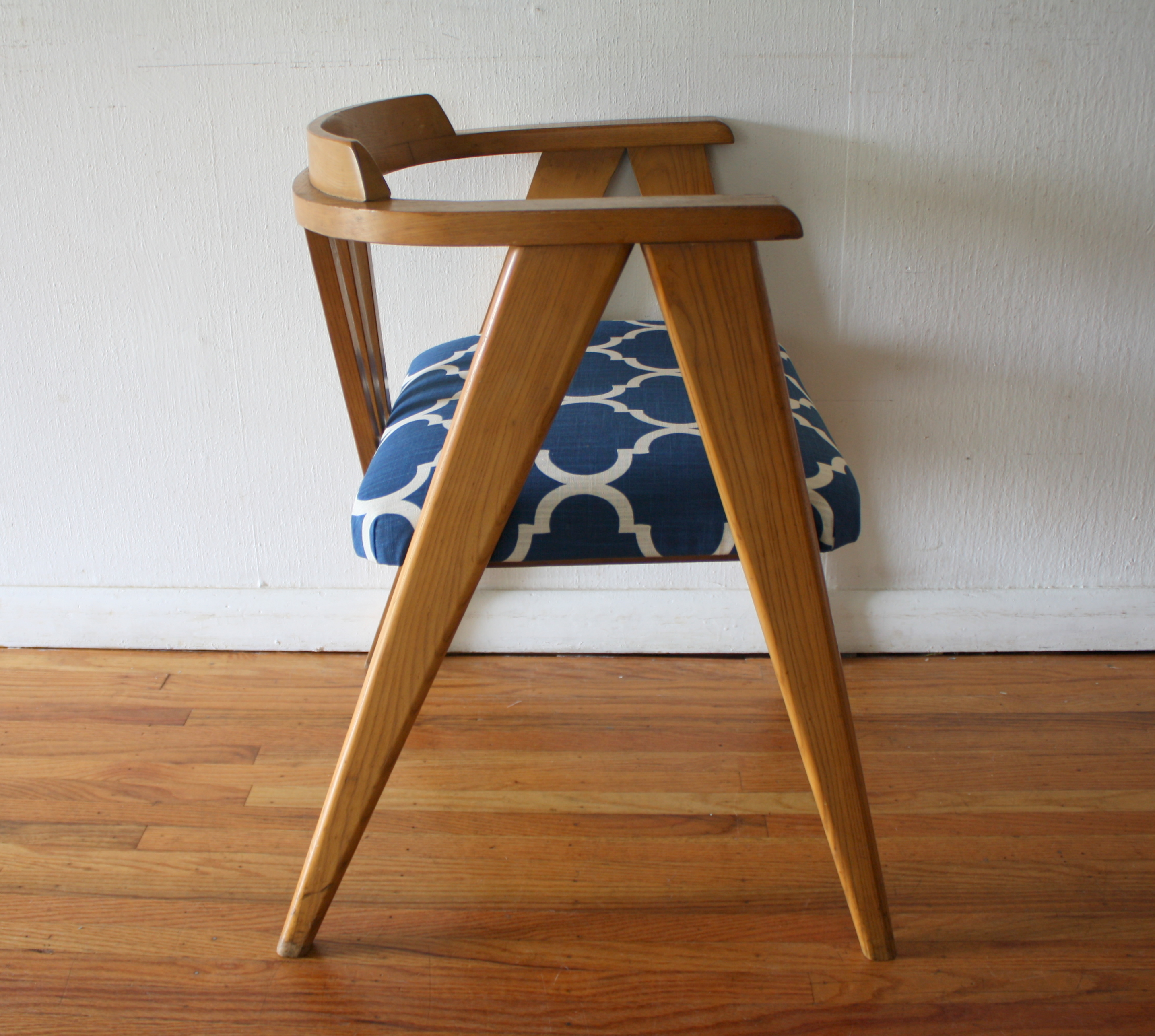 mcm blond angled chair with blue and white seat 1
