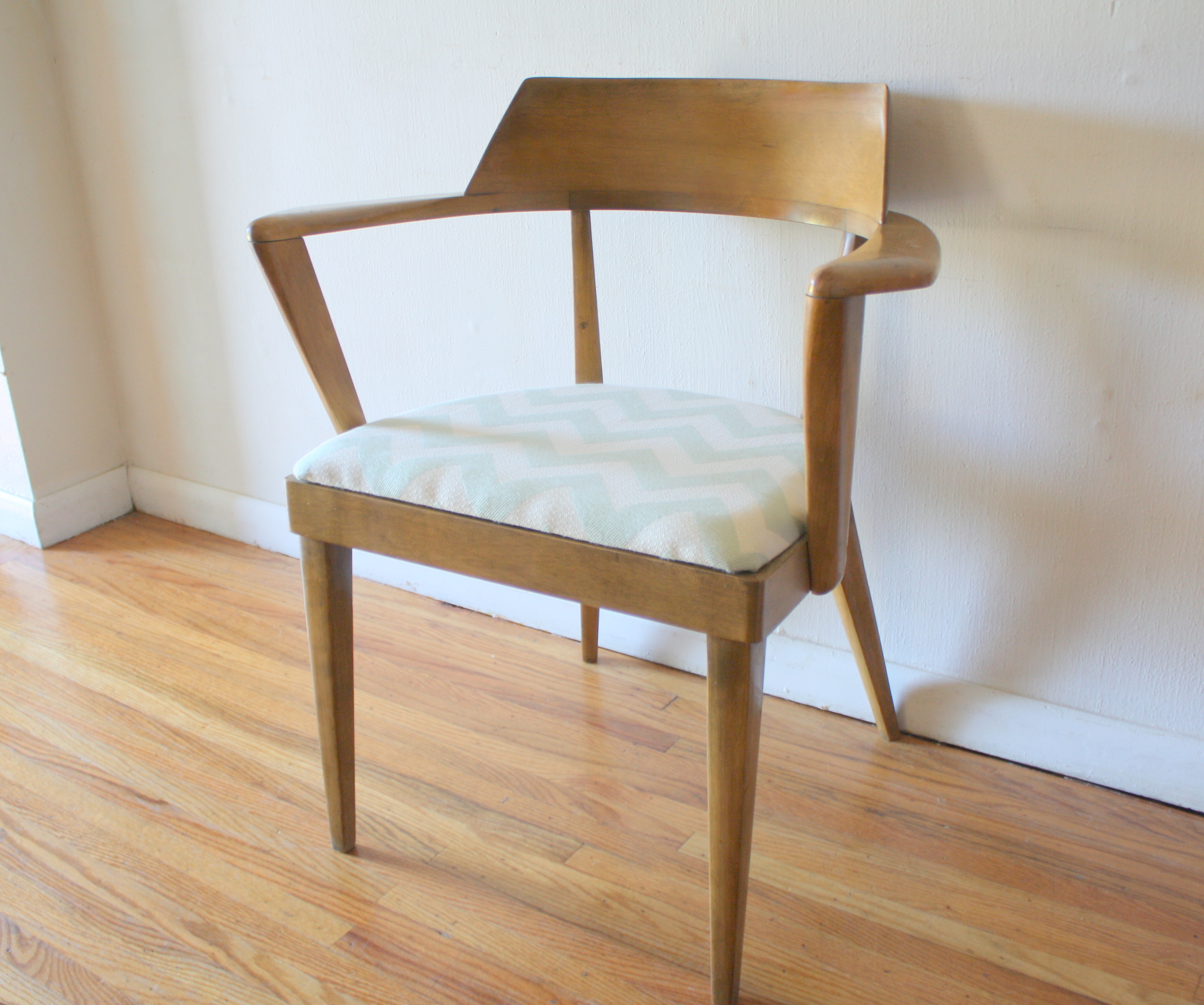 These are 3 mid century modern arm chairs recovered in new modern fabric.  The first chair recovered in blue and white fabric has a beautiful dramatic side profile with splayed legs.  The second is by Heywood Wakefield and is recovered in aqua and white chevron.  The third has an inlaid design in the chair back, angled arms, recovered in a modern gear pattern.