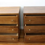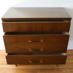 This is a selection of 3 styles of mid century modern bachelor mini dressers. The first has a parquet design, 3 dovetailed drawers with brass accented handles, and tapered legs: 32″W x 18″D x 32″H. The second is a pair of bachelor dressers, with 3 dovetailed drawers with brass knobs, and tapered legs: 29″W x 17″D x 27″H. The third is a pair of bachelor dressers by Baumritter, with 3 dovetailed drawers with brass knobs, and tapered brass tipped feet: 40″W x 17″D x 30.5″H.
