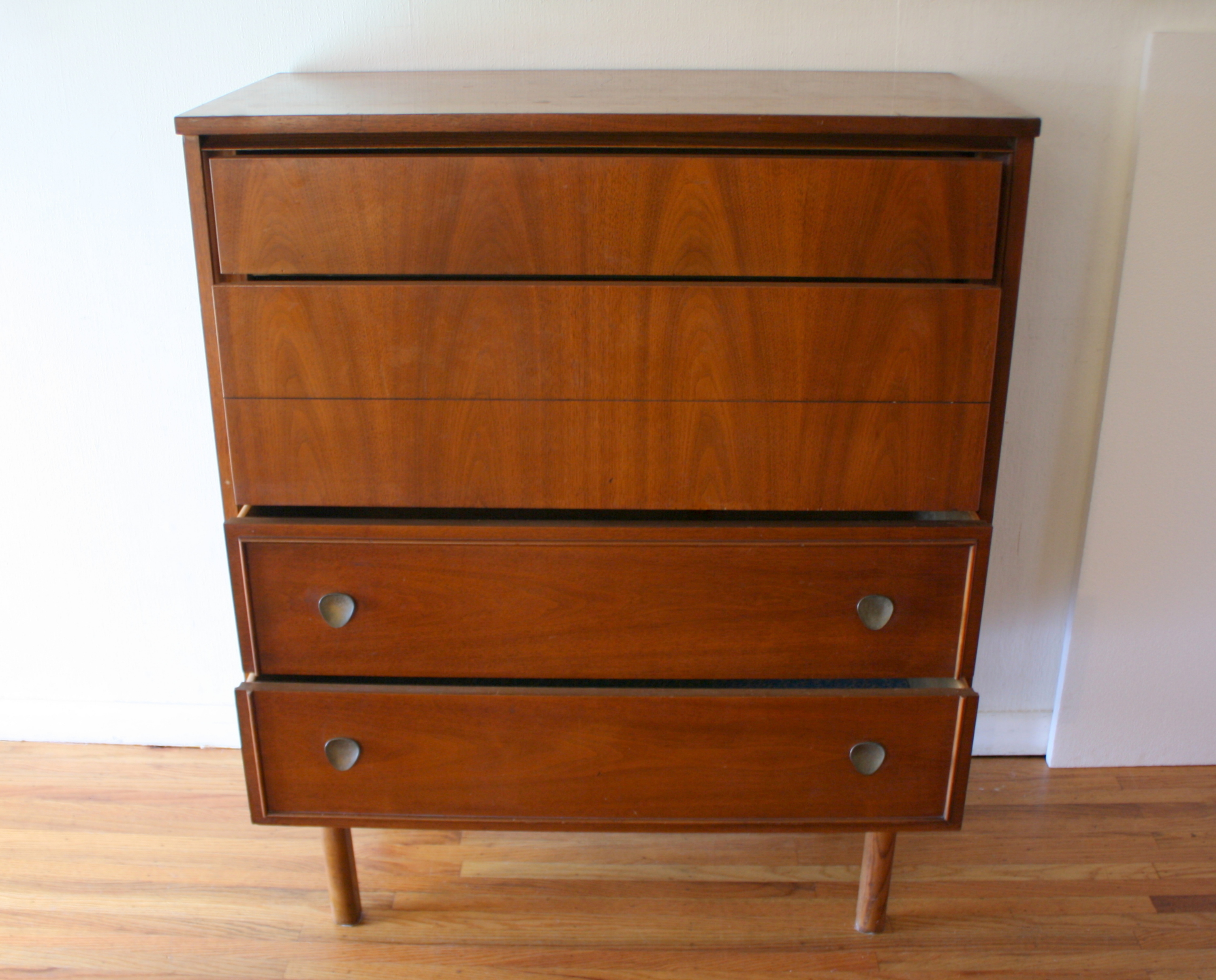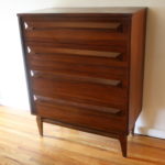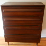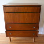 These are 2 mid century modern tall dressers. The first is a tall dresser by Coleman. It has 4 dovetailed drawers with angled solid wood drawer handles,and tapered legs: 36″W x 18″D x 45.5″H. The second dresser is by Dixie, has 4 dovetailed drawers with a streamlined drawer design, and brass pulls: 36″W x 18.5″D x 45″H.