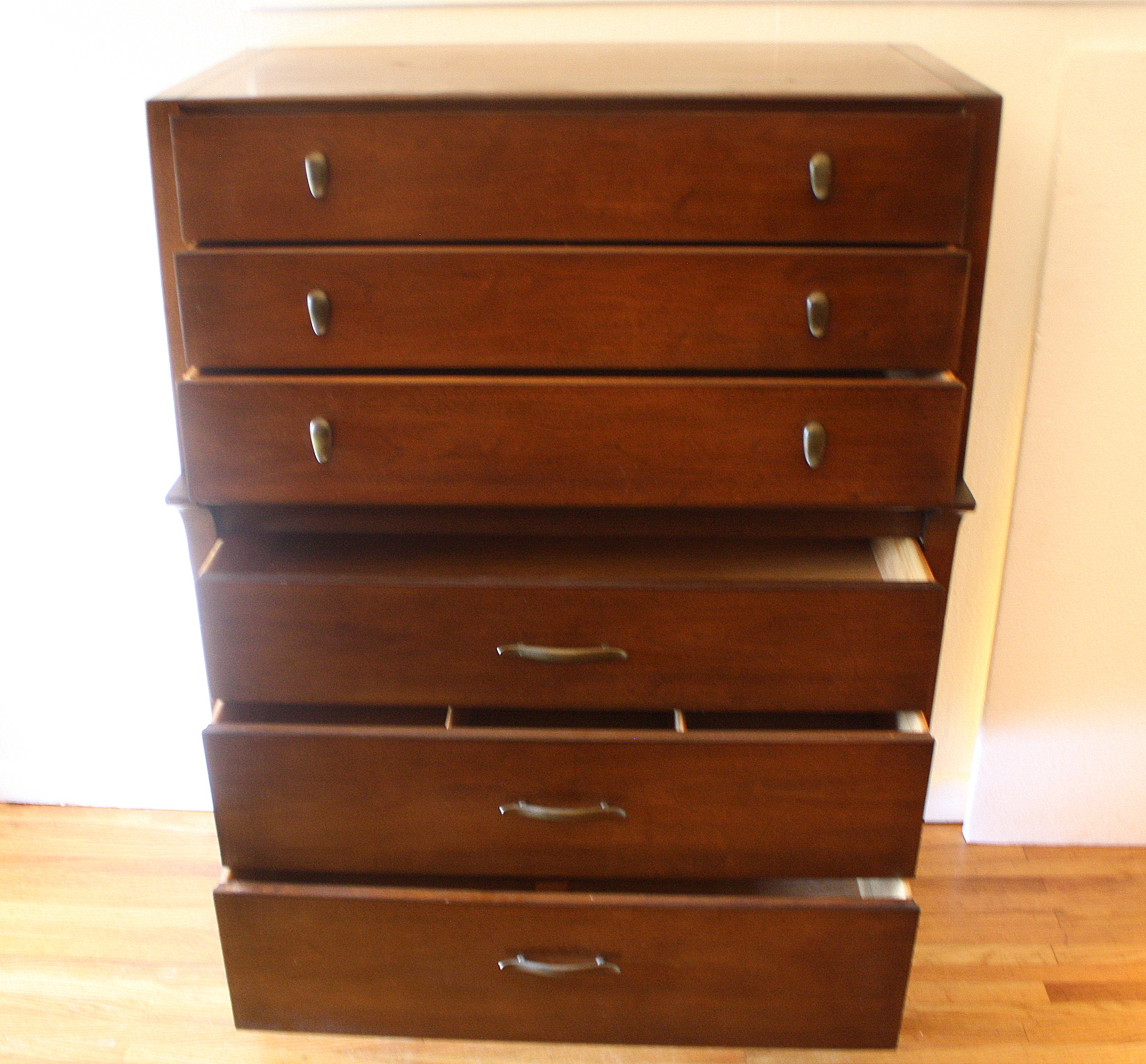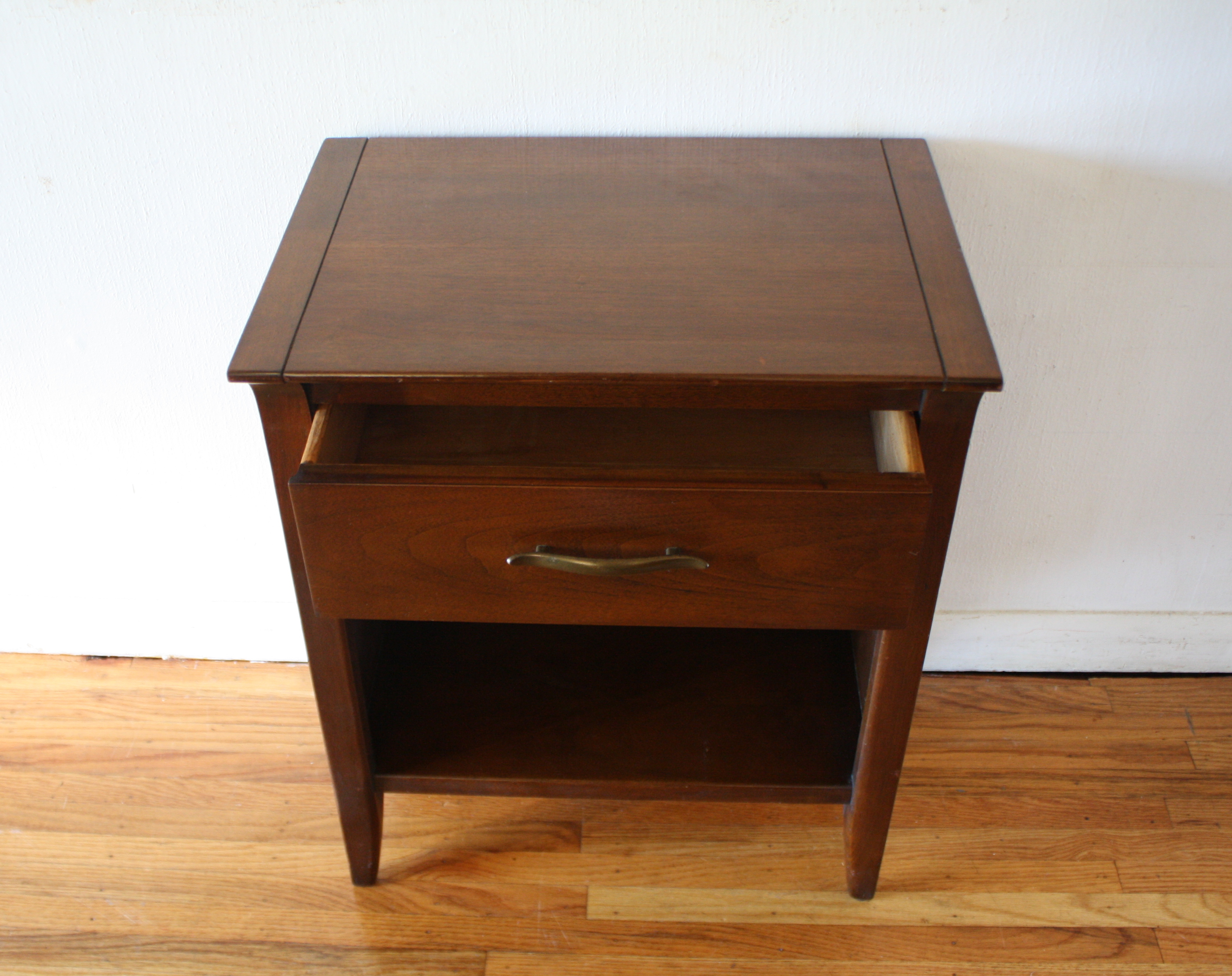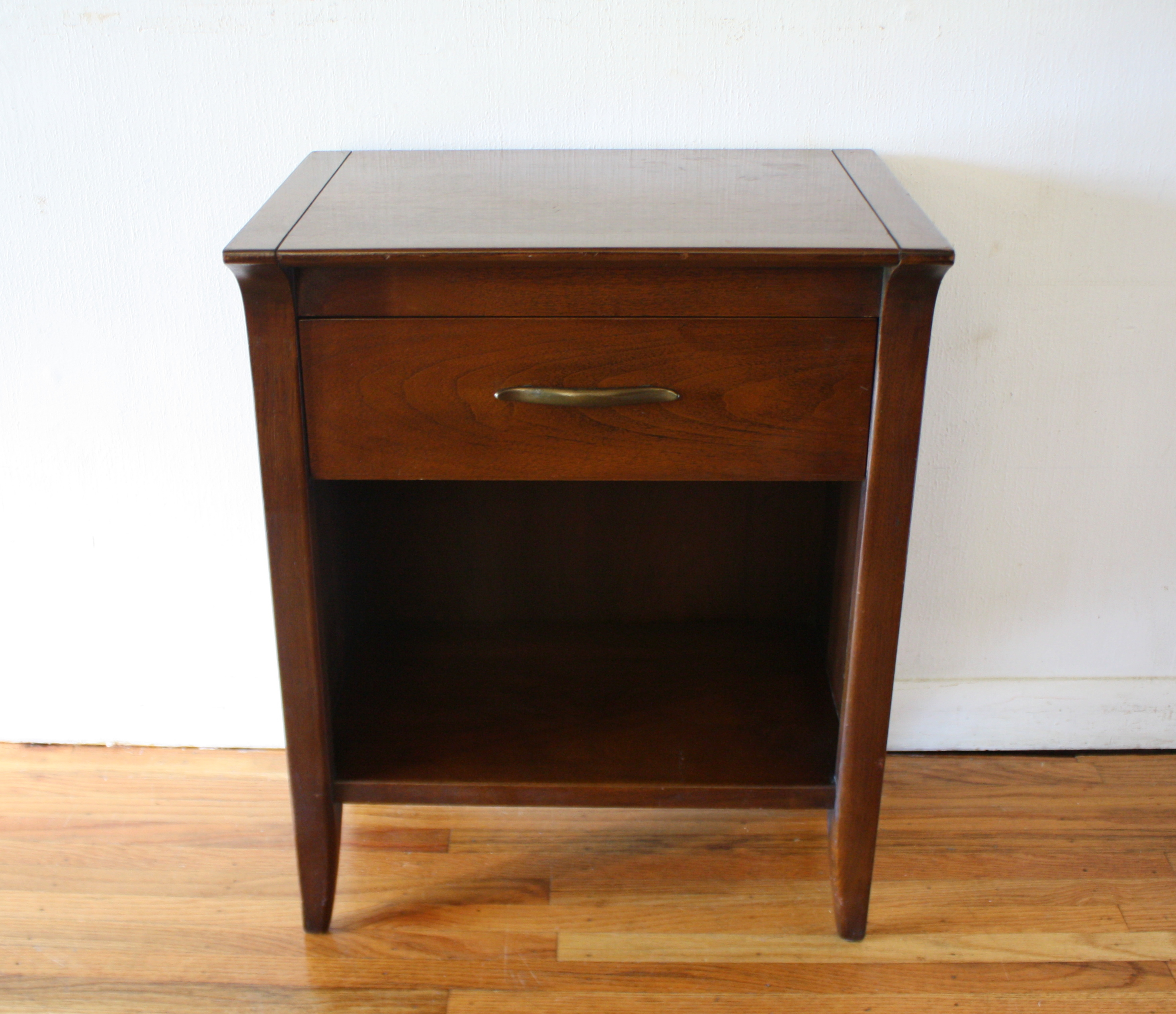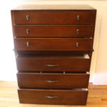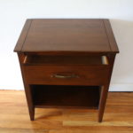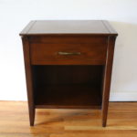 This is a mid century modern tall dresser and matching side end table nightstand by John Van Koert for Drexel’s Profile collection. Both have the signature angled design, sculpted handles and knobs. The dresser has 6 dovetailed drawers: 34″W x 17.5″D x 48″H. The matching nightstand has 1 dovetailed drawer and a bottom shelf: 20″W x 14″D x 25.5″H.