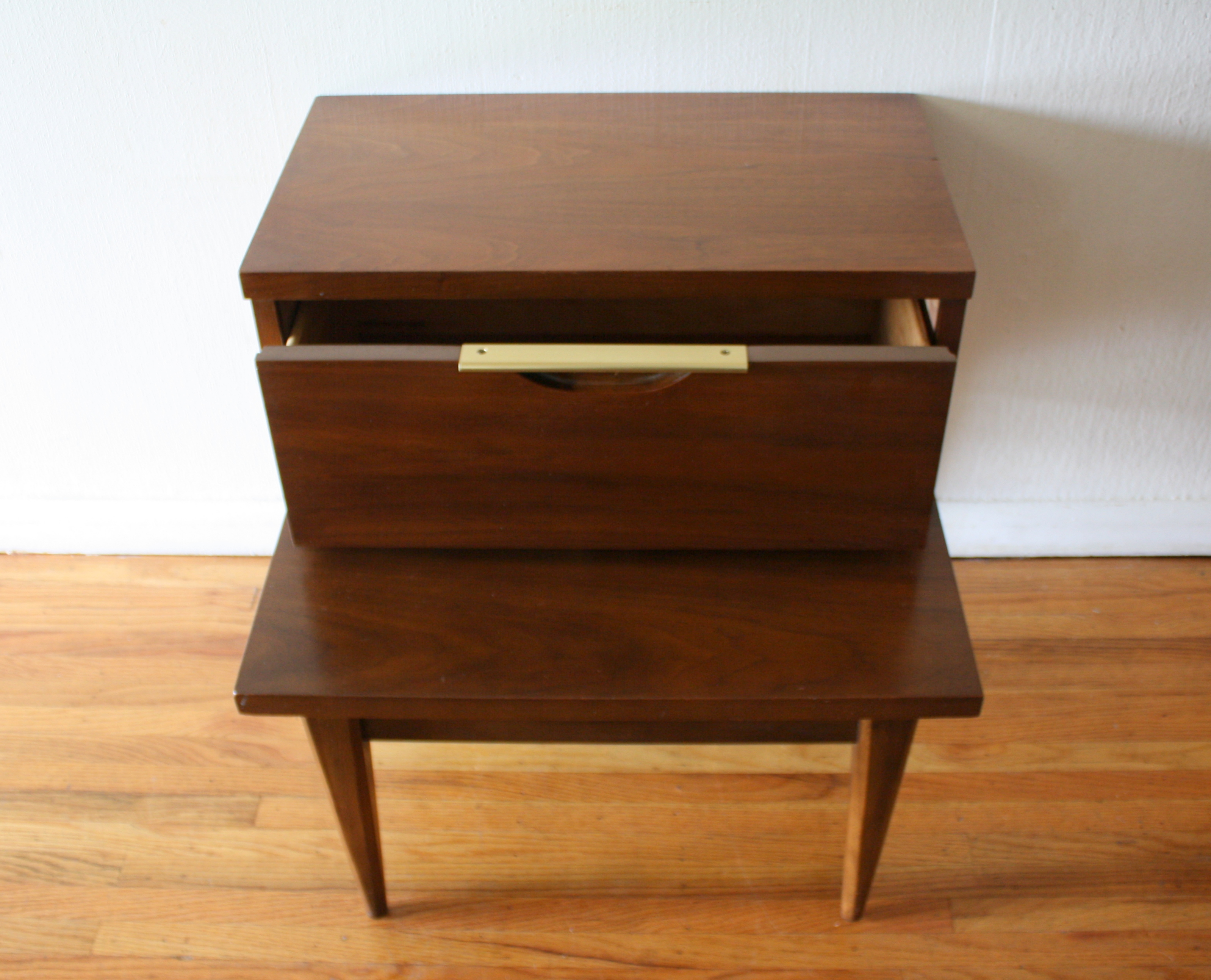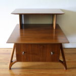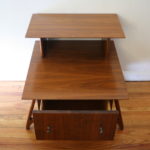 These are 2 mid century modern 2 tiered side end tables.  The first 2 tiered table is from the Kent Coffey Tableau collection.  It has 1 dovetailed drawer with a streamlined brass handle, and tapered legs: 23″W x 22″D x 24″H.  The second 2 tier table has a beautiful angled leg design and 1 dovetailed drawer: 22″W x 24″D x 22.5″H.