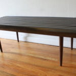 This is a mid century modern slatted coffee table bench.  It has an angled slatted design and tapered legs.  Perfect for a coffee table or bench.  Dimensions: 48″ W x 18″ D x 15″ Hmcm large slatted bench dark 2.jpg