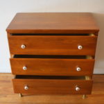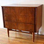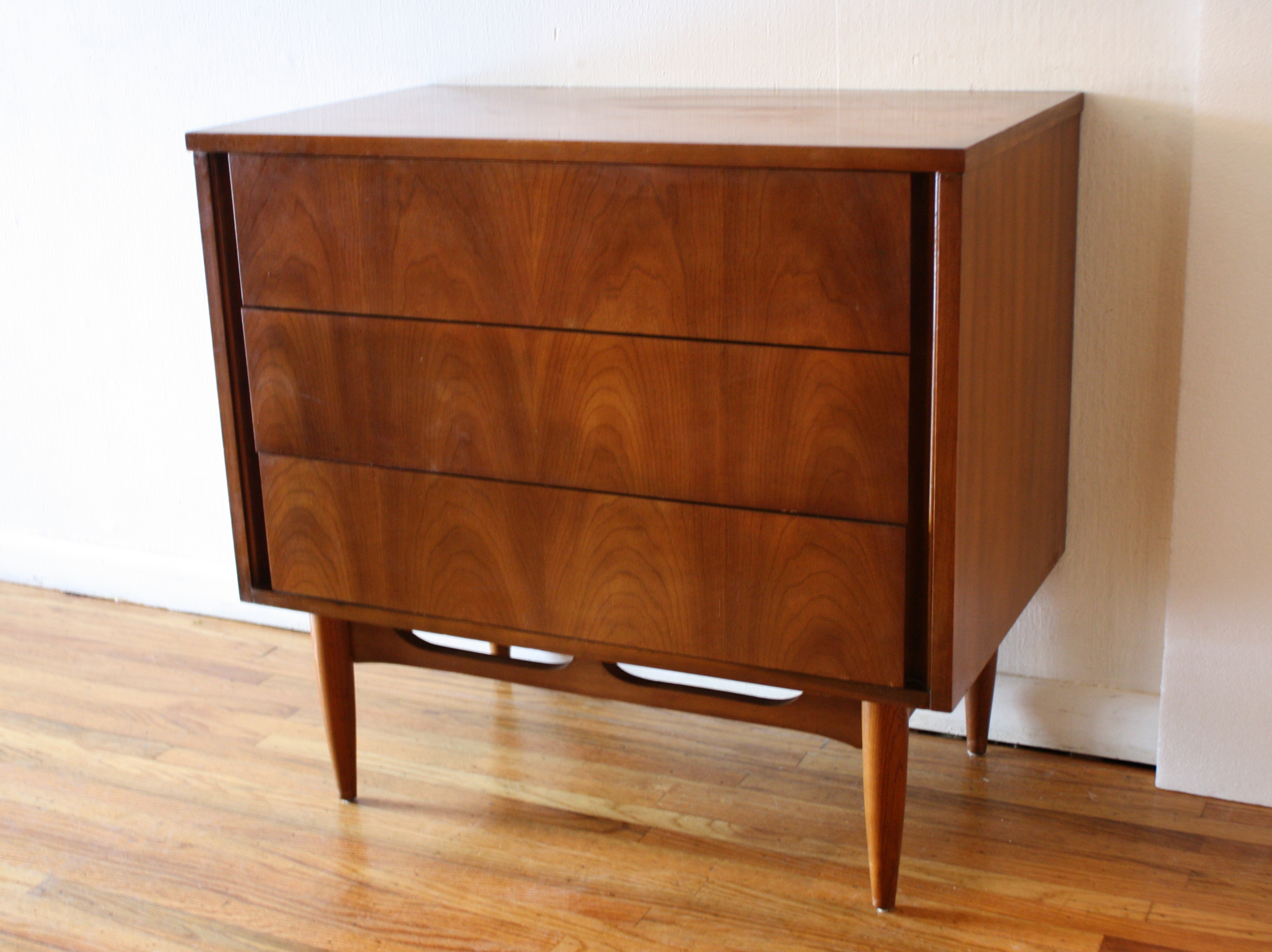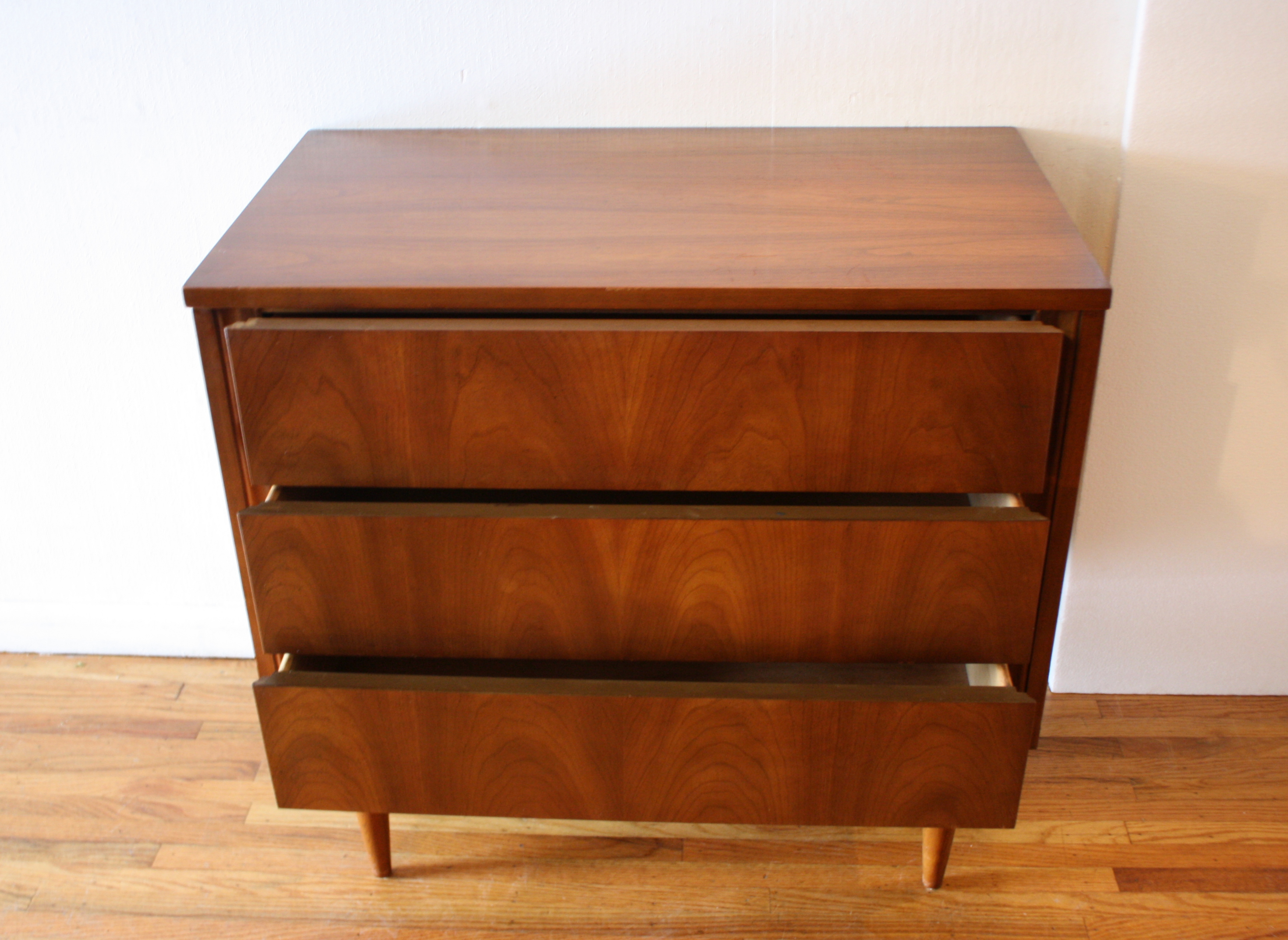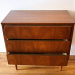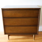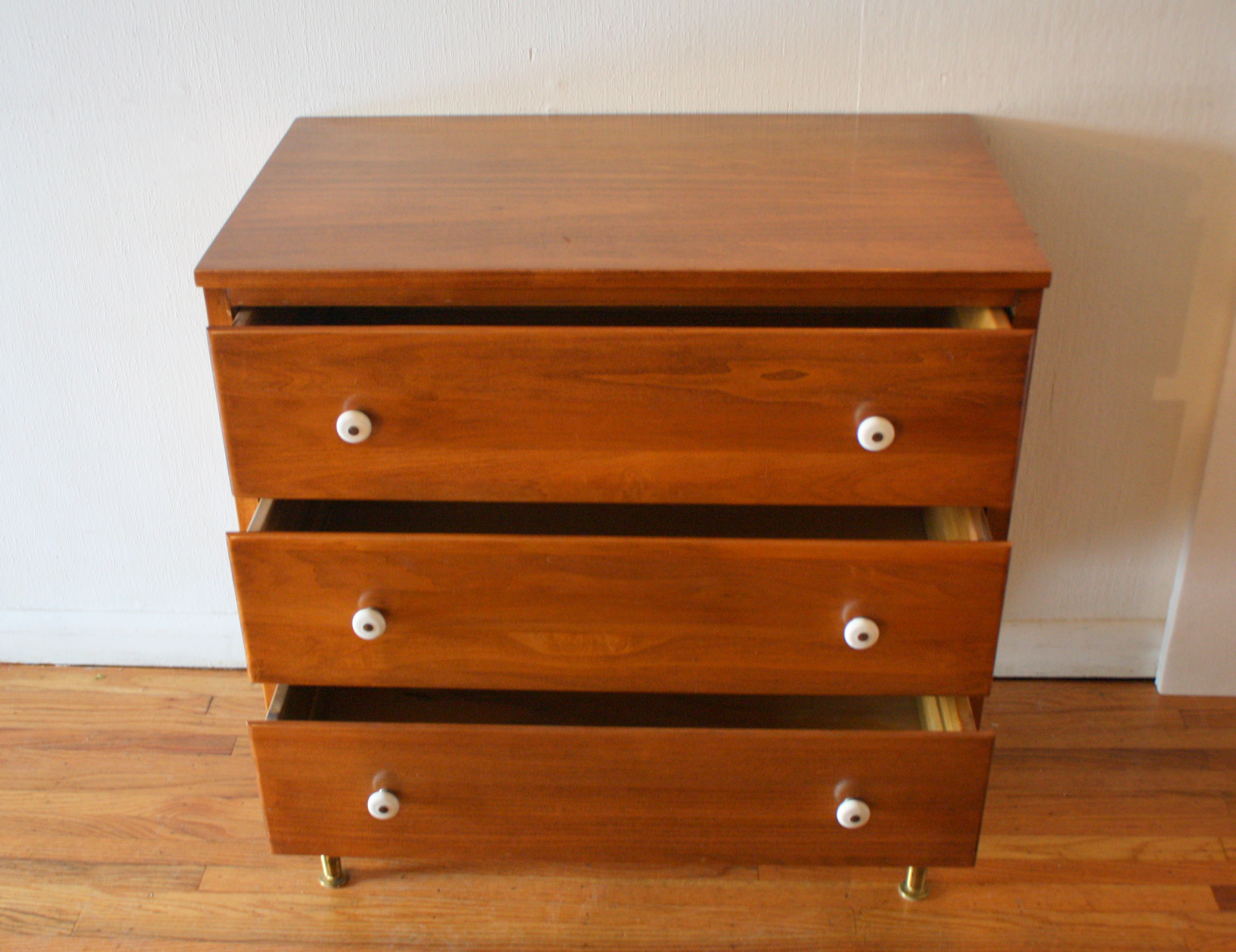 These are 3 mid century modern bachelor dressers.  The first has an arched base, 3 dovetailed drawers with a streamlined design and tapered legs: 32″W x 18″D x 30″H.  The second has 3 dovetailed drawers with mod white knobs and tapered brass tipped legs: 29″W x 17″D x 30″H.  The third 3 dovetailed drawers with a streamlined design and tapered legs: 32″W x 18″D x 31.5″H.