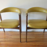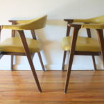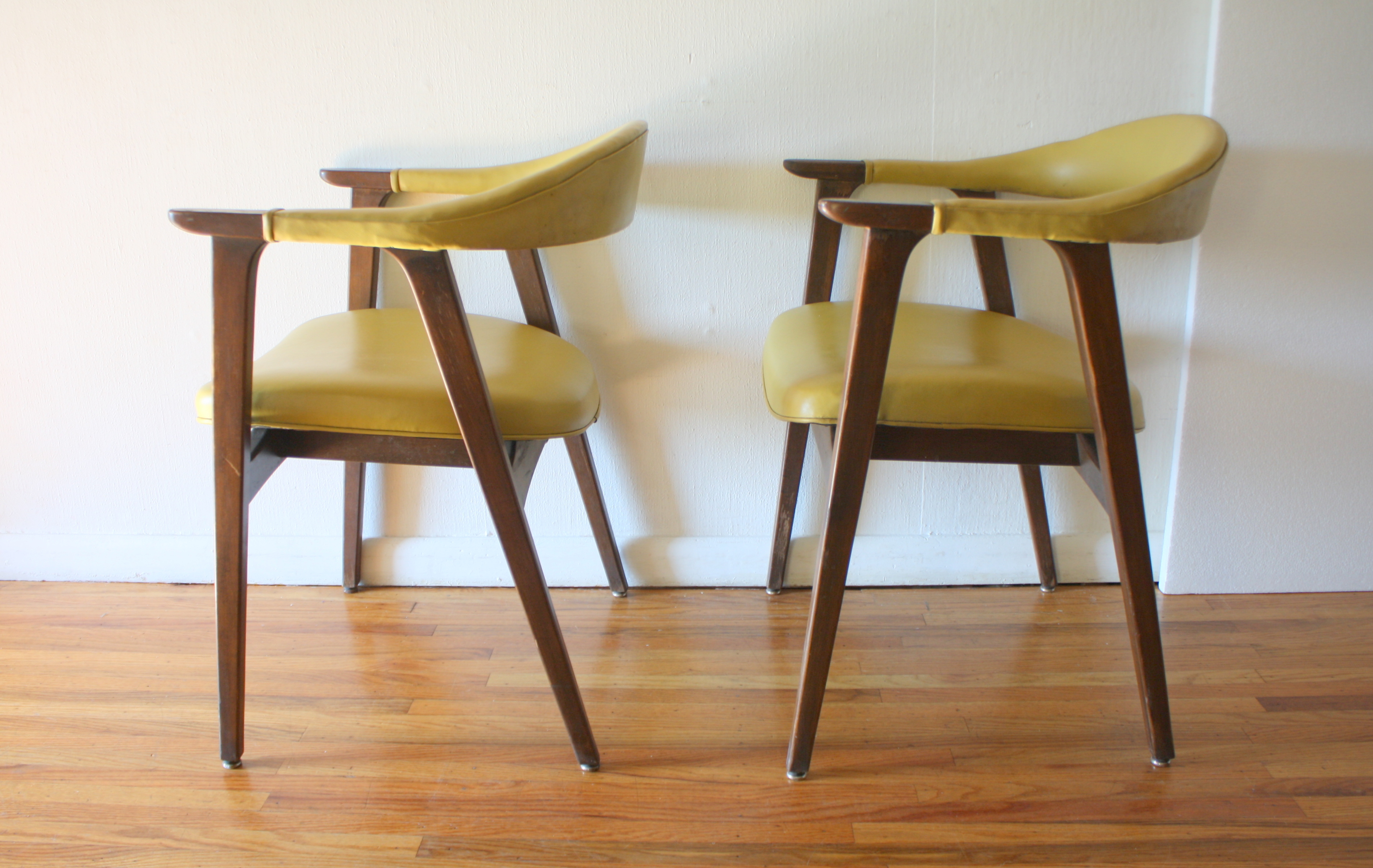 This is a pair of mid century modern chairs by Thonet.  The chairs have sculpted solid wood frames, and upholstered seats and backs in yellow naugahyde.  Dimensions: seat width: 18.5″, seat depth: 19″, seat height: 18″, back height: 30″.