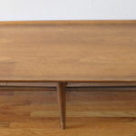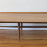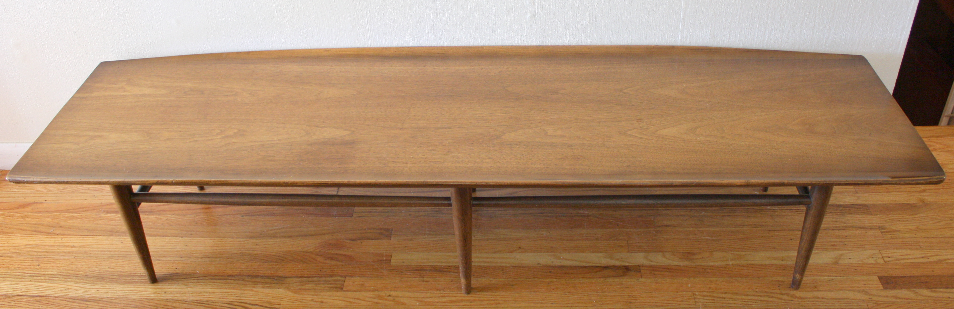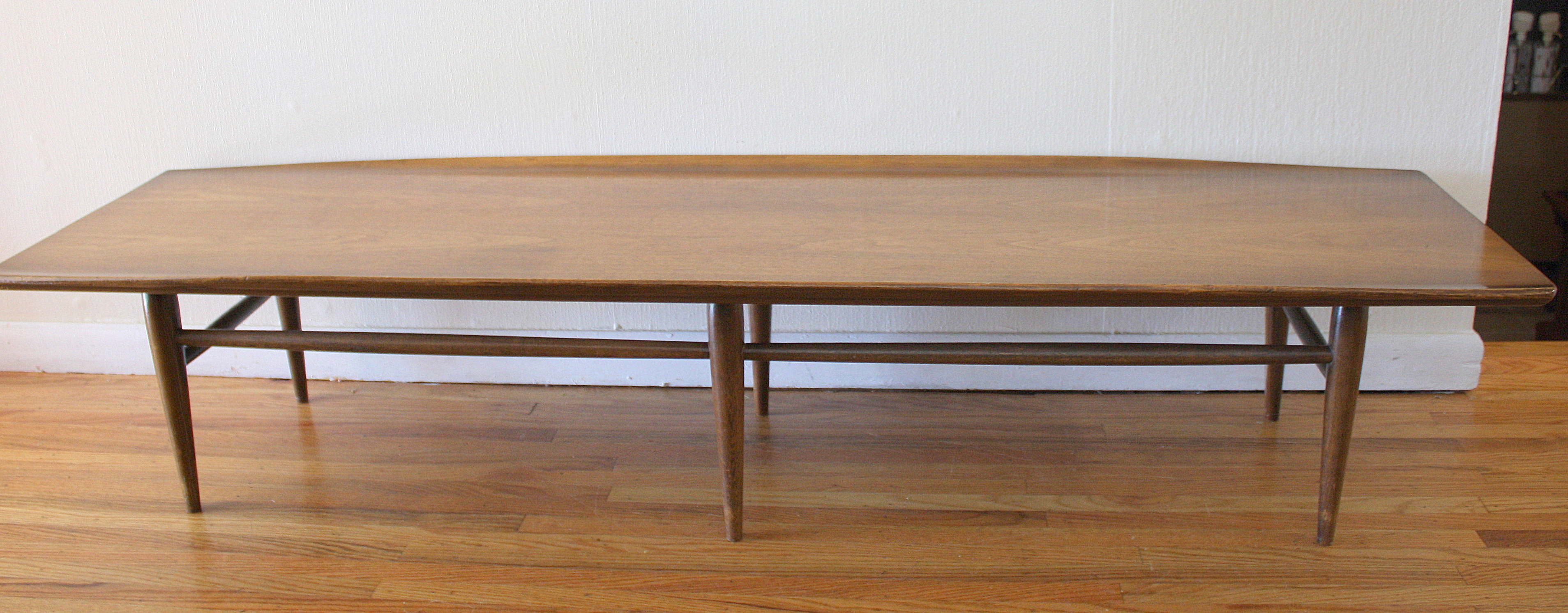 Mid Century Modern Coffee Table This is a mid century modern coffee table made with surfboard edges and slender tapered legs. Dimensions: 70″W x 19.5″D x 14″H. *SOLD*