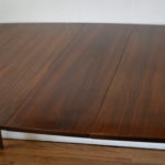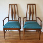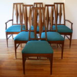 This is a mid century modern dining table from the Broyhill Brasilia collection with a set of 6 dining chairs: 4 side chairs and 2 arm captain chairs. The table has their signature sculpted legs, surfboard design, and 1 extension leaf that adds 12″ in width. Dimensions: 58″W (70″W with leaf) x 40″D x 29″H. The chairs have solid wood frames with sculpted tall backs and newly covered seats in teal tweed. Dimensions: seat width: 19.5″, seat depth: 15.5″, seat height: 19″, back height: 42″.