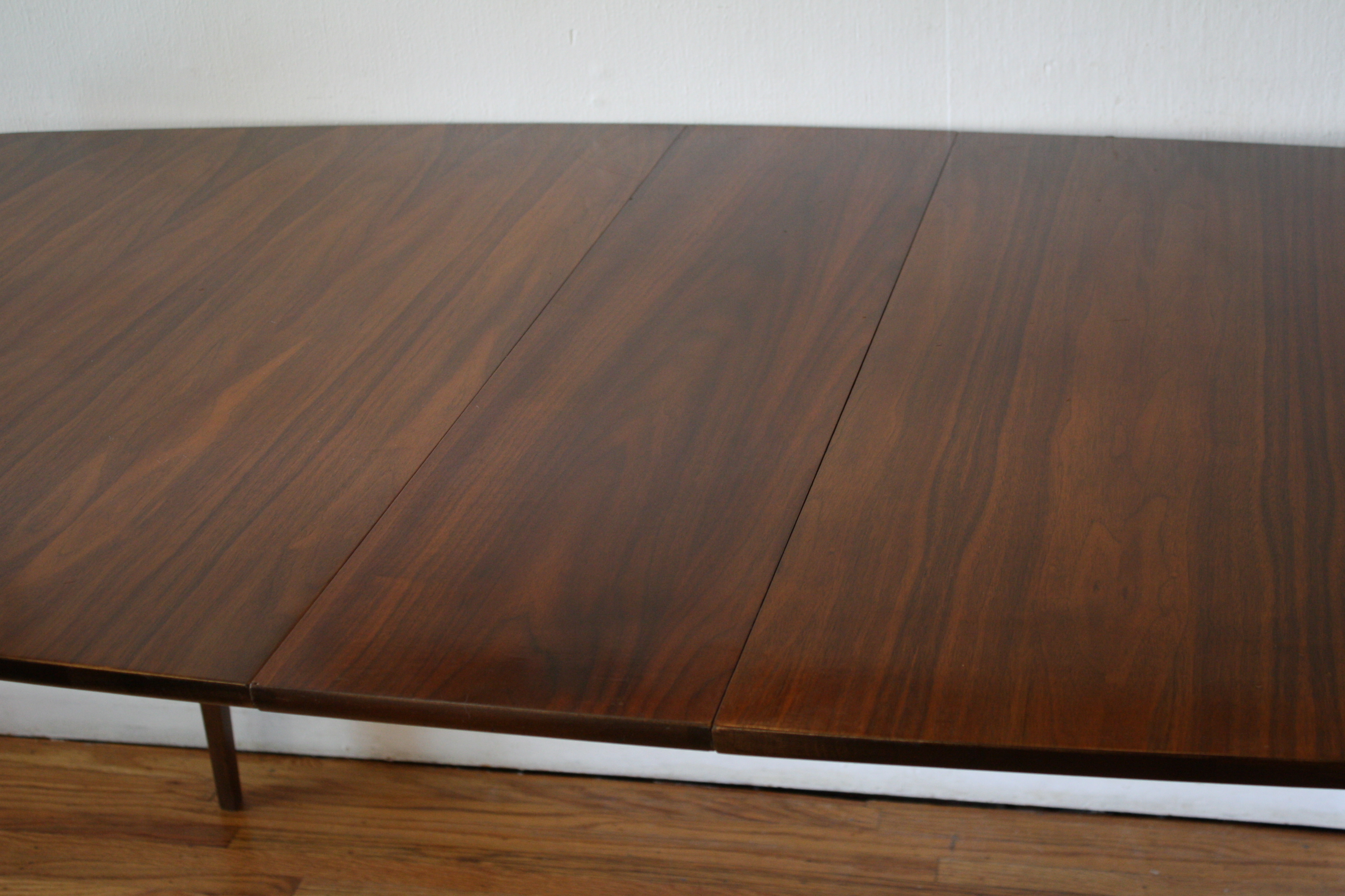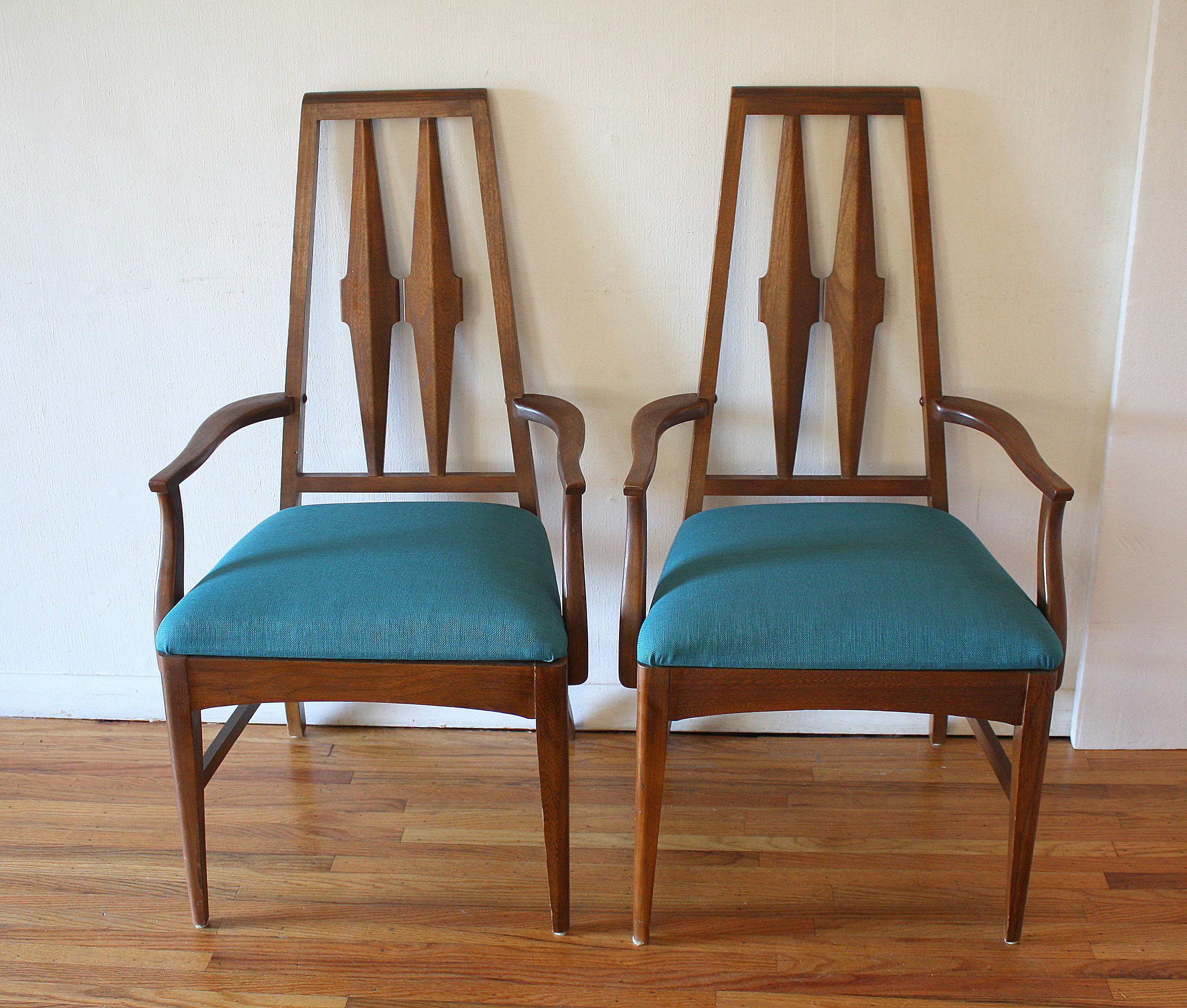 This is a mid century modern dining table from the Broyhill Brasilia collection with a set of 6 dining chairs: 4 side chairs and 2 arm captain chairs. The table has their signature sculpted legs, surfboard design, and 1 extension leaf that adds 12″ in width. Dimensions: 58″W (70″W with leaf) x 40″D x 29″H. The chairs have solid wood frames with sculpted tall backs and newly covered seats in teal tweed. Dimensions: seat width: 19.5″, seat depth: 15.5″, seat height: 19″, back height: 42″.