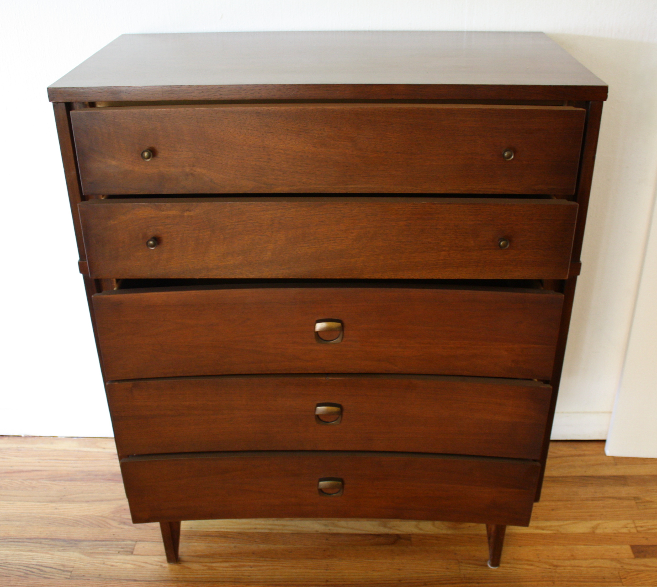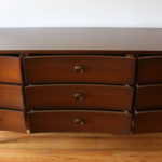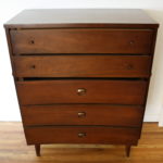 This is a matching set of mid century modern tall and low dressers by Johnson Carper. Both dressers have their signature concave design, and tapered legs. The tall dresser has 5 dovetailed drawers with brass knobs and pulls: 34″W x 18″D x 42″H. The low dresser has 9 dovetailed drawers with brass pulls: 64″W x 18″D x 30″H.