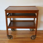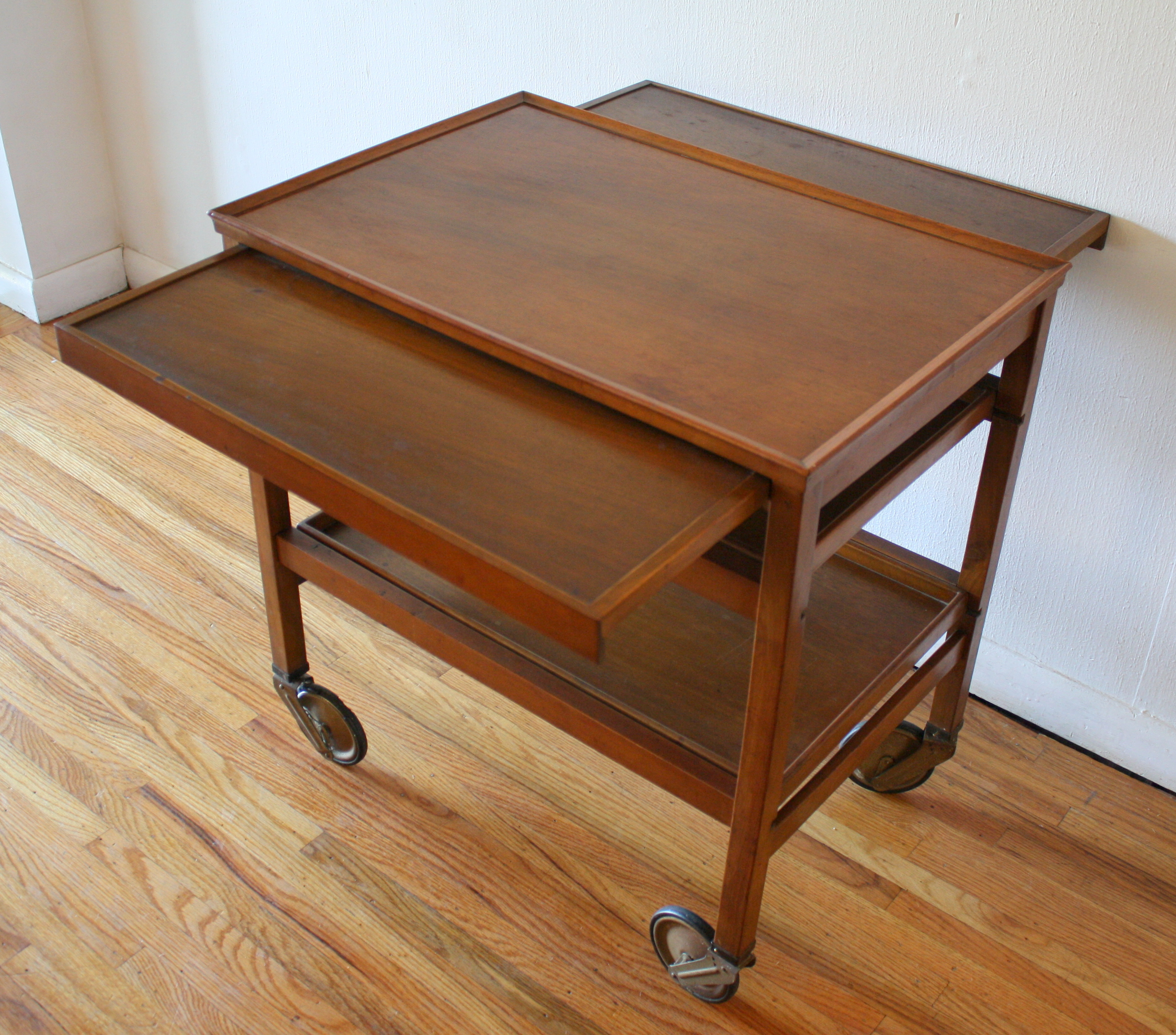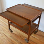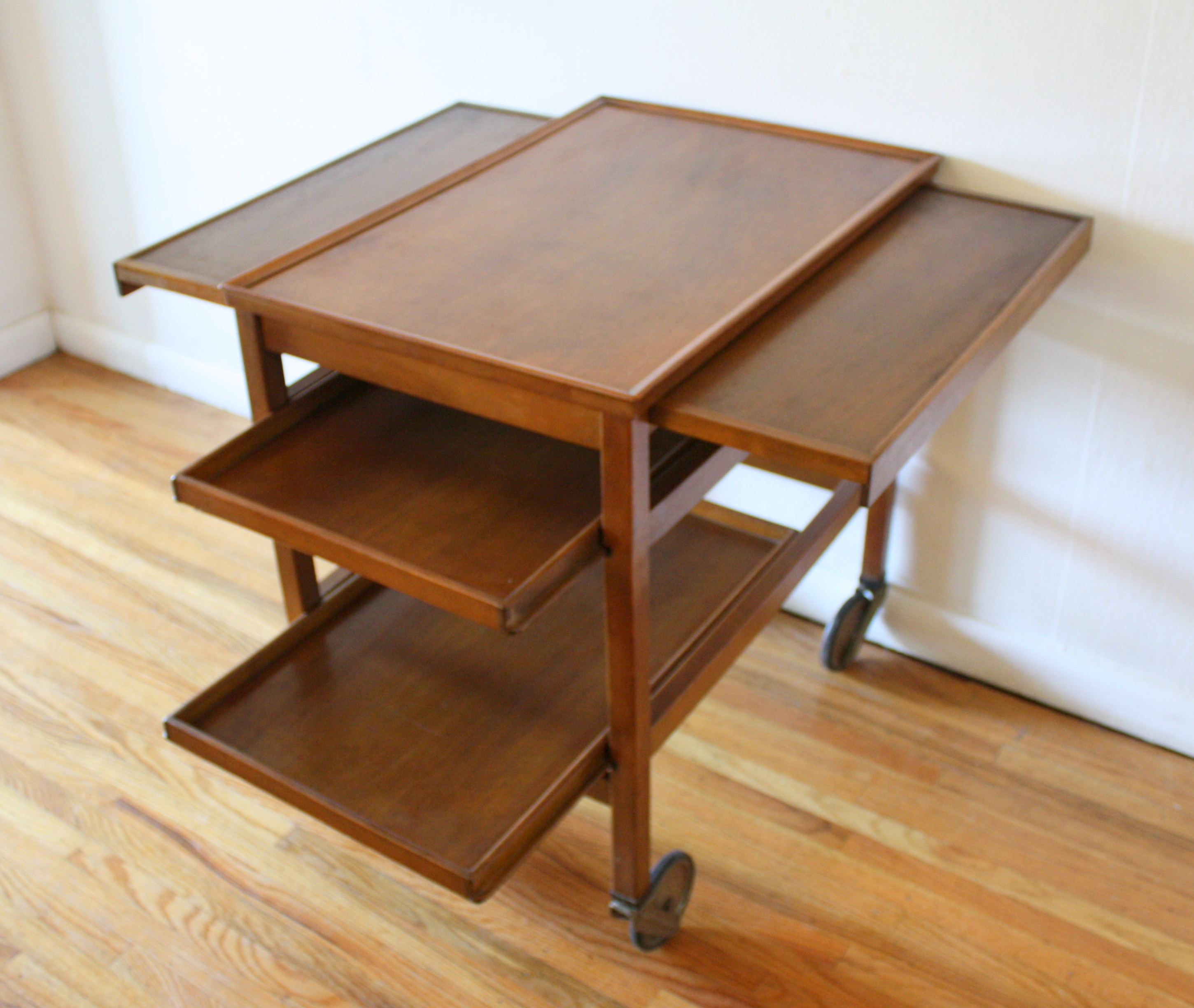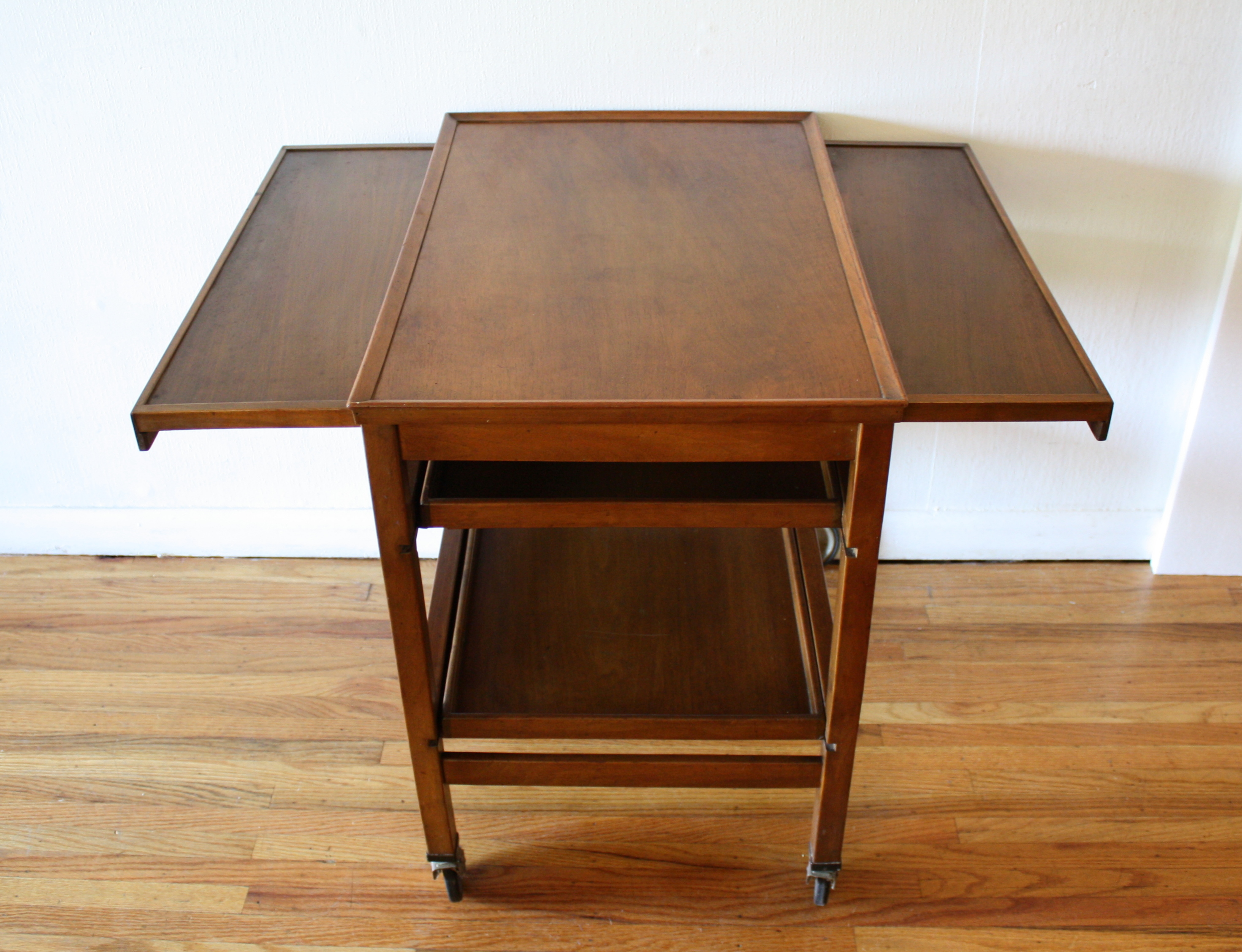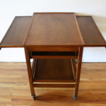 Mid Century Modern Bar Serving Cart This is a mid century modern rolling bar serving cart with 2 bottom removable serving trays. It also has 2 hidden extension leaves. Dimensions: 26.5″W x 17.5″D x 27.5″H. *SOLD*