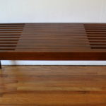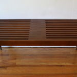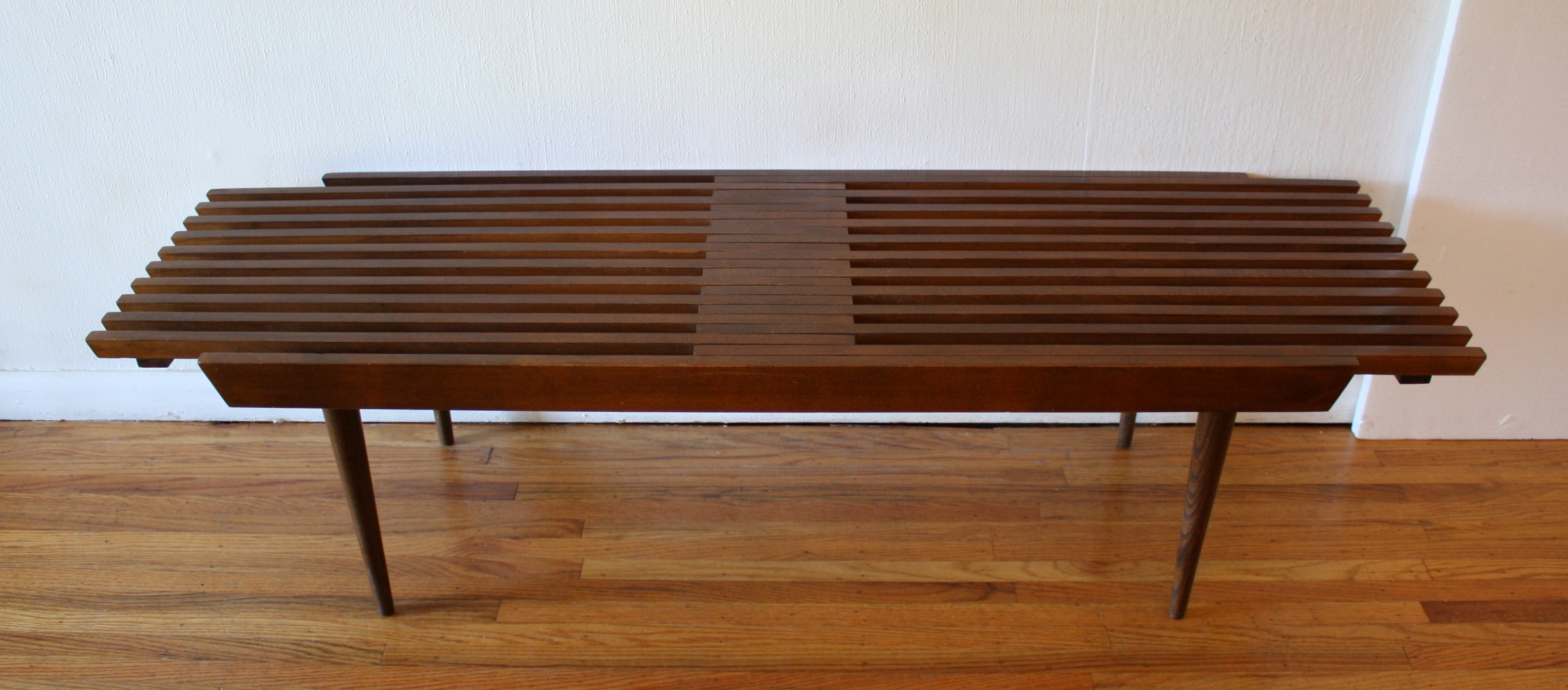 This is a mid century modern slatted coffee table bench with extending sides and tapered legs.  Dimensions: 48″W (59″W both sides extended) x 18″ D x 16″ H.