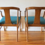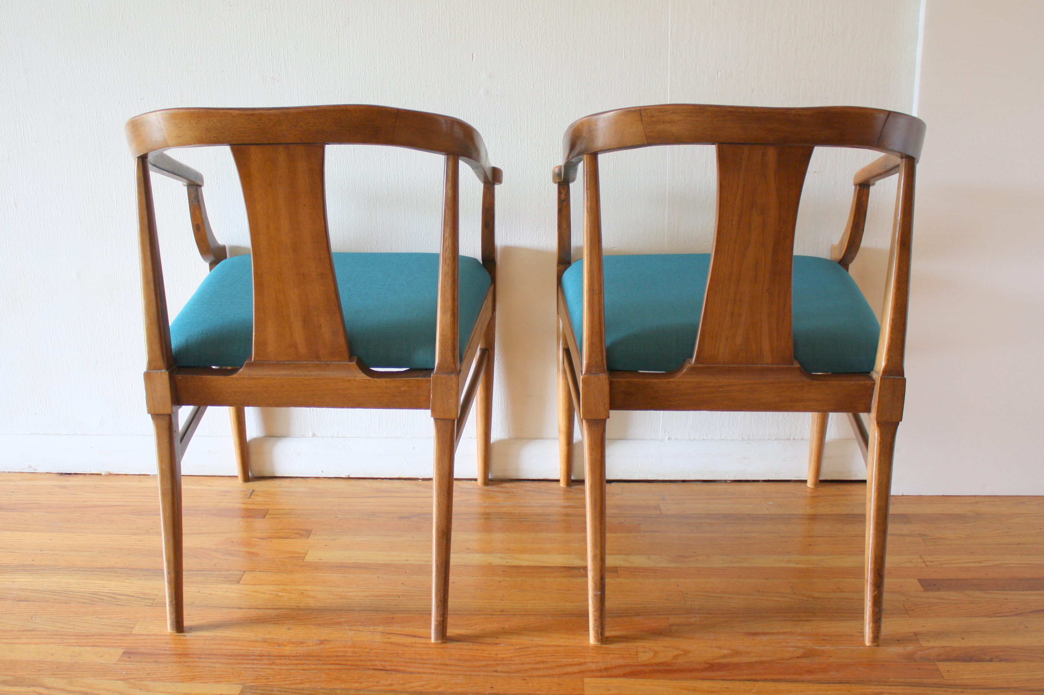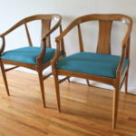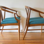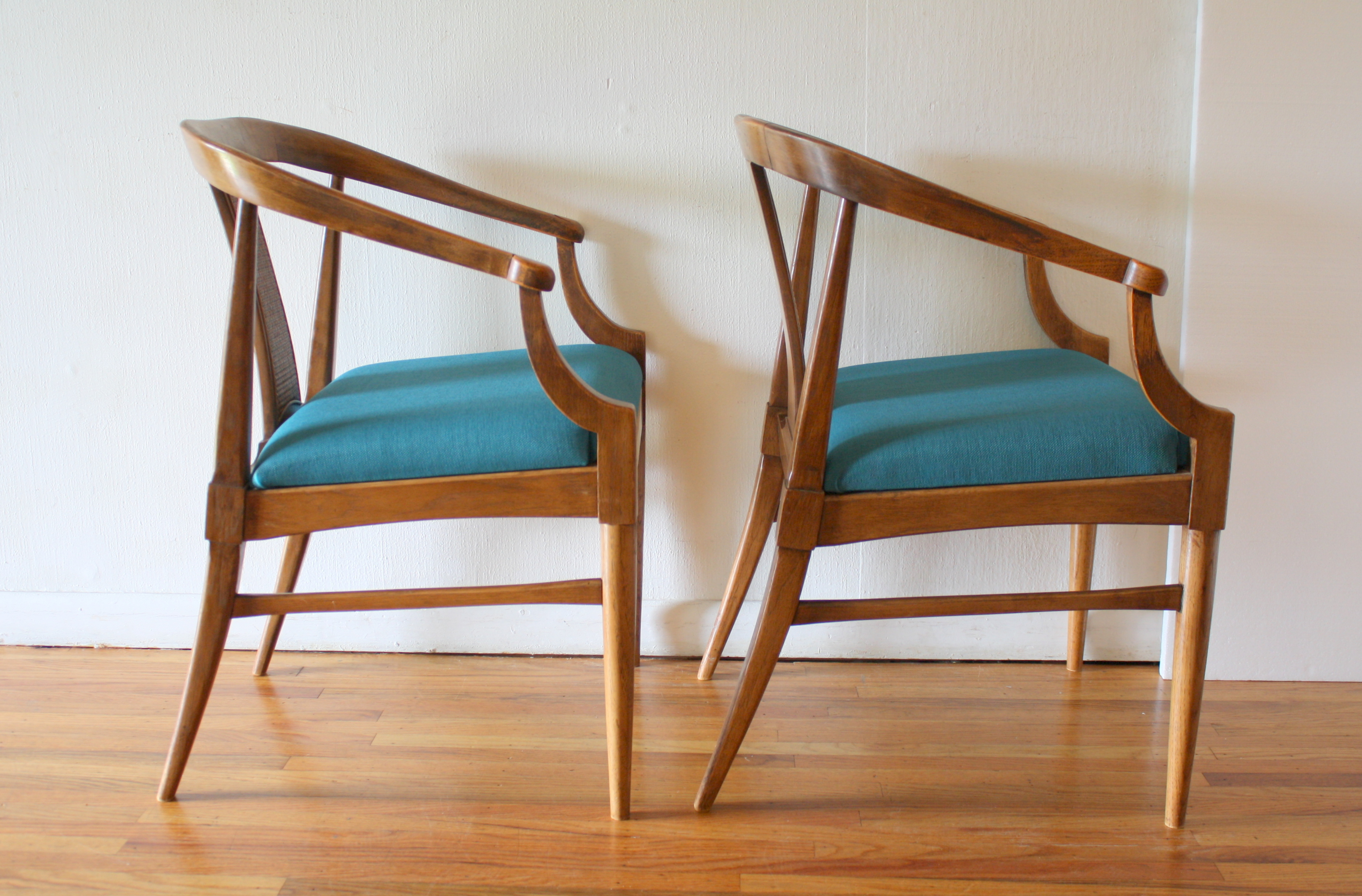 Mid Century Modern Pair of Arm Chairs This is a pair of mid century modern chairs with sculpted solid wood frames, beautiful rattan backs, and upholstered seats in new teal tweed. Dimensions: seat width: 19.5″, seat depth: 17″, seat height: 18.5″, back height: 31″. *SOLD*
