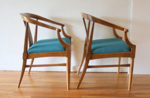 mcm pair of rattan arm chairs with teal tweed 3