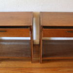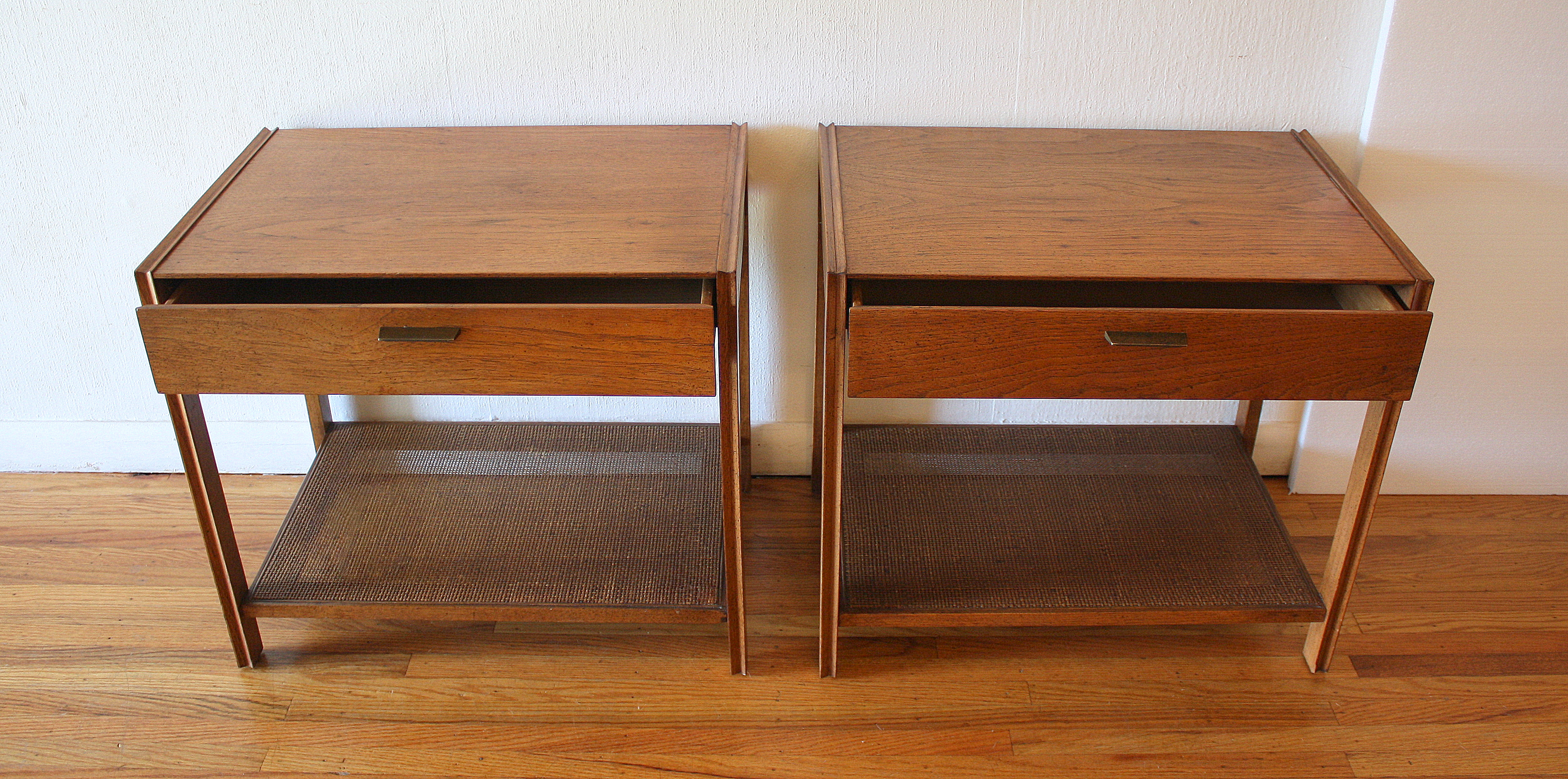 Mid Century Modern Pair of Side End Table Nightstands This is a pair of mid century modern side end table nightstands. Each one has 1 dovetailed drawer with a brass pull, and a rattan bottom shelf: 24″W x 16″D x 21″H. *SOLD*