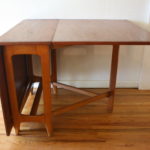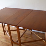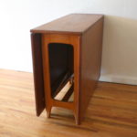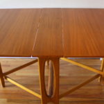 These are 2 mid century modern teak dining tables with a gateleg design. Each leaf can be folded down or extended as needed. The first is a Norwegian teak dining table with a beautiful arched base. Marked made in Norway. Dimensions: leaves folded down: 13.5″W x 35″D x 29″H, both leaves extended: 64″W x 35″D x 29″H. The second is a Danish teak dining table and has a beautiful (wider) arched base. Dimensions: leaves folded down: 13.5″W x 35″D x 29″H, both leaves extended: 64″W x 35″D x 29″H.