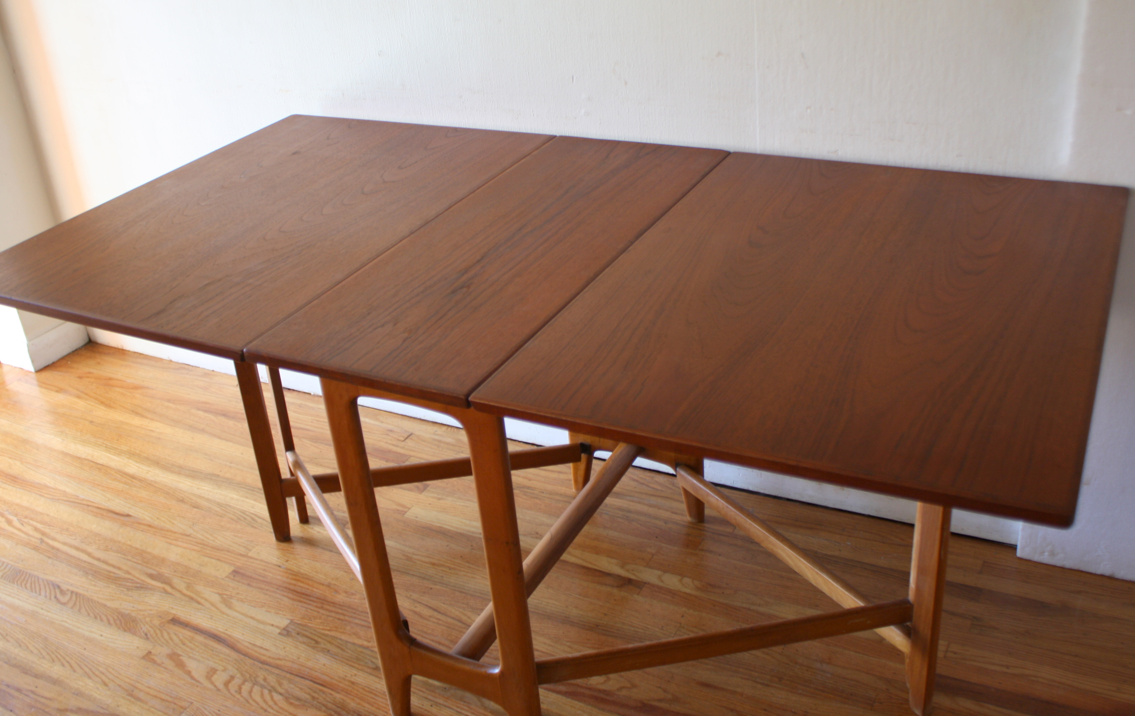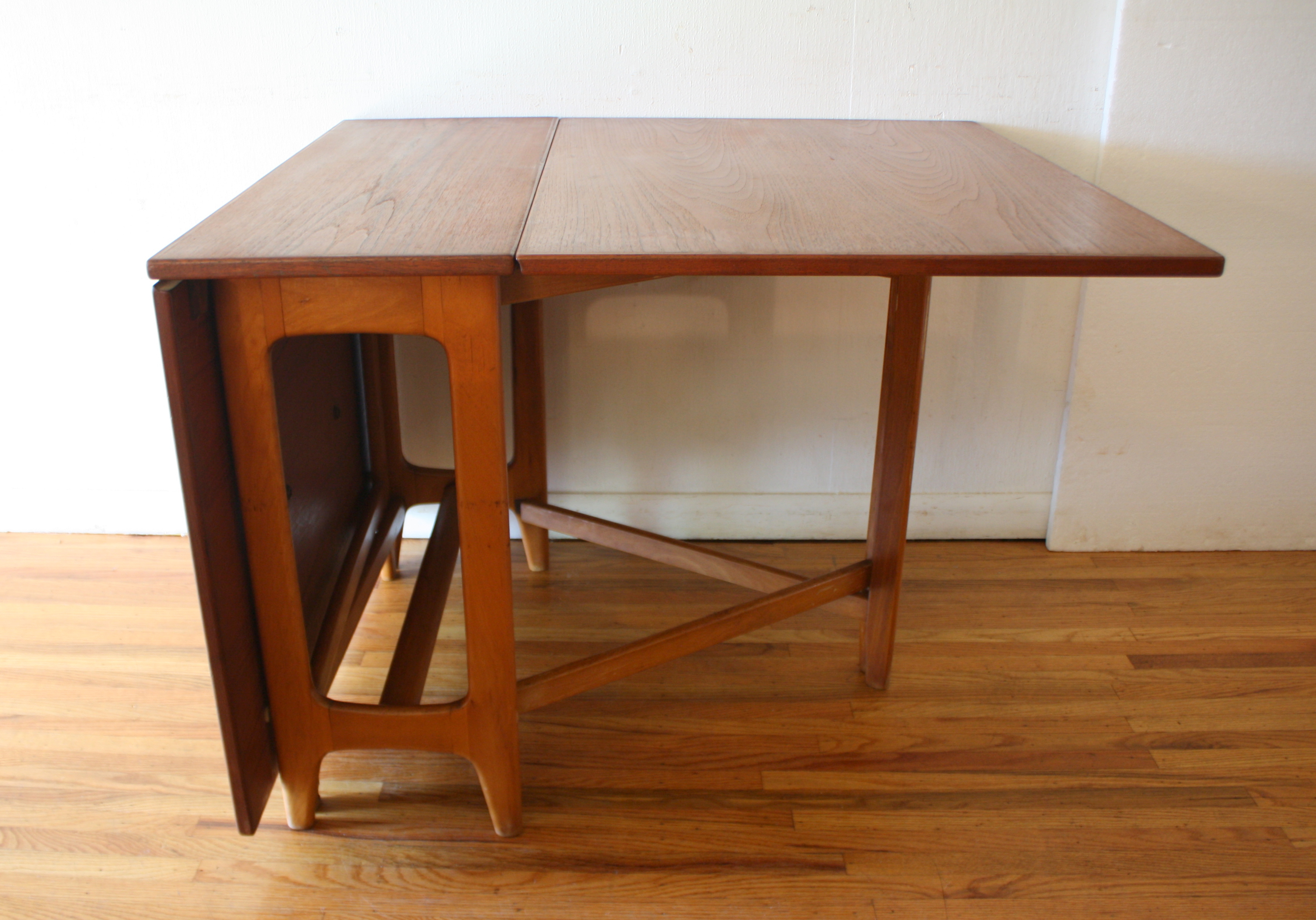 These are 2 mid century modern teak dining tables with a gateleg design. Each leaf can be folded down or extended as needed. The first is a Norwegian teak dining table with a beautiful arched base. Marked made in Norway. Dimensions: leaves folded down: 13.5″W x 35″D x 29″H, both leaves extended: 64″W x 35″D x 29″H. The second is a Danish teak dining table and has a beautiful (wider) arched base. Dimensions: leaves folded down: 13.5″W x 35″D x 29″H, both leaves extended: 64″W x 35″D x 29″H.