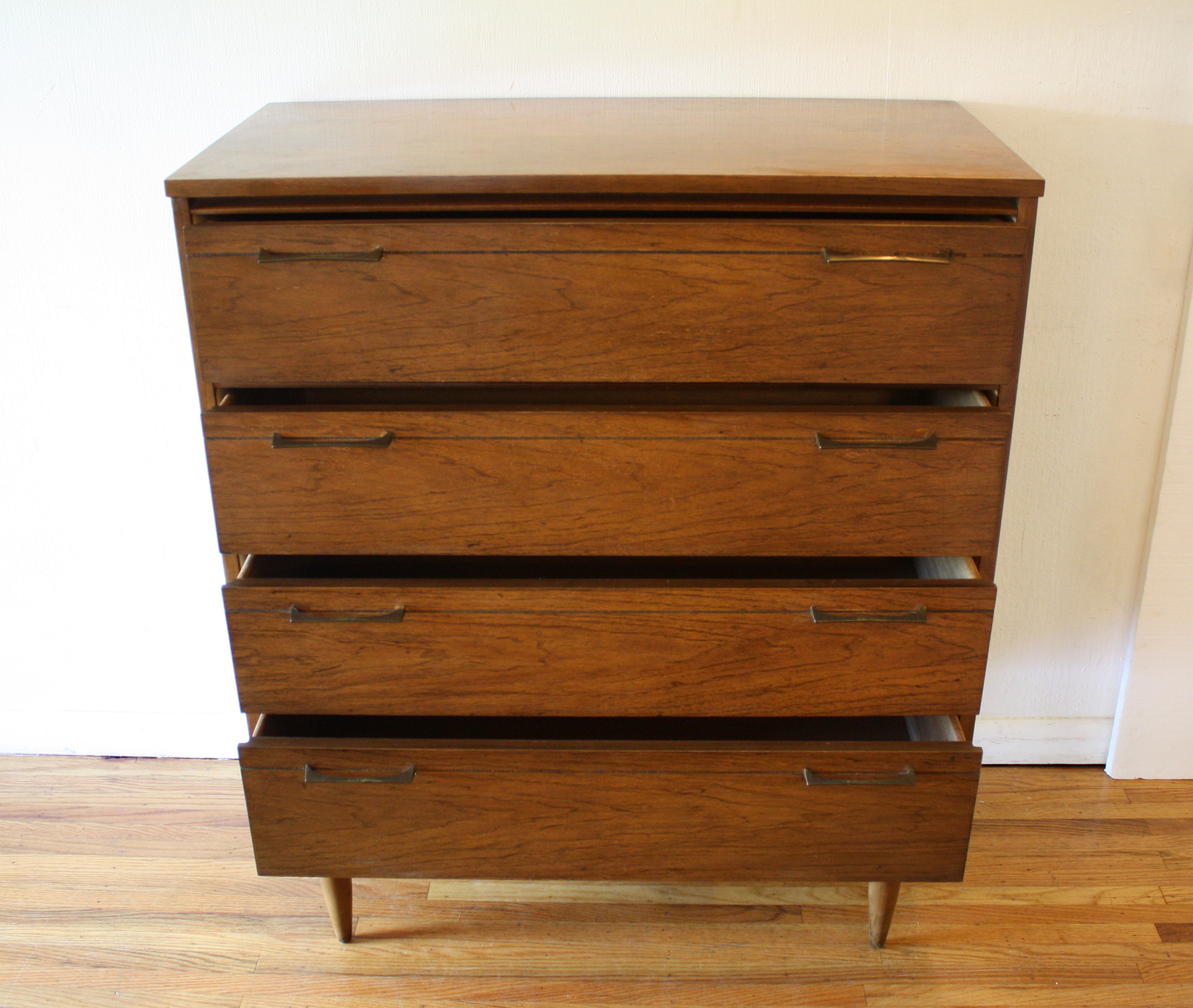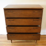 This is a mid century modern tall dresser with 4 dovetailed drawers with sculpted brass handles, and tapered legs: 36″W x 18″D x 42″H.