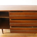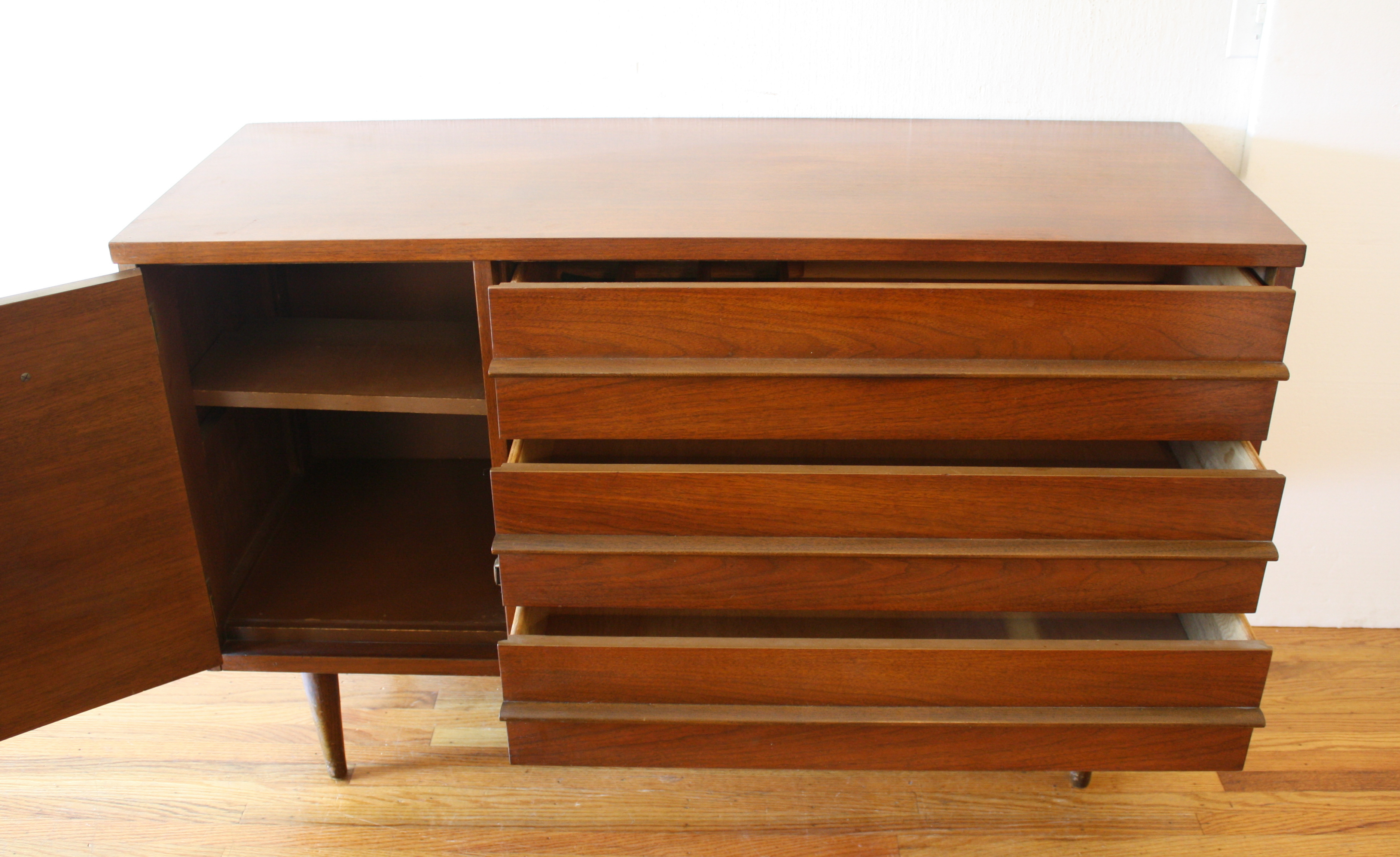 These are 2 mid century modern credenzas. The first credenza is by Bassett. It has 3 dovetailed drawers with a streamlined design, a left side cabinet with a shelf, and tapered legs. Dimensions: 48″W x 18″D x 30″H. The second is from the Broyhill Emphasis collection with their signature sculpted legs, handles and doors. It has an asymmetrical design with left side cabinet and shelf: 54″W x 19″D x 31″H.