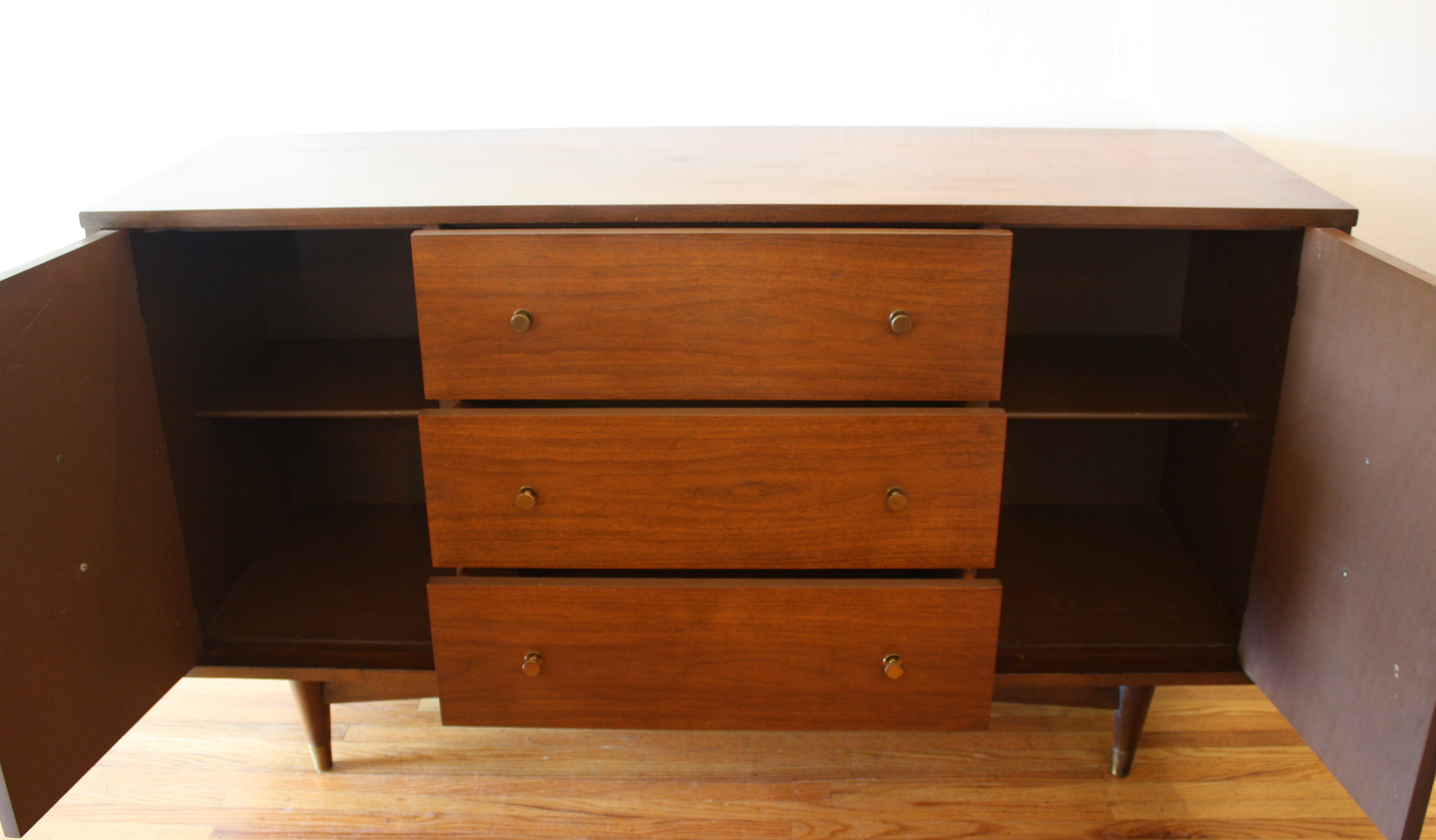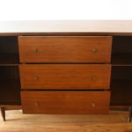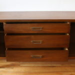 These are 2 mid century modern credenzas with dual side cabinets. The first credenza has fluid brass drawer pulls on its cabinets and 3 dovetailed drawers with brass knobs, and brass tipped tapered legs: 58″W x 19″D x 32.5″H. The second credenza is by Bassett, has 3 dovetailed drawers with brass pulls, and dual cabinets with sculpted doors and brass pulls: 62″W x 18″D x 30.5″H.
