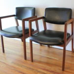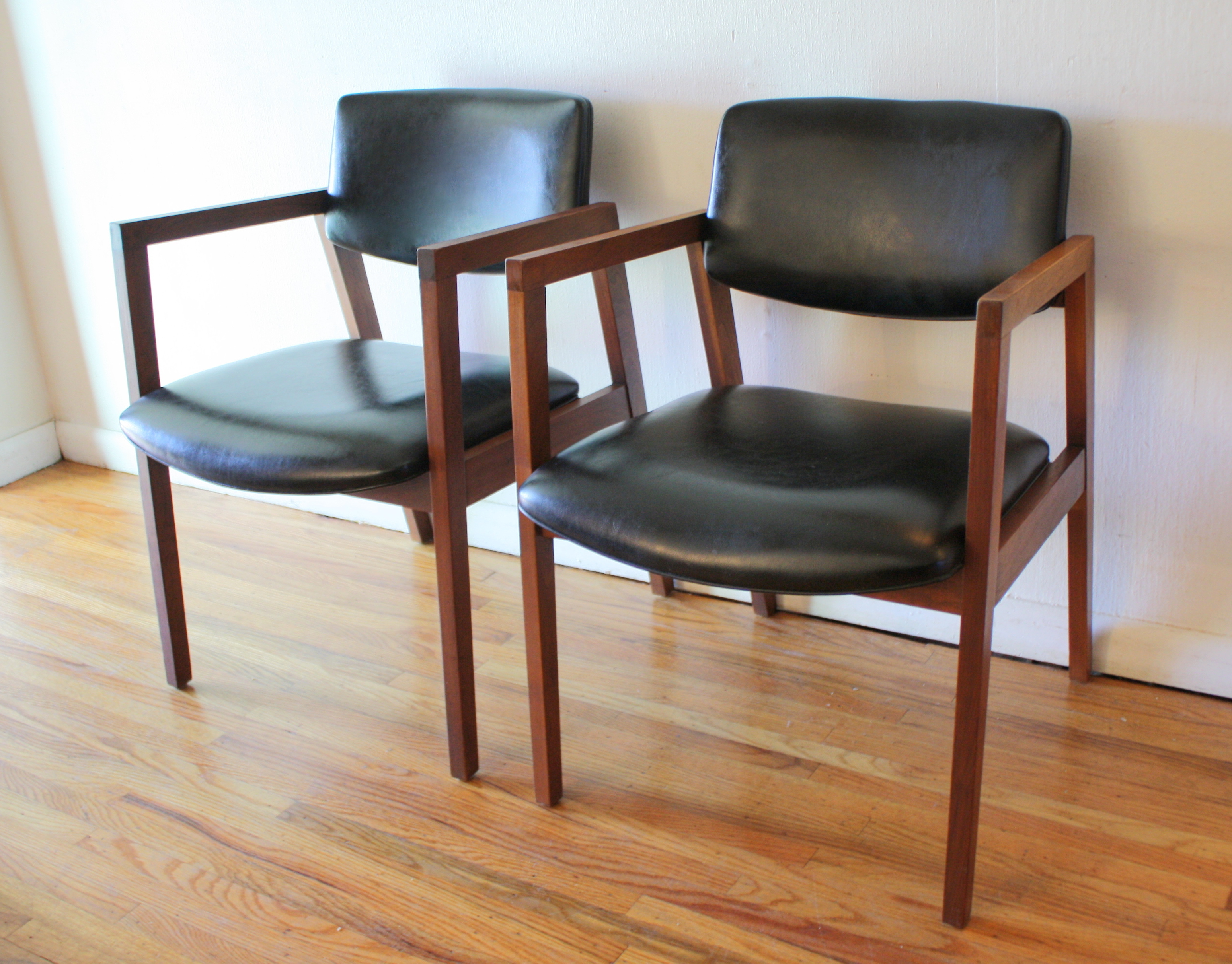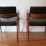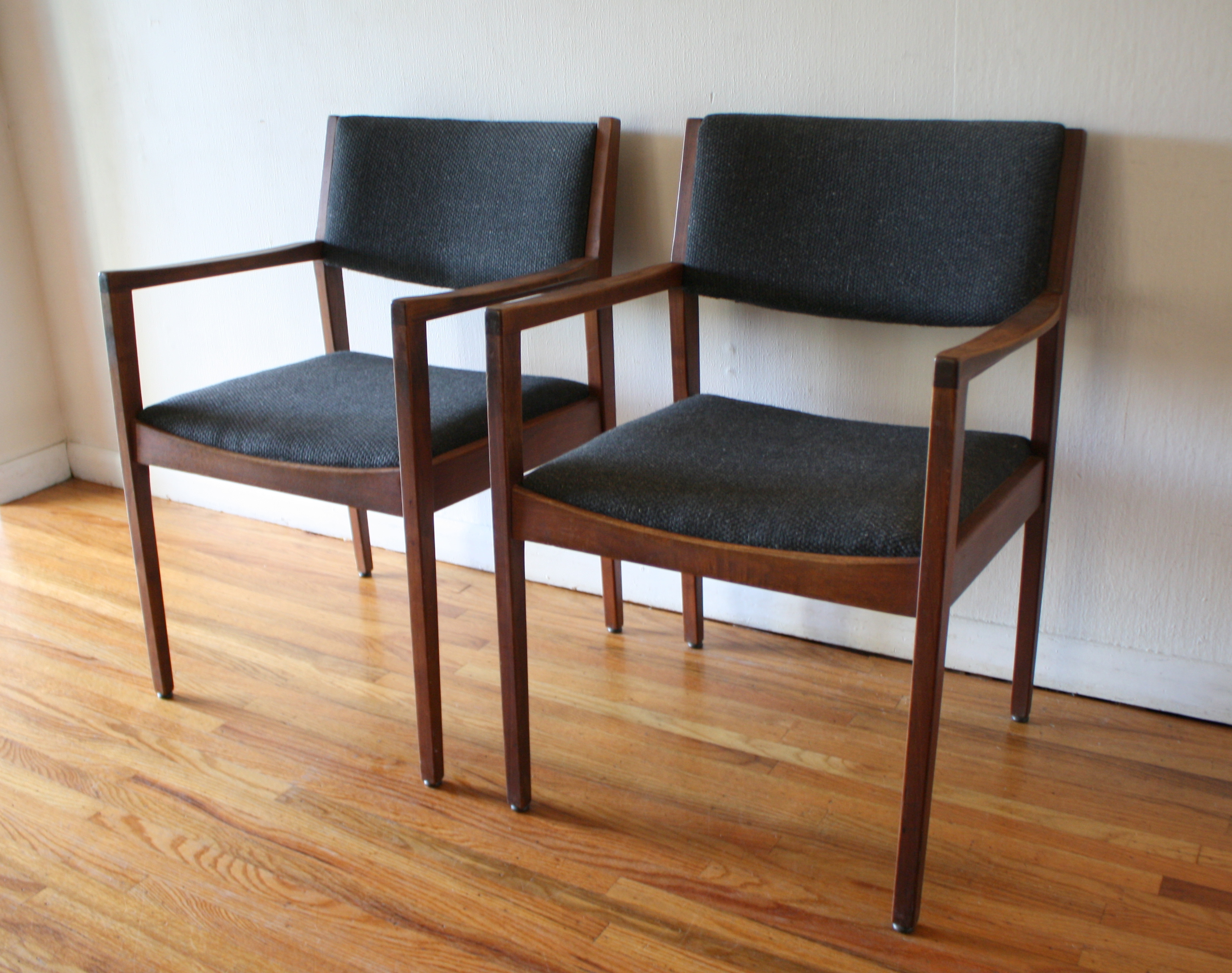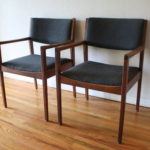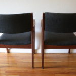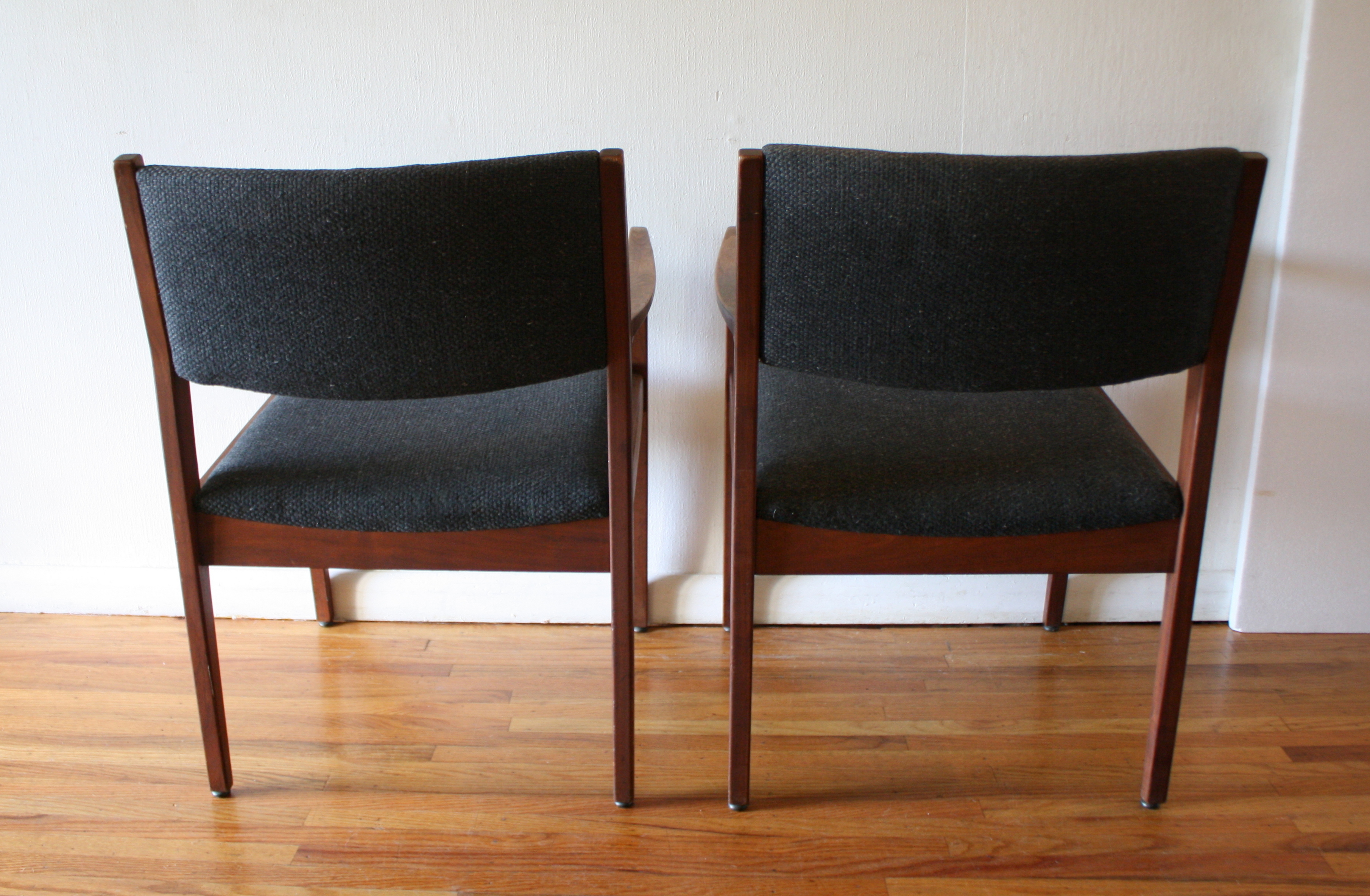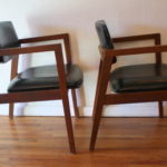 These are 2 pairs of mid century modern arm chairs. The first pair of arm chairs were made by the United Chair Company. The chairs have sculpted solid wood frames, and upholstered seats and backs in black naugahyde: seat width: 19.5″, seat depth: 19″, seat height: 17.5″, back height: 30″. The second pair of arm chairs have solid wood frames and with slate gray tweed seats and back. The seats have been newly reupholstered. Dimensions: seat width: 19″, seat depth: 17.5″, seat height: 18″, back height: 31″. Pictured with Danish magazine rack side table sold separately.