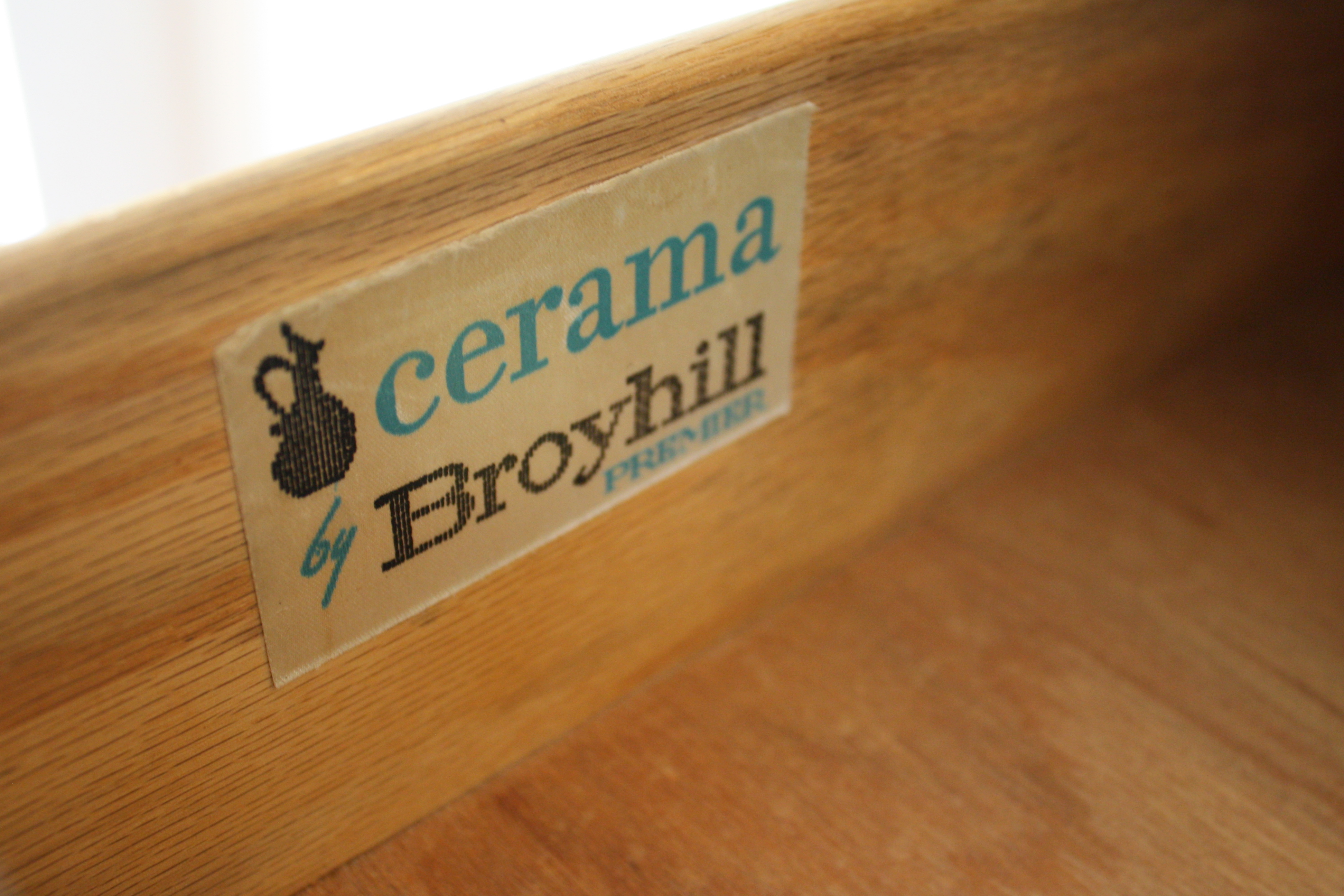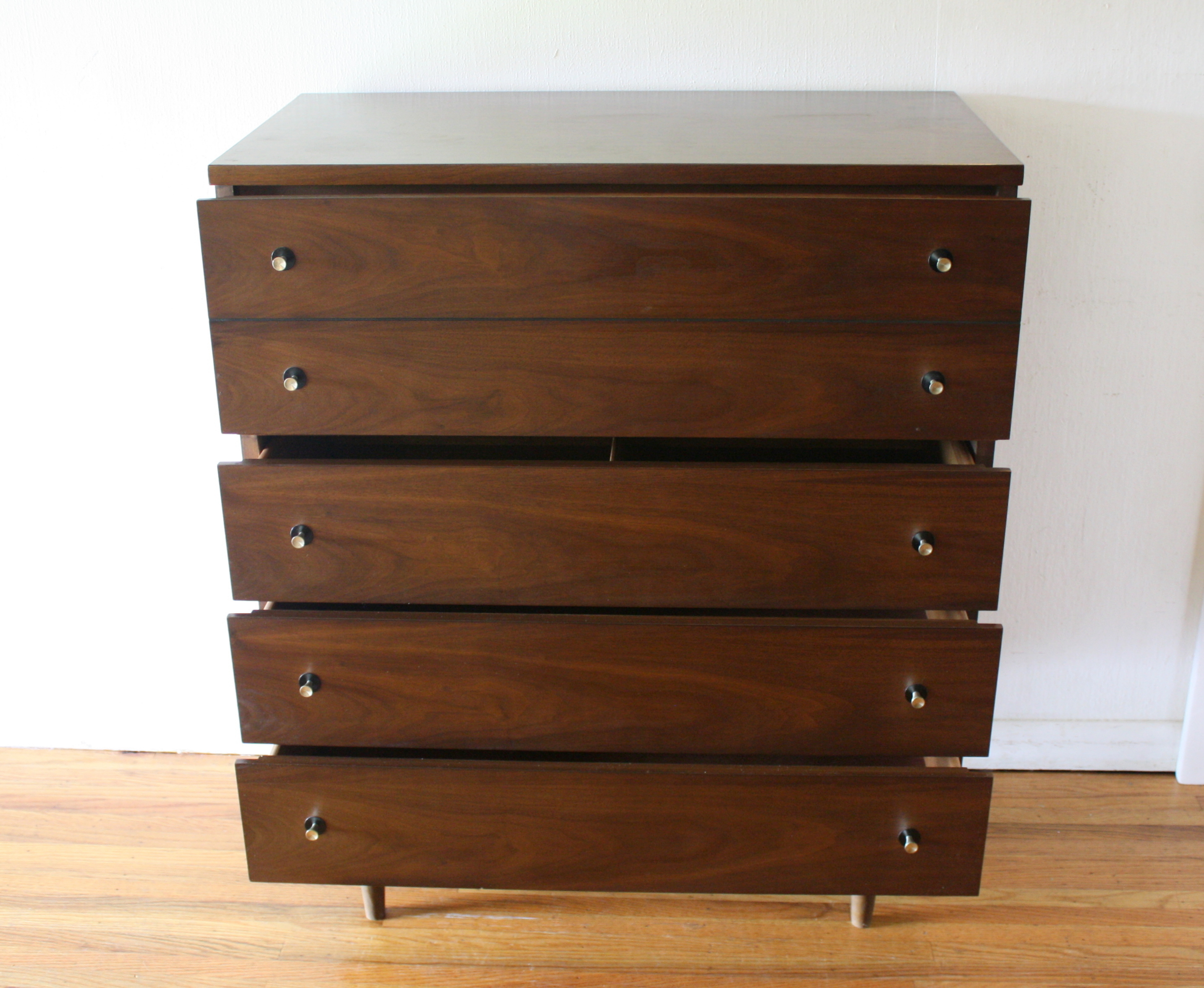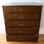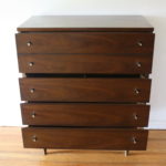 These are 3 different styles of mid century modern tall dressers.  The first tall dresser has 4 dovetailed drawers with a streamlined design and tapered legs: 34.5″W x 18″D x 42″H.  The second dresser is by Stanley, has 4 dovetailed drawers with their signature silver accented knobs, tapered brass accented legs: 34″W x 18″D x 41″H.  The third dresser is from the Broyhill Cerama collection, has 5 dovetailed drawers with brass handles, and tapered brass accented legs: 38″W x 18″D x 44″H.