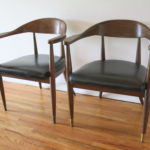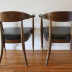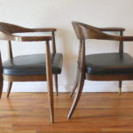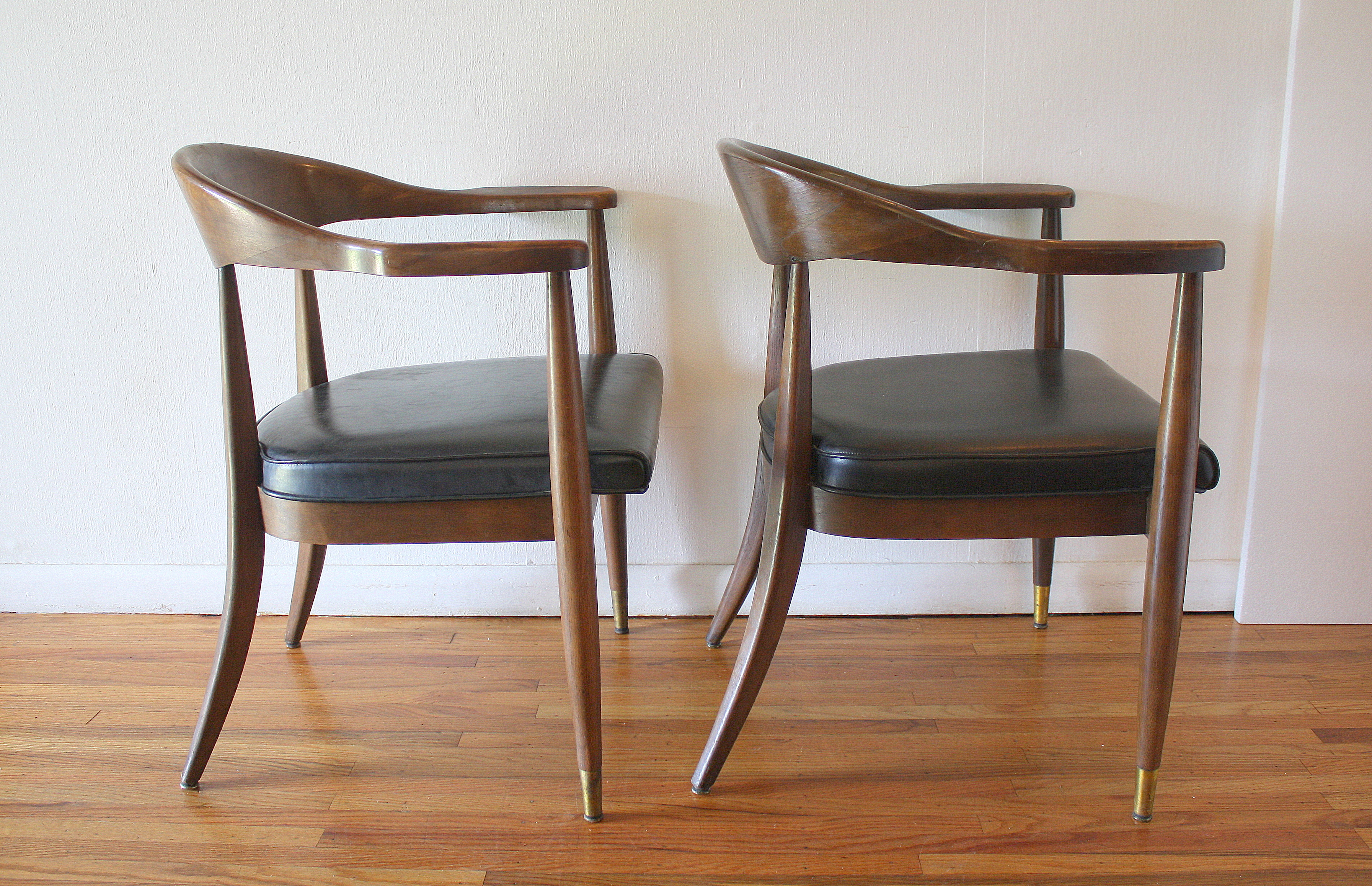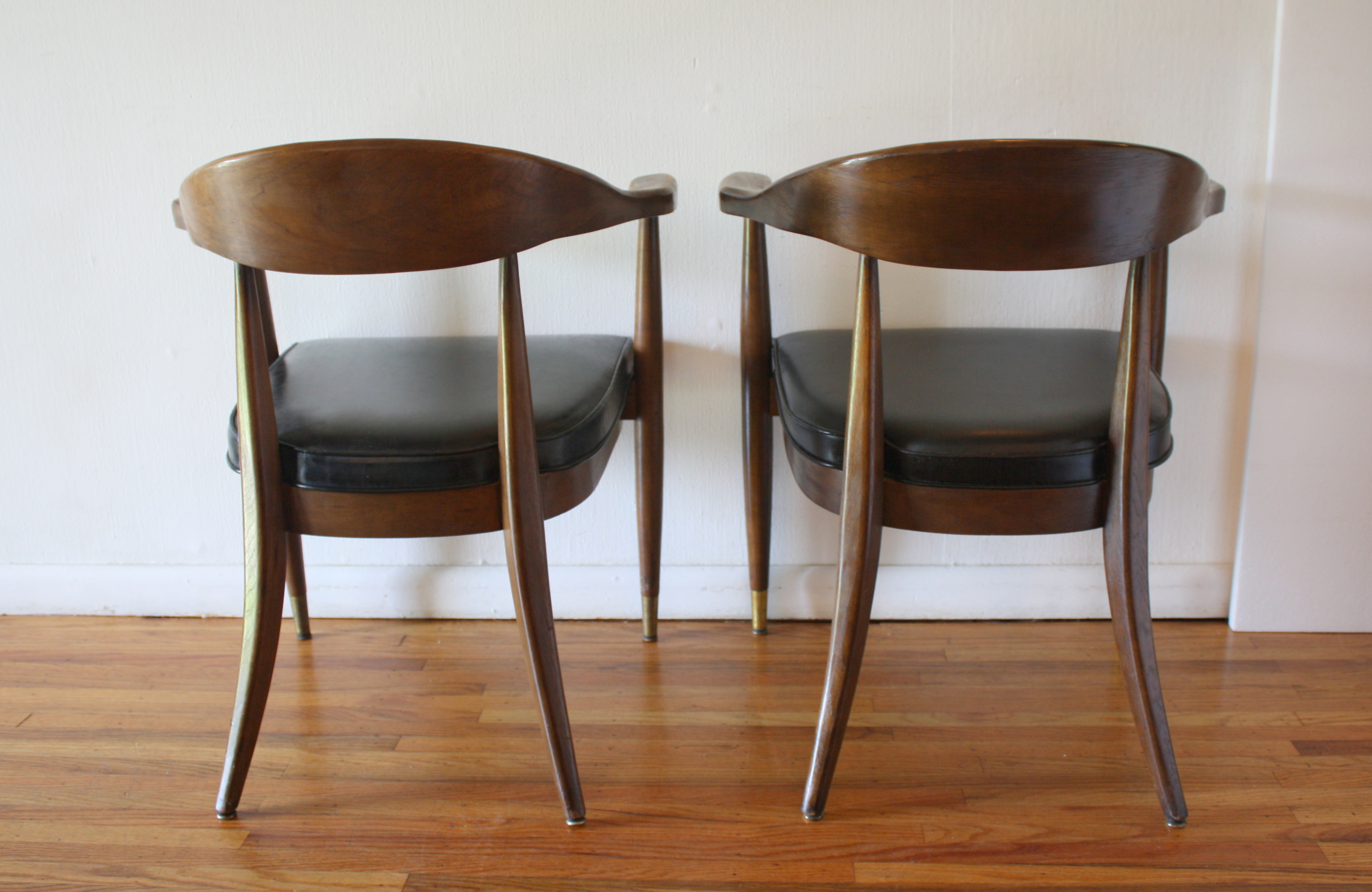 This is a pair of mid century modern chairs by the Boling Chair company. Each chair has an upholstered seat in black naugahyde, and the frame has a beautiful curved back and arms with brass tipped tapered legs: 20″ seat width, 20.5″ seat depth, 18″ seat height, 30″ back height.