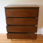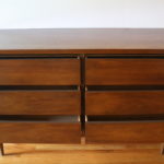 This is a matching set of mid century modern dressers by Bassett, high and low dresser. Both pieces have a streamlined drawer design. The tall dresser has 5 dovetailed drawers: 34″W x 18″D x 43″H. The low dresser has 6 dovetailed drawers: 52″W x 18″D x 30.5″H.