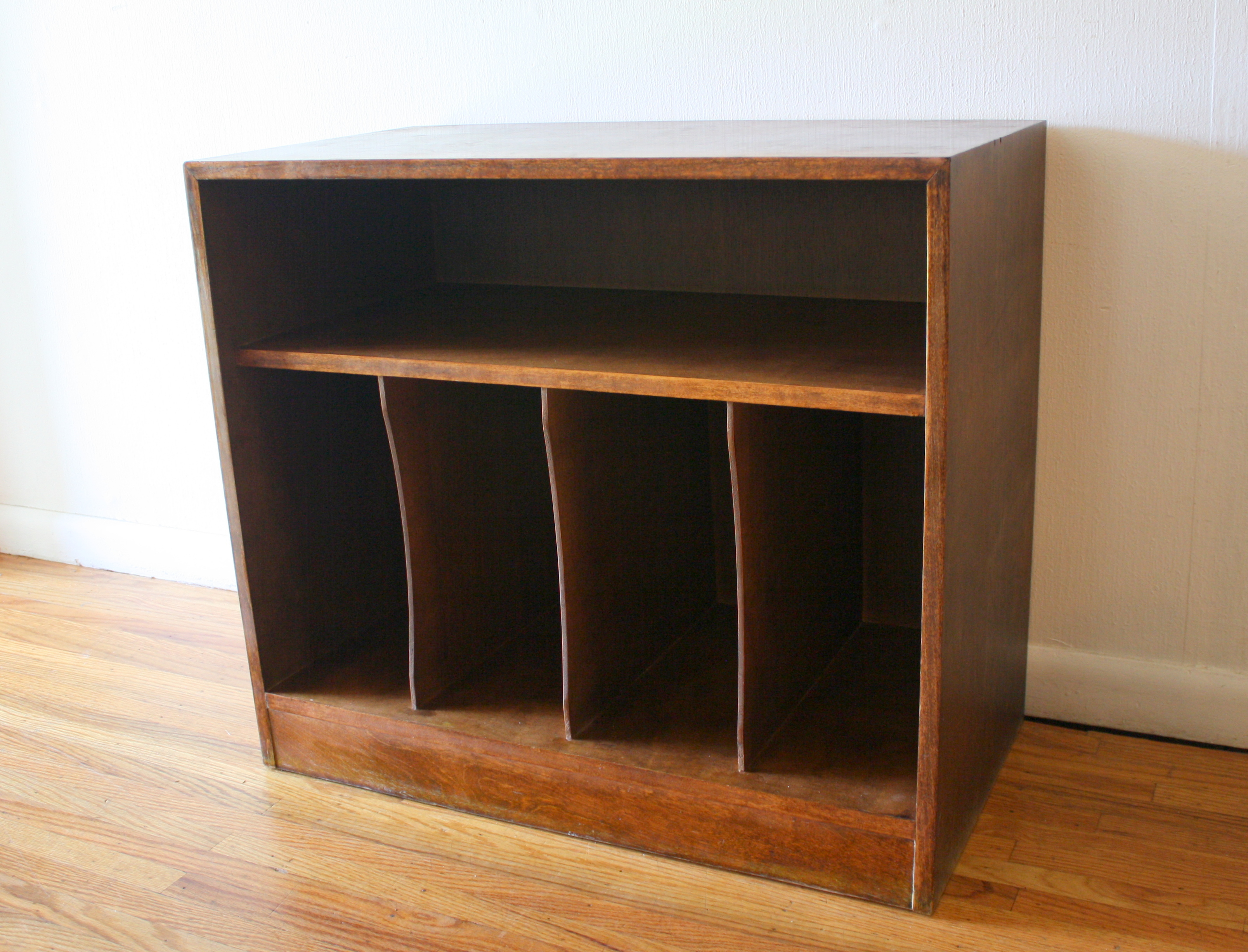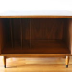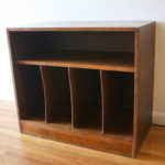 These are 2 mid century modern record cabinets. The first is by Lane, has their signature dovetail design, record slot storage, and tapered legs. Dimensions: 30″W x 18″D x 22″H. The second is a record cabinet with open slot storage, and a top shelf. Dimensions: 30″W x 16″D x 26.5″H.