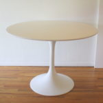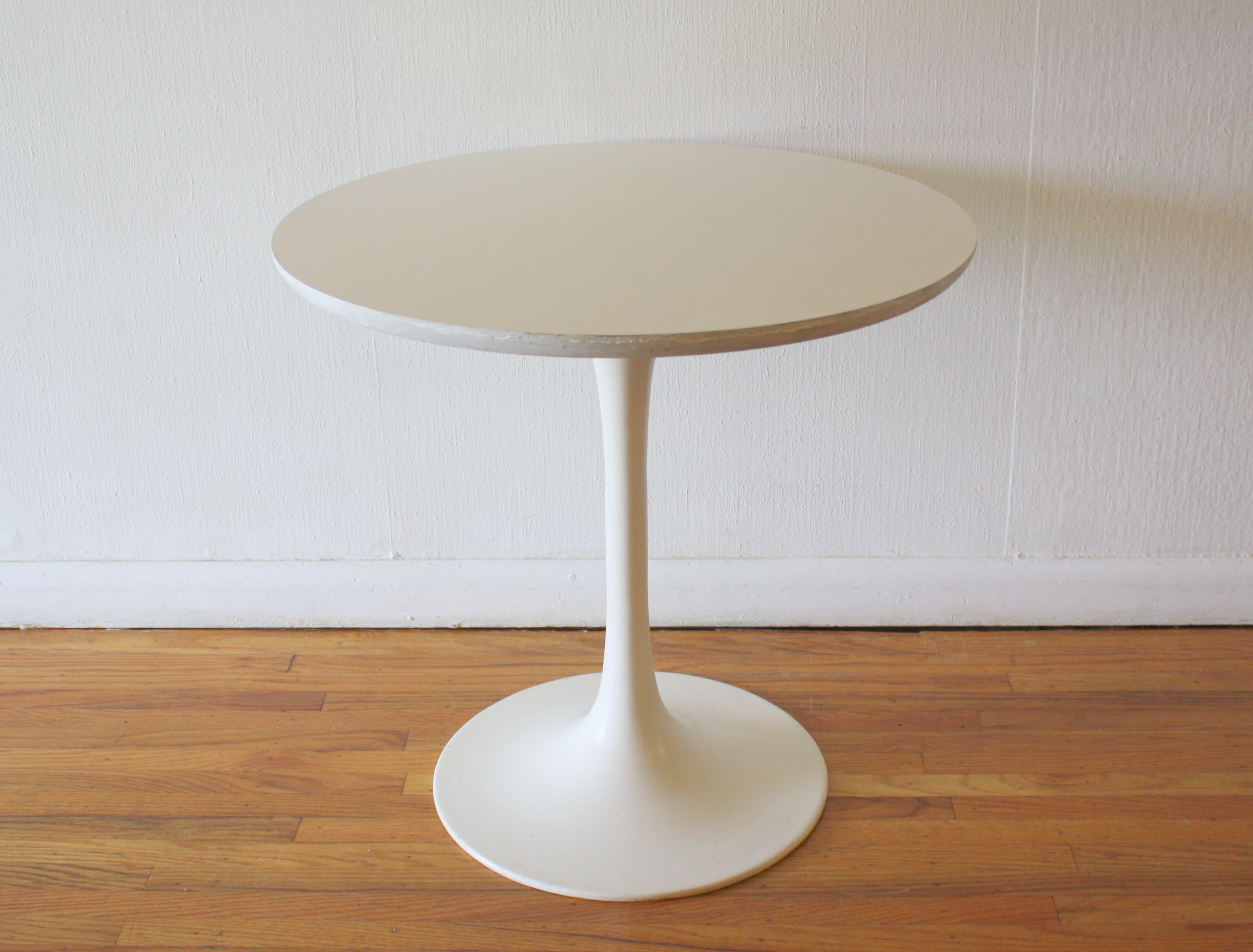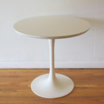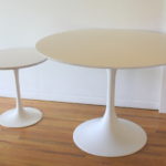 These are 2 mid century modern Saarinen style tulip base tables. The first is a dining table: 36″ diameter, 30″H. The second is a side end table: 24″ diameter, 22.5″H. Accessories sold separately.