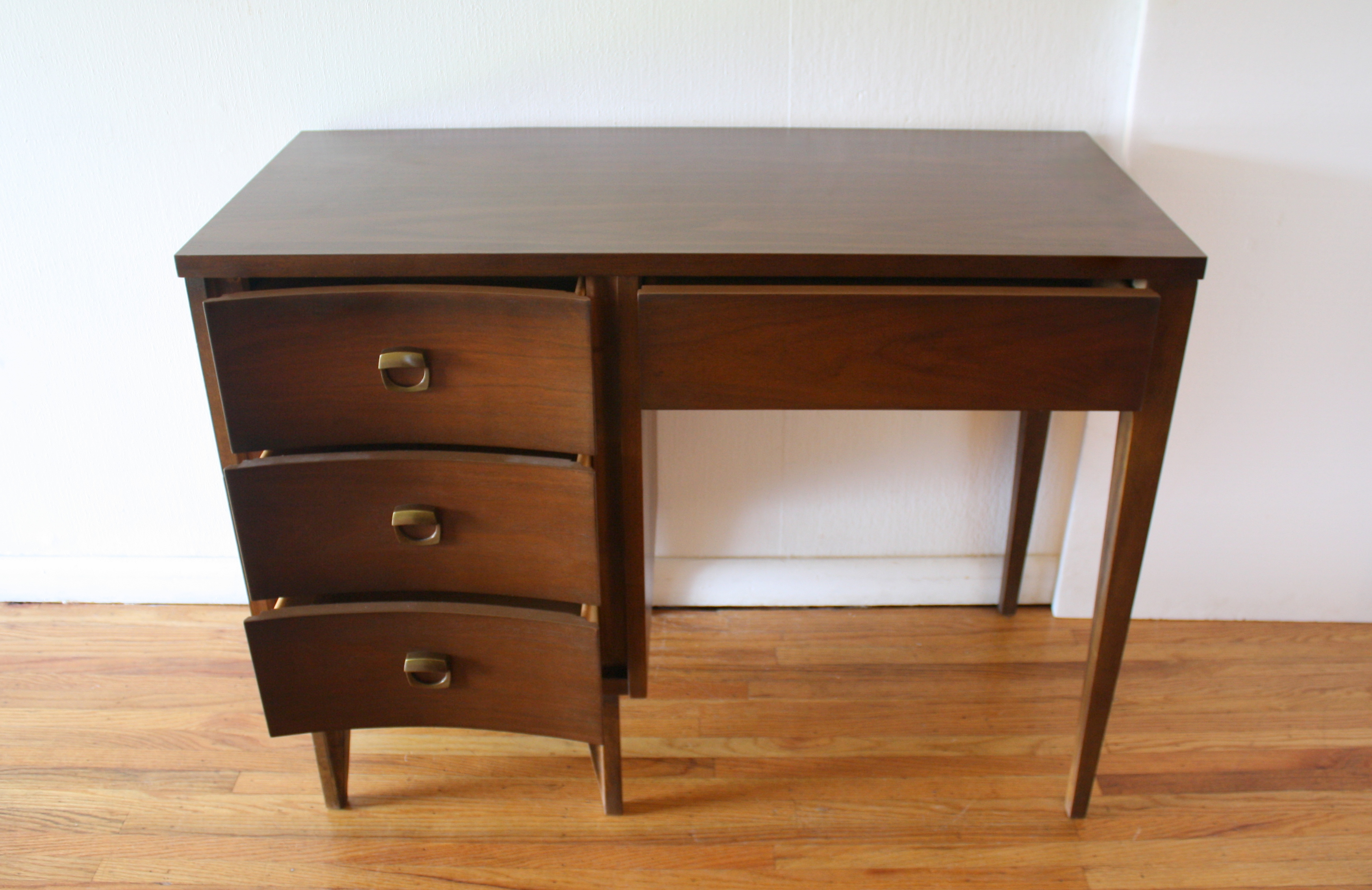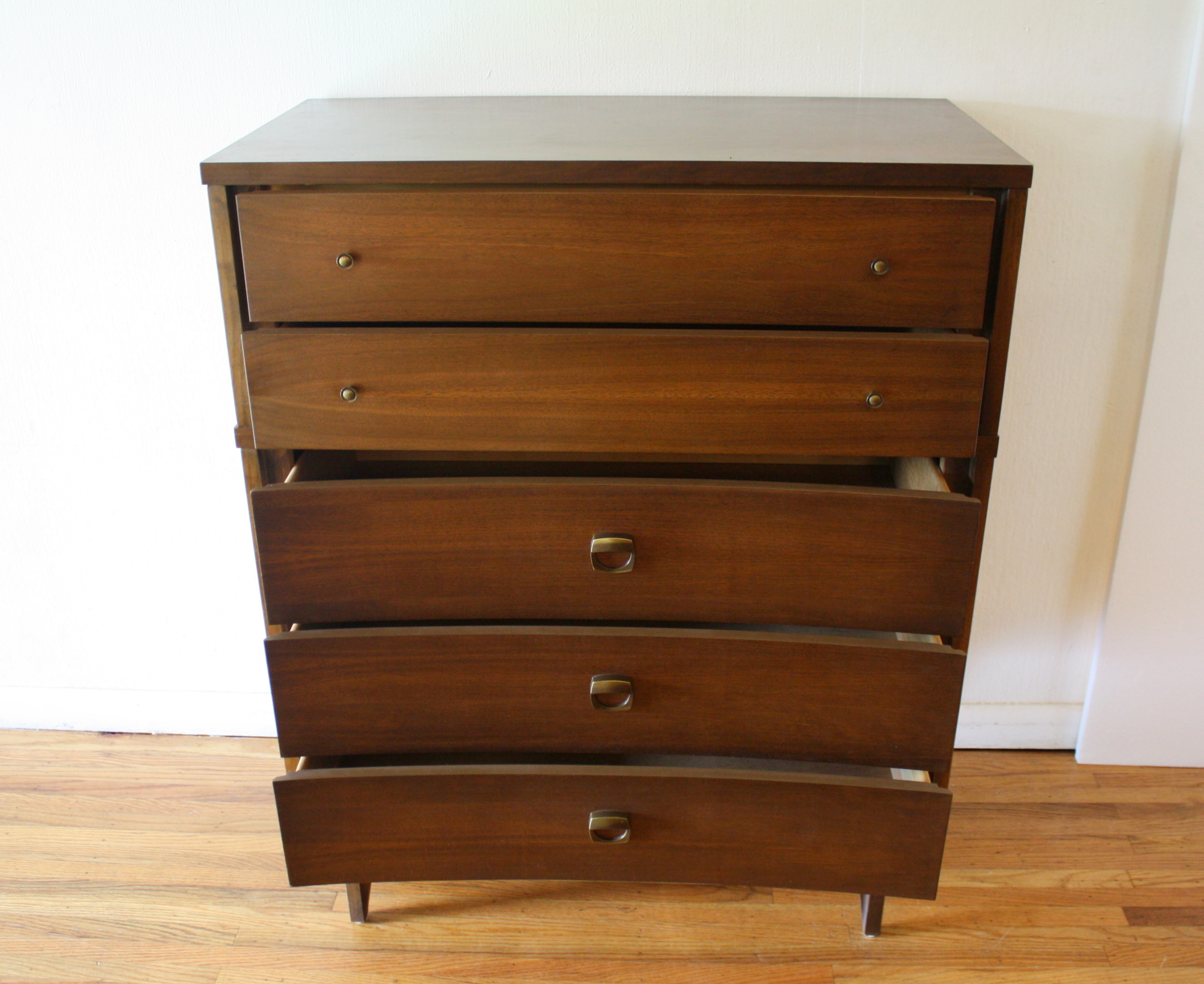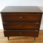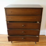 These are 2 mid century modern dressers by Johnson Carper with their signature concave design and sculpted brass pulls. The bachelor dresser has 3 dovetailed drawers: 32″W x 18″D x 30″H. The tall dresser has 5 dovetailed dresser: 34″W x 18″D x 42″H.