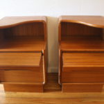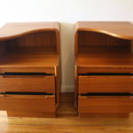 This is a pair of mid century modern teak side end table nightstands.  They have an asymmetrical cutout design on top, a mini writing desk shelf pull out, and 2 drawers each with a streamlined design.  Dimensions: 20.5″W x 17″D x 30″H.