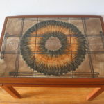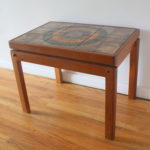 This is a Danish teak side end table with a sunburst tile top.  Dimensions: 25.5″W x 17.5″D x 19.5″H.