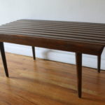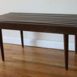 This is a mid century modern slatted coffee table bench. The first has a flat edge angled slatted design and tapered legs. The second has a rounded edge angled design. Perfect for a coffee table or bench. Dimensions: 36″ W x 18″ D x 14.5″ H.