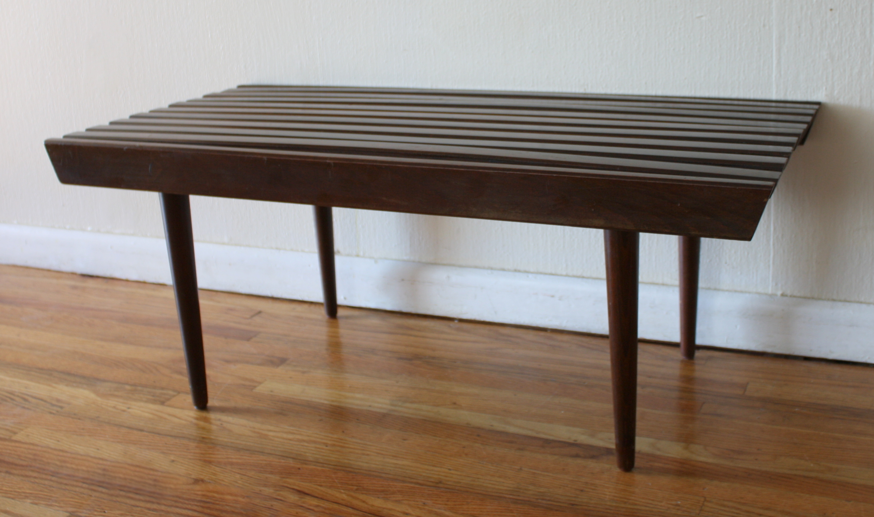 This is a mid century modern slatted coffee table bench. The first has a flat edge angled slatted design and tapered legs. The second has a rounded edge angled design. Perfect for a coffee table or bench. Dimensions: 36″ W x 18″ D x 14.5″ H.