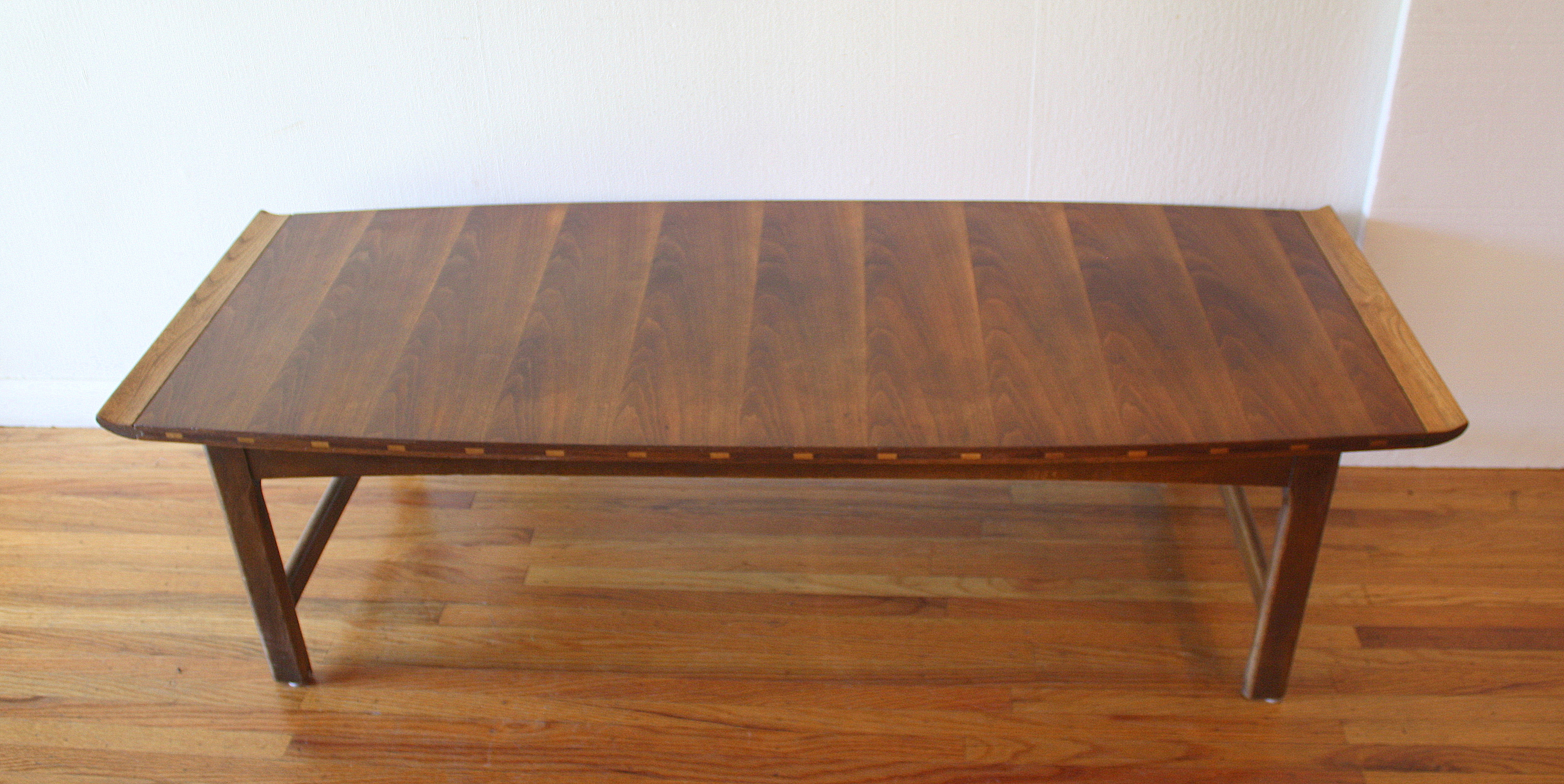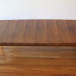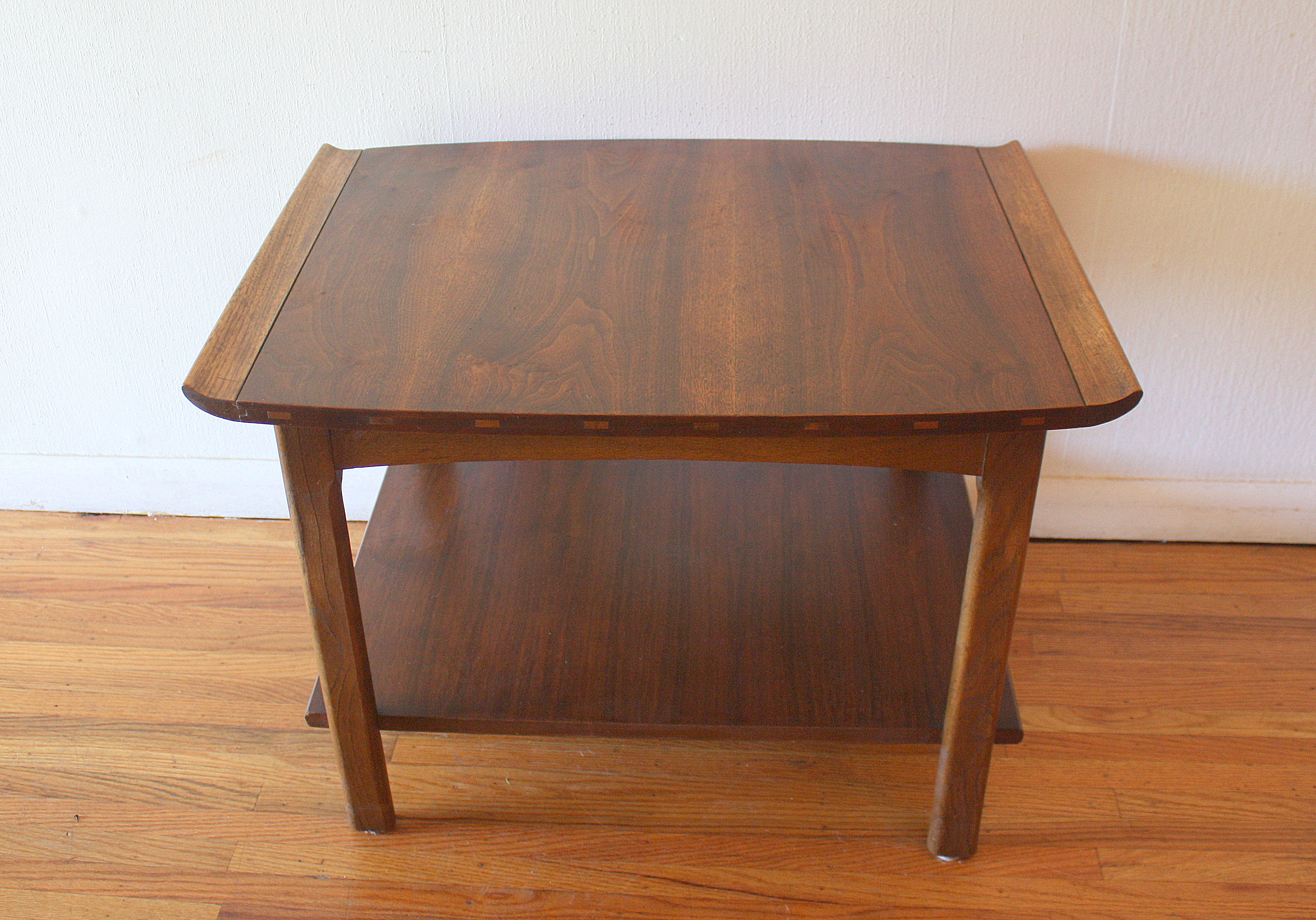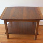 This is a mid century modern coffee table and side end table by Lane. Both have an inlaid wood design and surfboard edge sides. The side end table has a bottom shelf. Coffee table dimensions: 56″W x 22″D x 15.5″H. Side table dimensions: 29″W x 22″D x 20.5″H.
