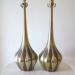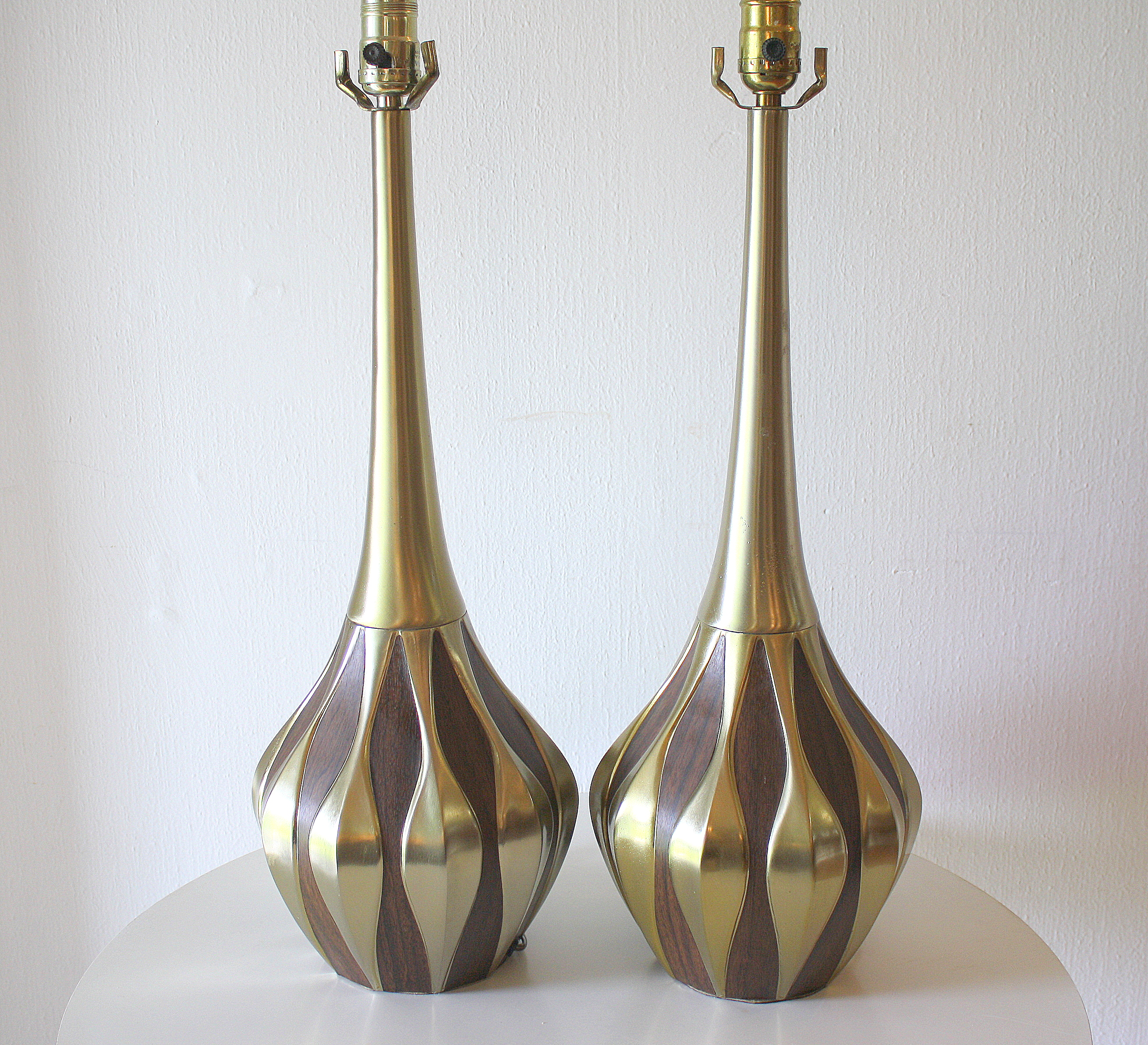 Pair of Mid Century Modern Table Lamps This is a pair of mid century modern brass and wood table lamps with an undulating design. *SOLD*