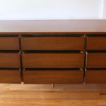 This is a mid century modern low dresser credenza from Bassett’s Gala line. It has 9 dovetailed drawers with its signature streamlined design, faux rosewood accents, and tapered legs. Dimensions: 72″W x 17.5″D x 30.5″H.