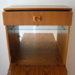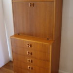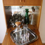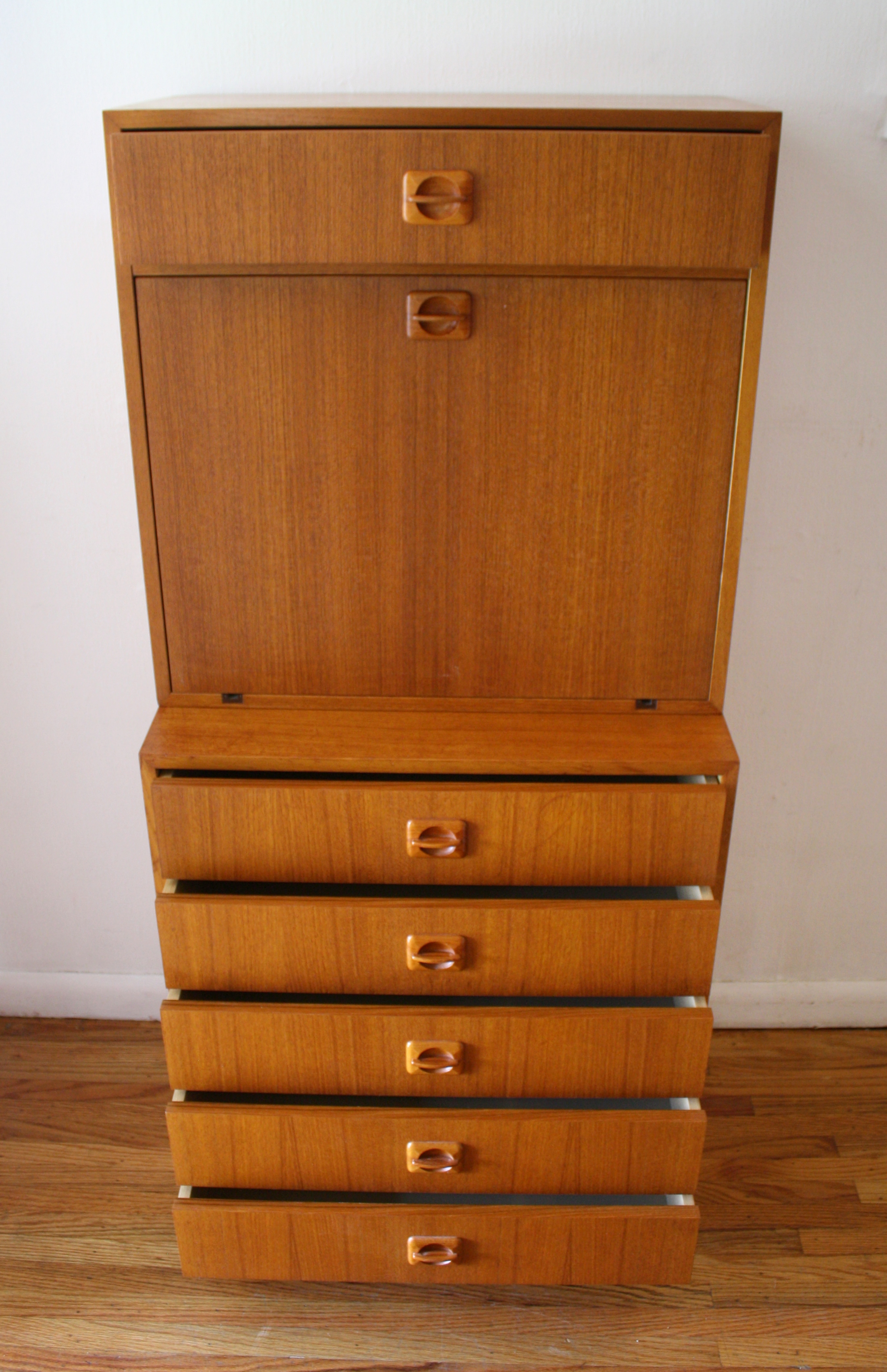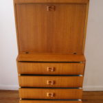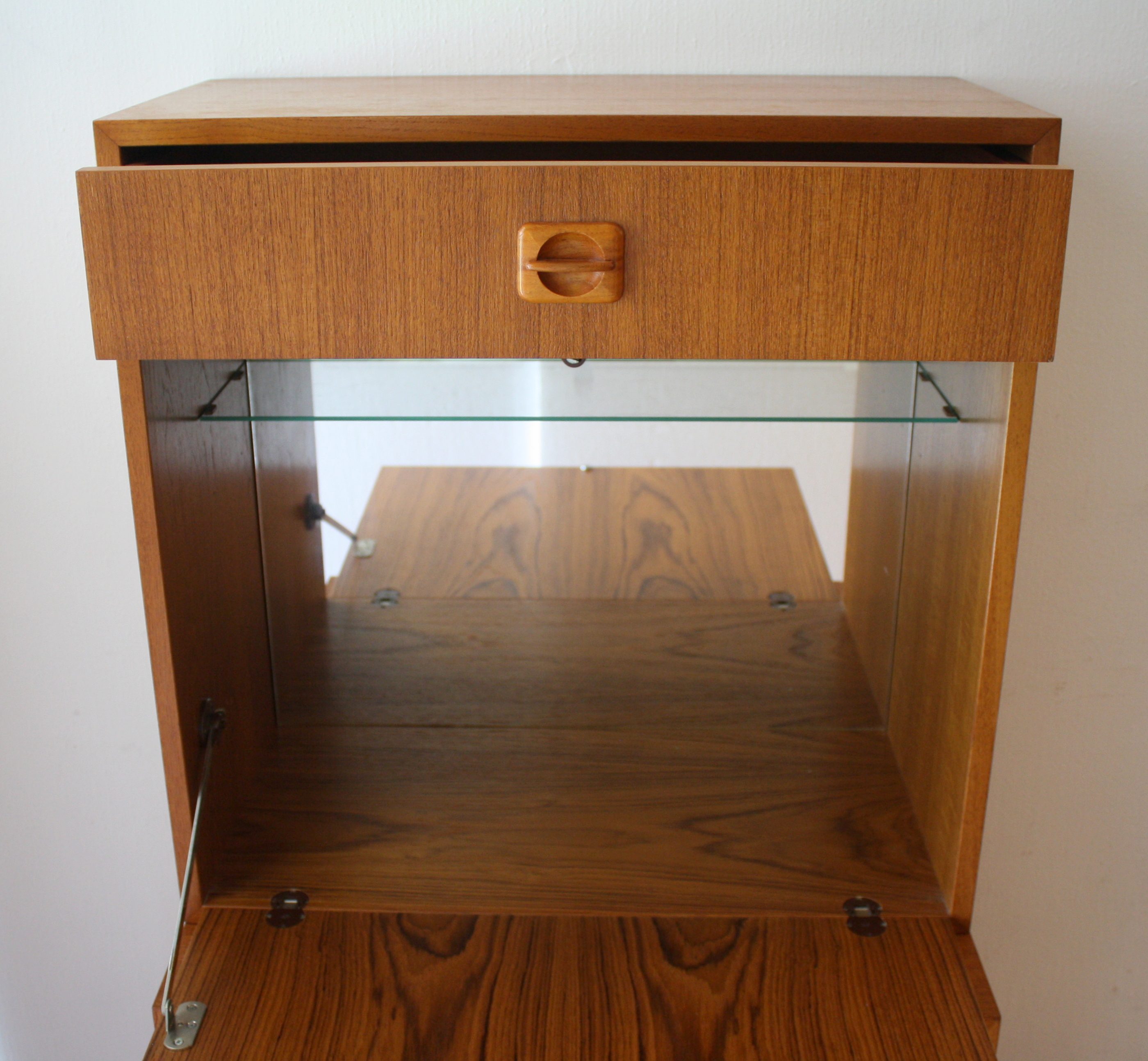 This is a mid century modern teak bar cabinet.  It has a fold out bar shelf, inside mirrored cabinet with glass shelf.  There are also 6 storage drawers with Danish pulls.  Dimensions: 23.5″W x 16″D x 51.5″H.  Accessories sold separately.teak fold out bar 7.JPG