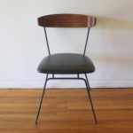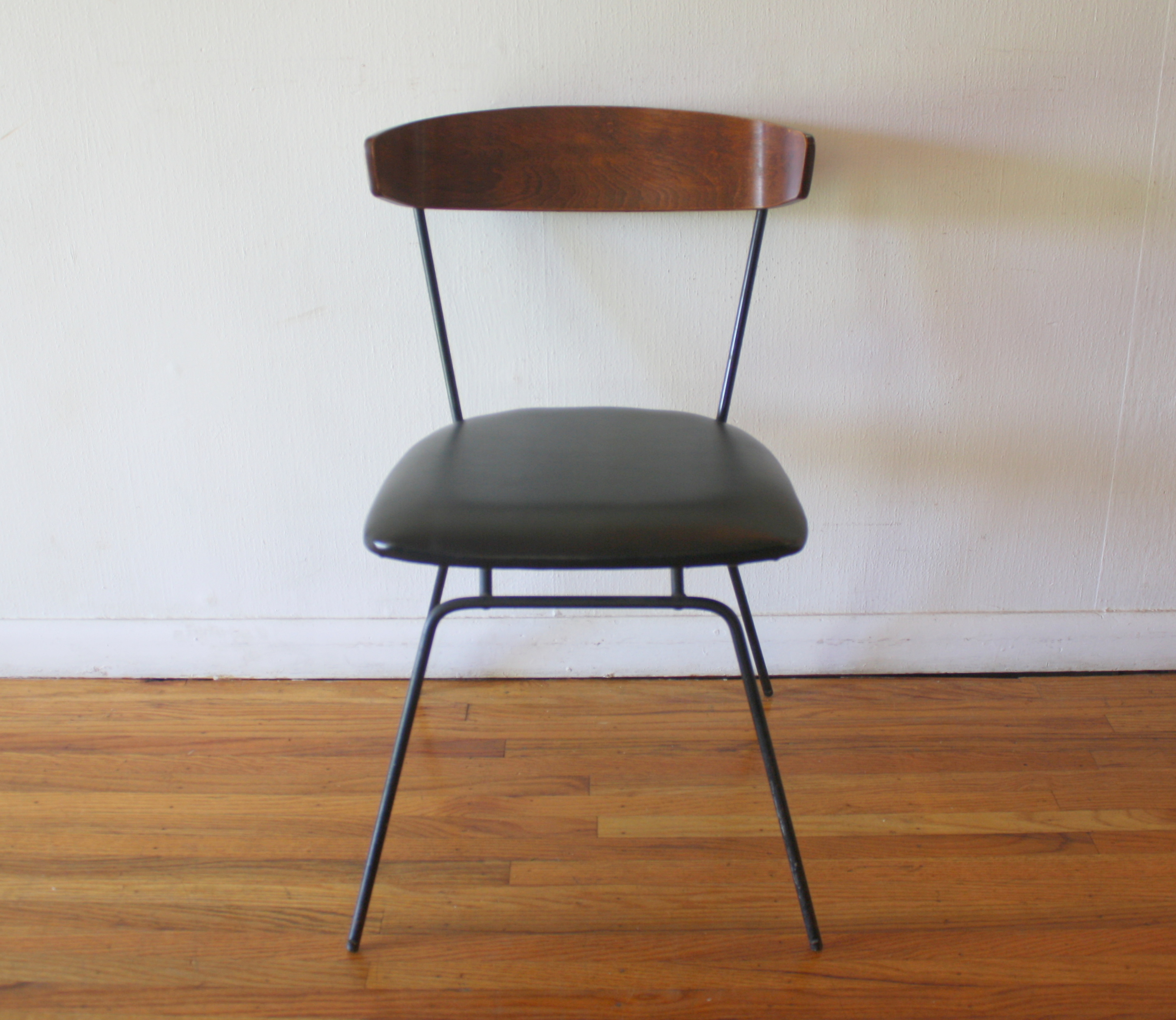 Mid Century Modern Chair by Paul McCobb This is a mid century modern chair by Paul McCobb, 1535 Style. It has a bentwood seat back, cast iron frame, and newly upholstered in supple black naugahyde. Dimensions: seat width: 16″, seat depth: 16″, seat height: 17″, back height: 29″. *SOLD*