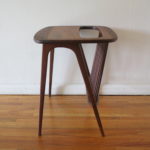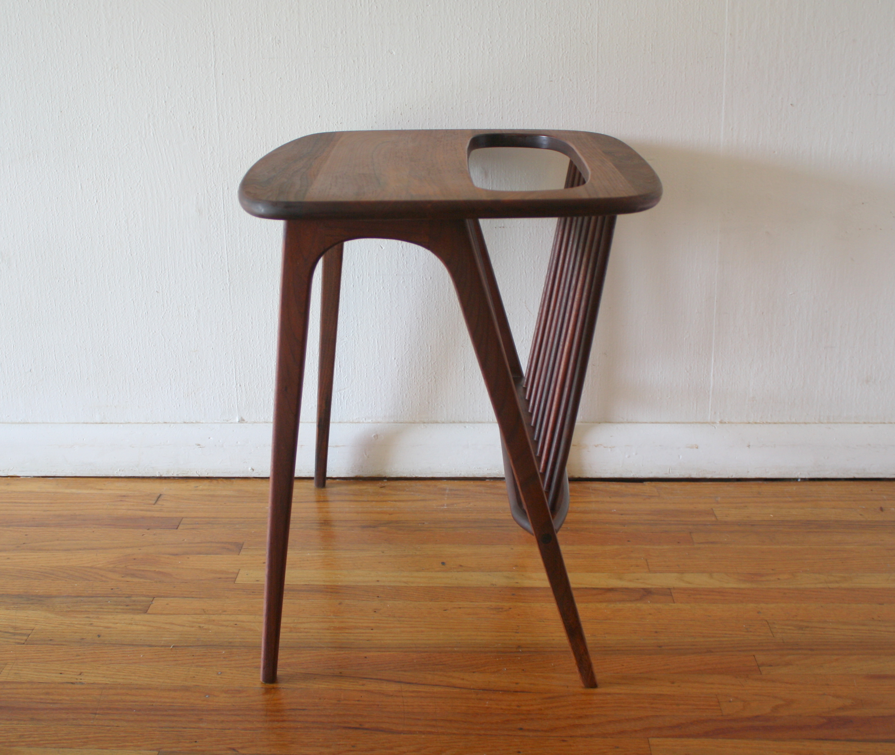 This is a mid century modern side end table with magazine rack designed by Arthur Umanoff. It has beautiful wood grain, slender tapered legs, and a spindle design. Dimensions: 22″W x 18″D x 20.5″H.