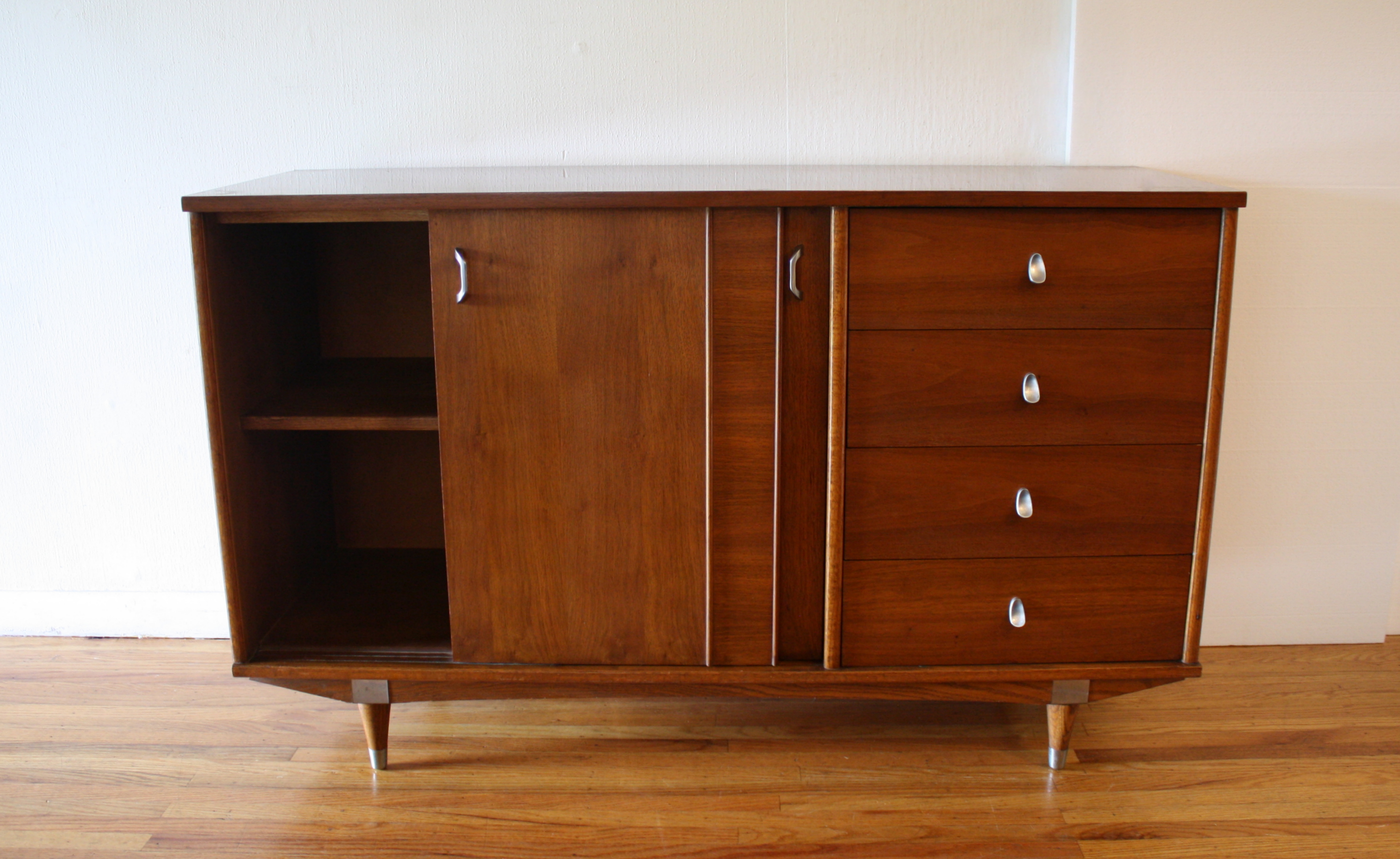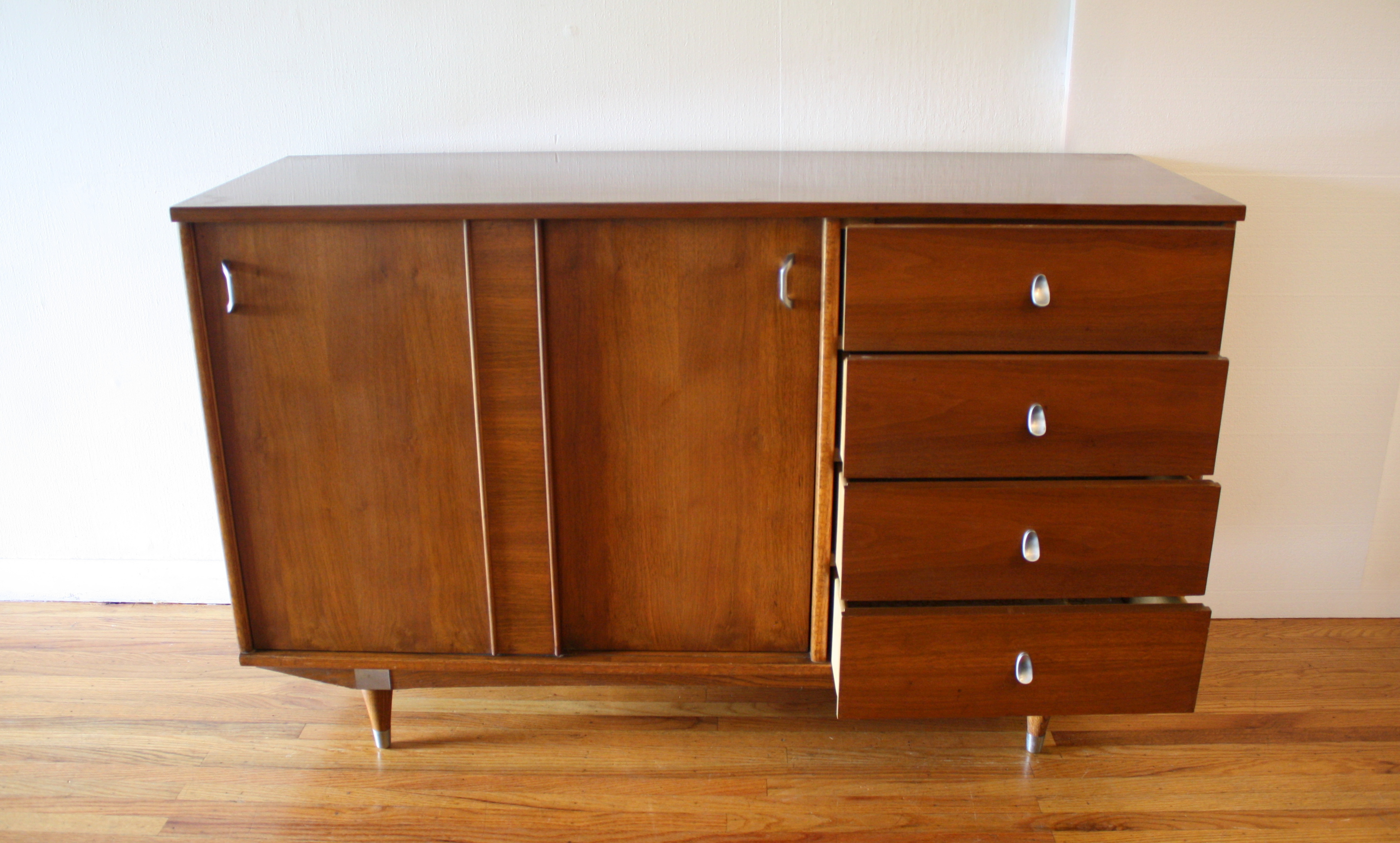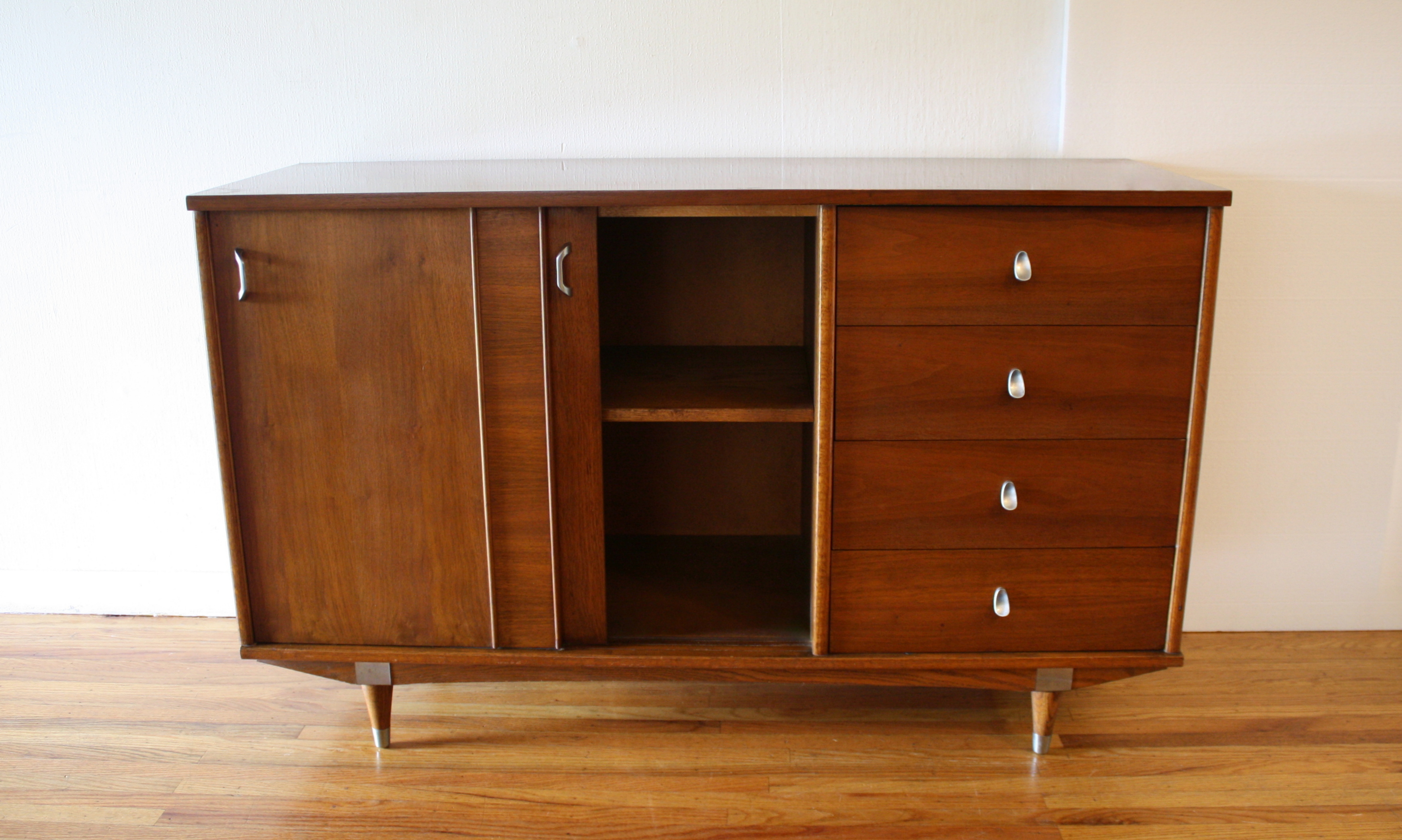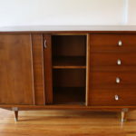This is a mid century modern sliding door credenza in the style of John Van Koert. It has 2 sliding doors with parquet design and inside shelving unit, 4 dovetailed drawers with silver thumbprint pulls, and tapered metal tipped legs. Dimensions: 52″W x 18″D x 32″H.