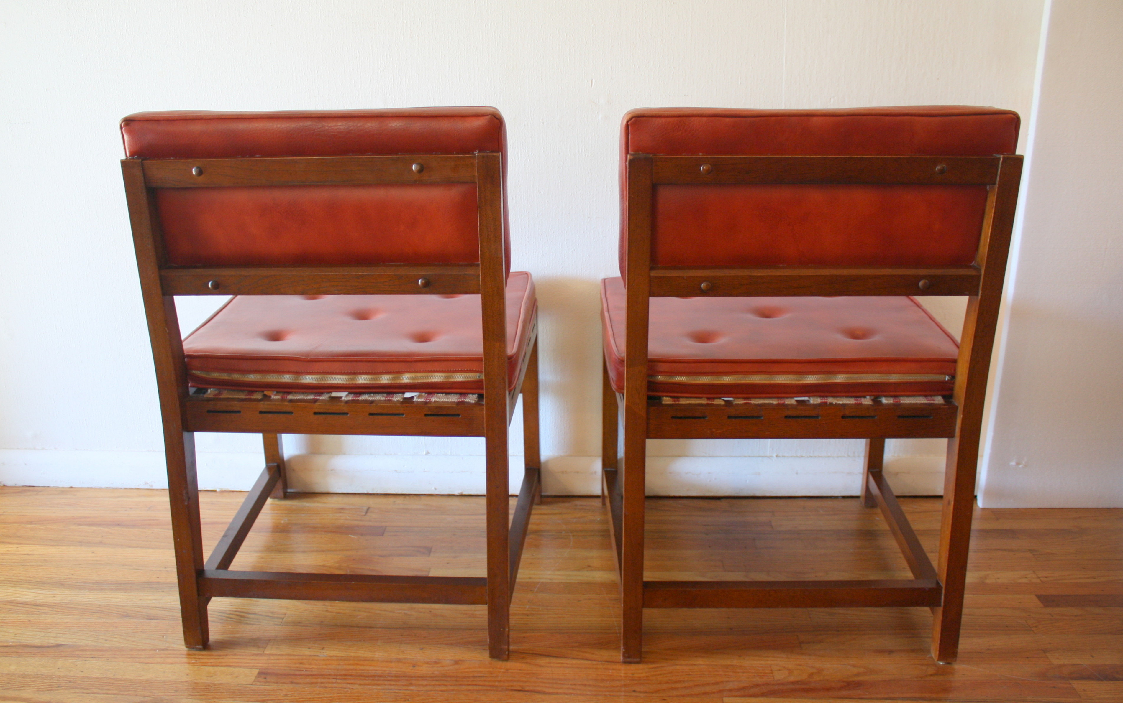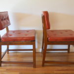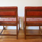 Mid Century Modern Pair of Chairs This is a pair of mid century modern chairs with a solid wood frame, and newly upholstered seats in its original tufted poppy naugahyde. Dimensions: 21.5″ seat width, 19″ seat depth, 18.5″seat height, 32″ back height. *SOLD*