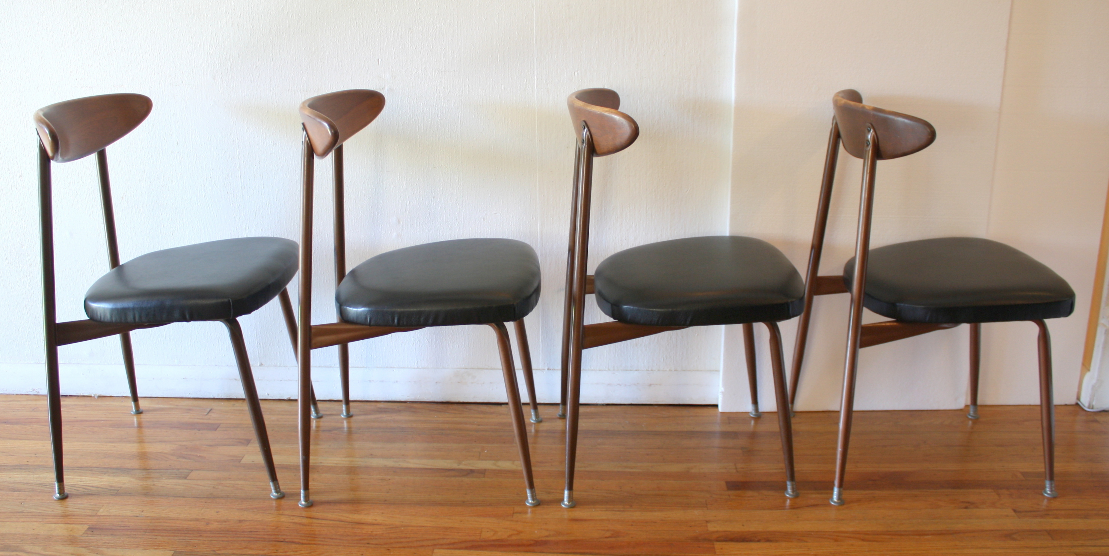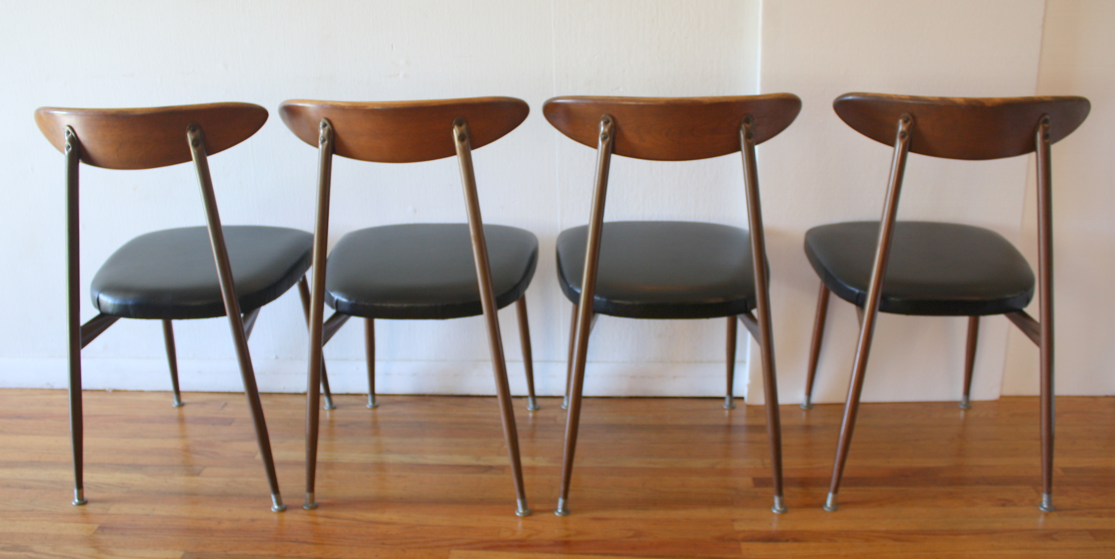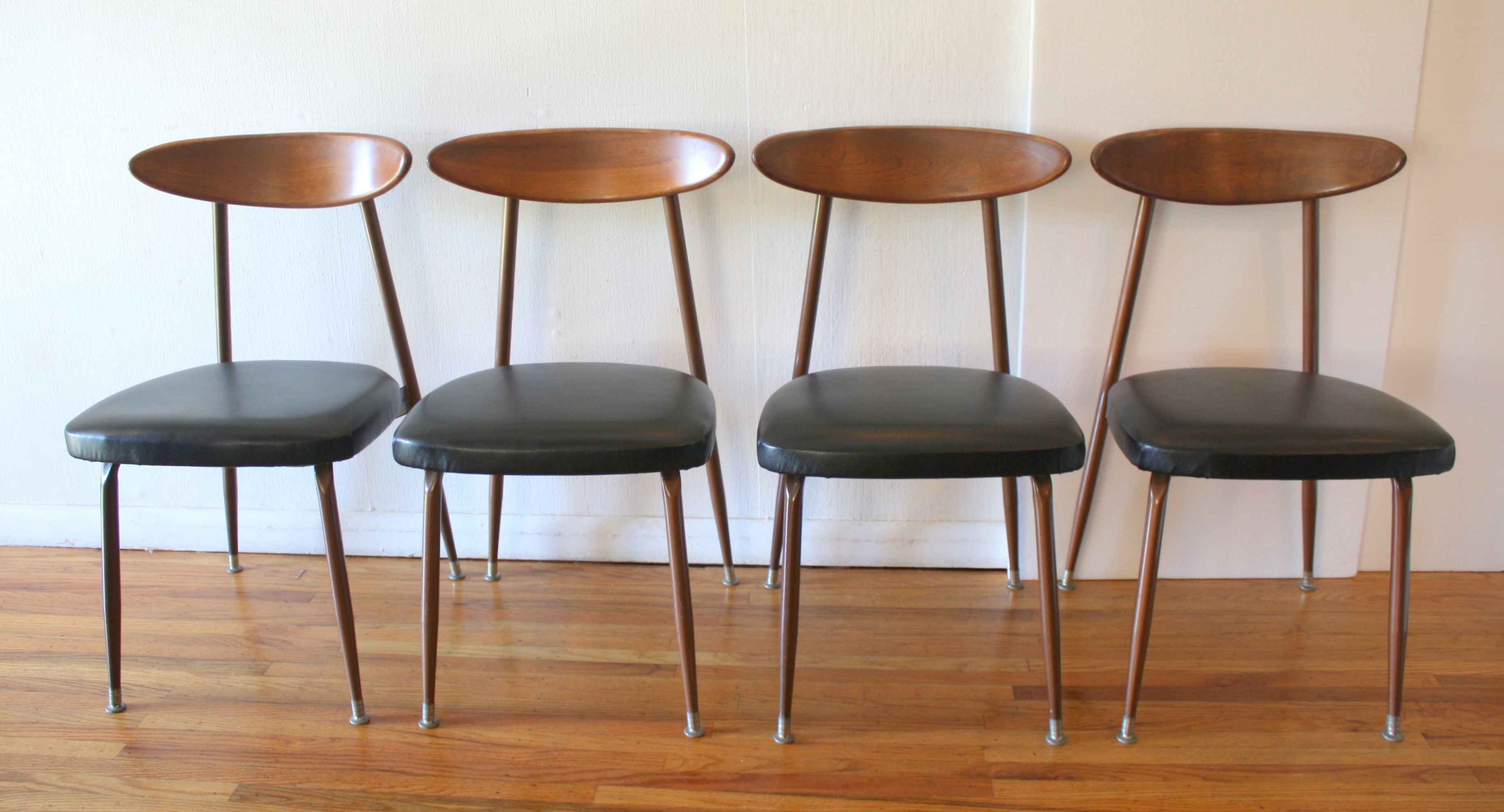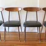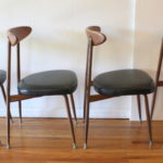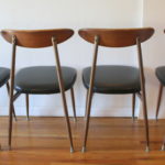 This is a set of 4 mid century modern dining chairs by Viko. They have their signature solid wood curvd backs, metal splayed leg frame, with newly upholstered seats in a supple black naugahyde. Dimensions: seat width: 17″, seat depth: 16.5″, seat height: 17.5″, back height: 31″.