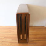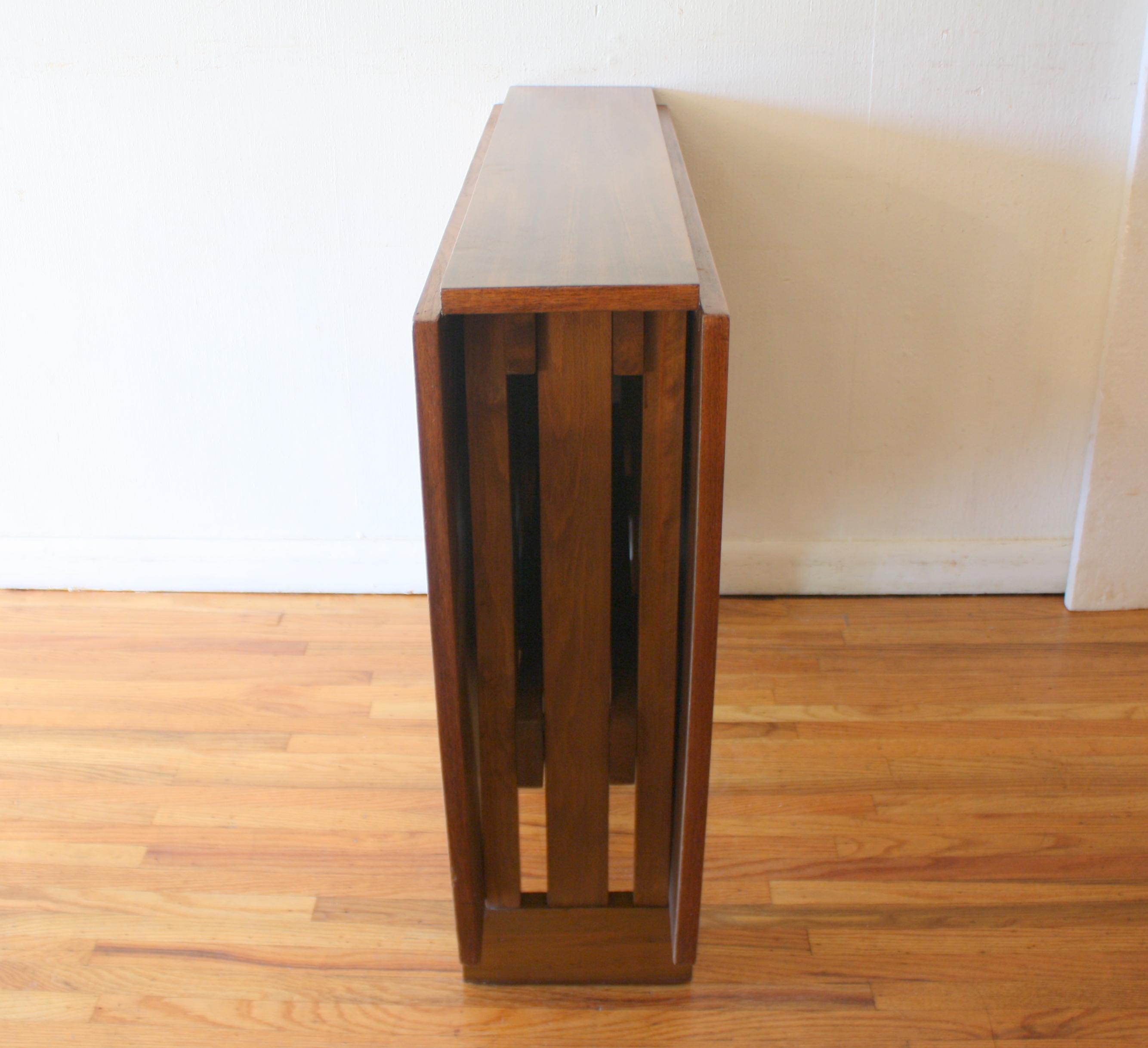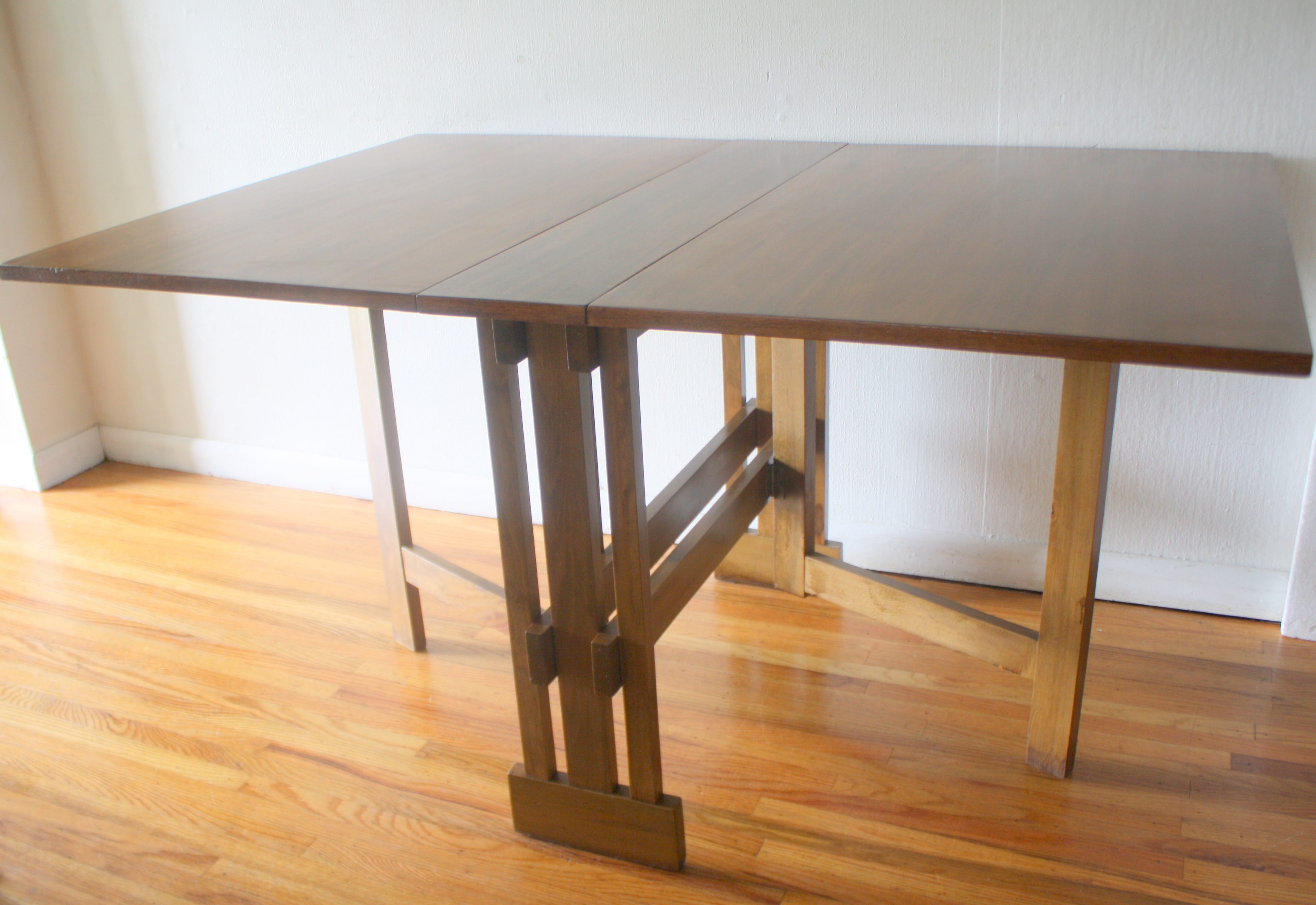 Mid Century Modern Gateleg Dining Table This is a mid century modern gateleg dining table with an art deco feel and a streamlined design. Each leaf can be folded down or extended as needed. Dimensions: 54″W both leaves expanded, 9″W both leaves folded down, 36″D, 29″H. *SOLD*