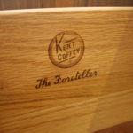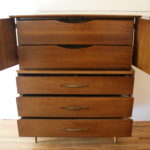 This is a mid century modern tall dresser armoire from the Kent Coffey Foreteller series. It has 2 dovetailed drawers in a top cabinet with doors, 3 bottom dovetailed drawers with brass handles, and an arched base with tapered legs. Dimensions: 44″W x 20″D x 51.5″H.