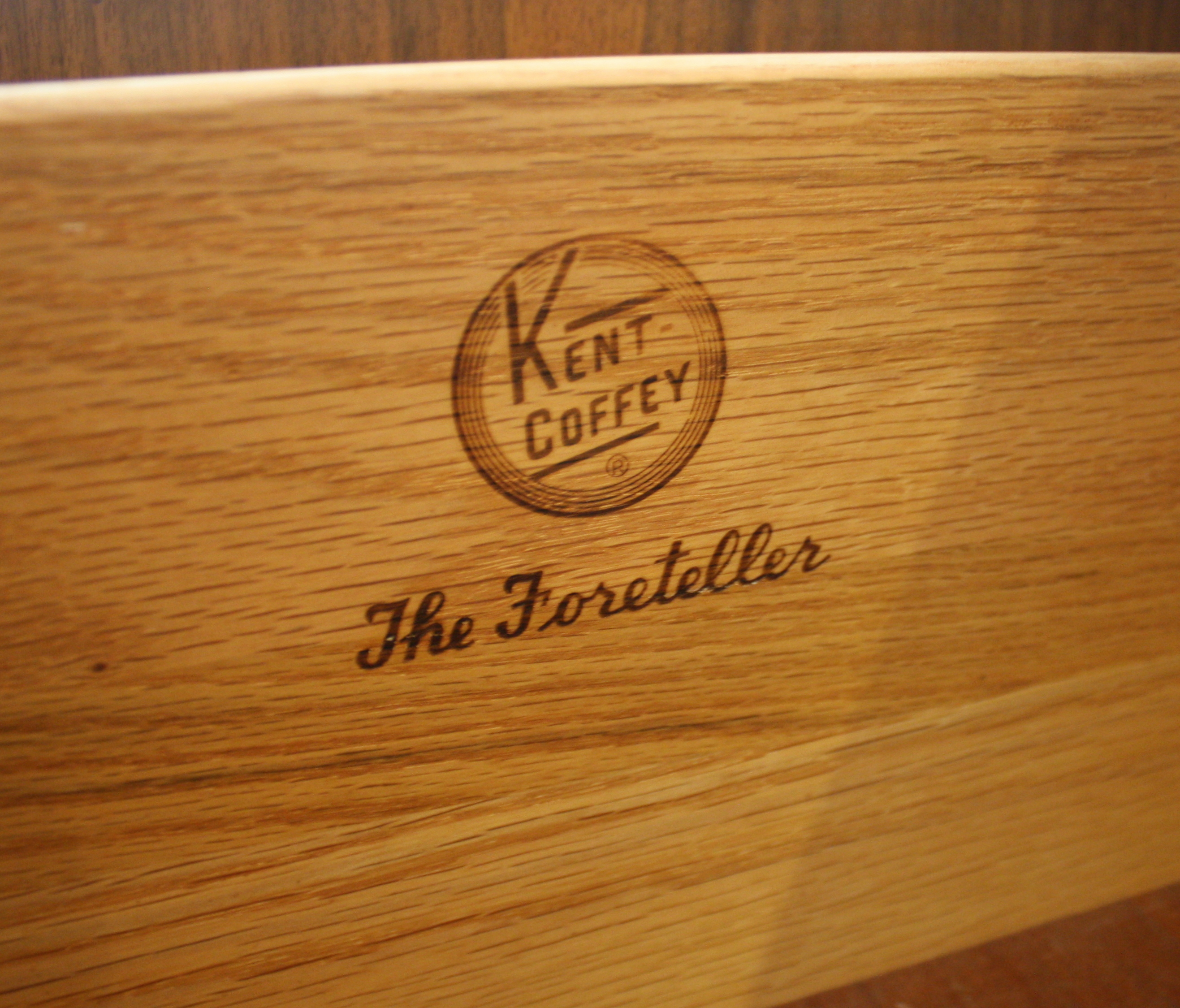 This is a mid century modern tall dresser armoire from the Kent Coffey Foreteller series. It has 2 dovetailed drawers in a top cabinet with doors, 3 bottom dovetailed drawers with brass handles, and an arched base with tapered legs. Dimensions: 44″W x 20″D x 51.5″H.