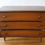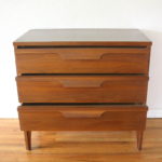 These are 2 mid century modern bachelor chest dressers by Johnson Carper. The first is from their Fashion Trend series, has 3 dovetailed drawers with sculpted wood handles and sculpted tapered legs: 32″W x 18″D x 30″H. The second has 3 dovetailed drawers with their signature concave design and geometric brass pulls, and sculpted tapered legs: 40″W x 18″D x 30″H.