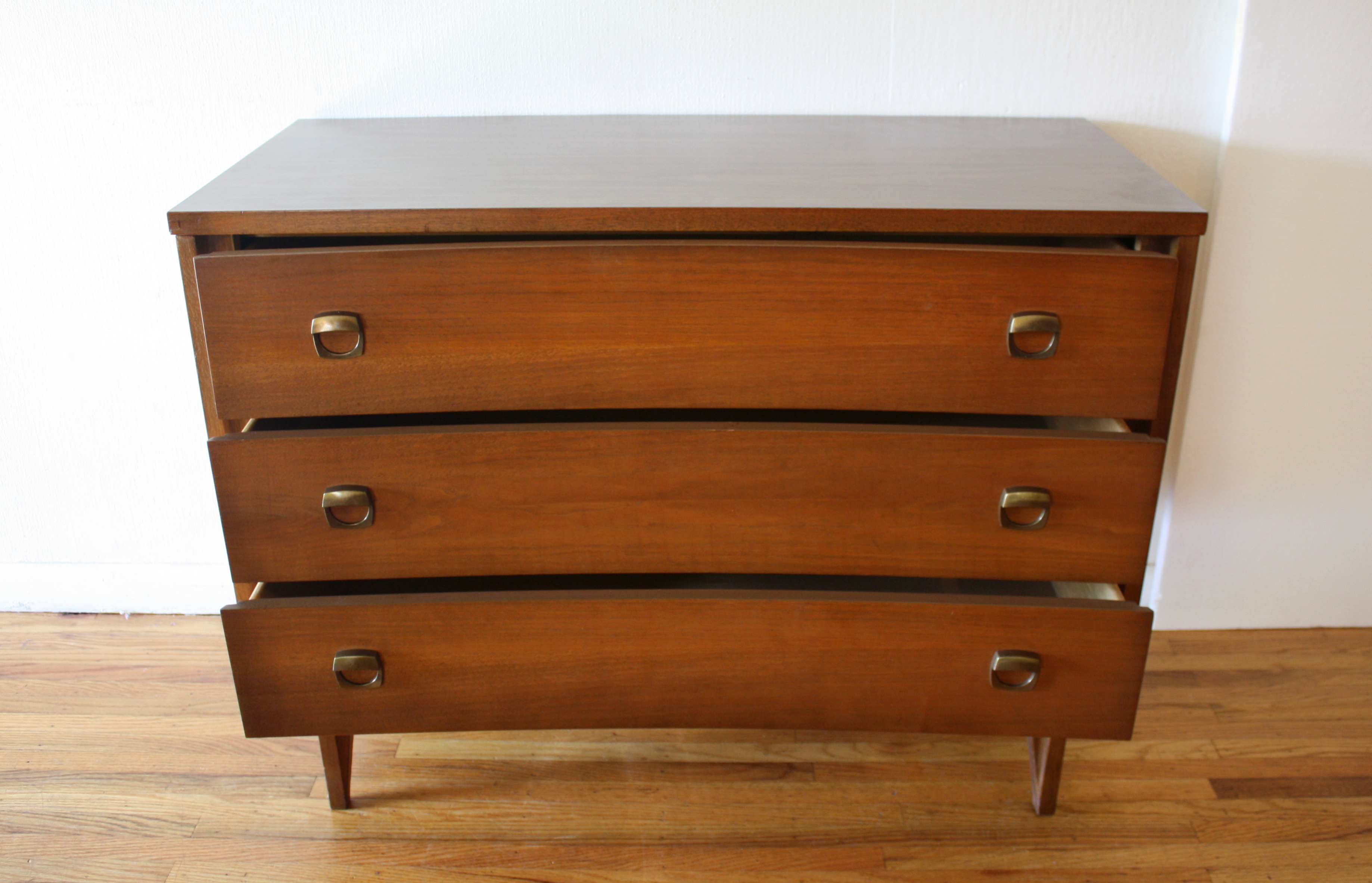 These are 2 mid century modern bachelor chest dressers by Johnson Carper. The first is from their Fashion Trend series, has 3 dovetailed drawers with sculpted wood handles and sculpted tapered legs: 32″W x 18″D x 30″H. The second has 3 dovetailed drawers with their signature concave design and geometric brass pulls, and sculpted tapered legs: 40″W x 18″D x 30″H.