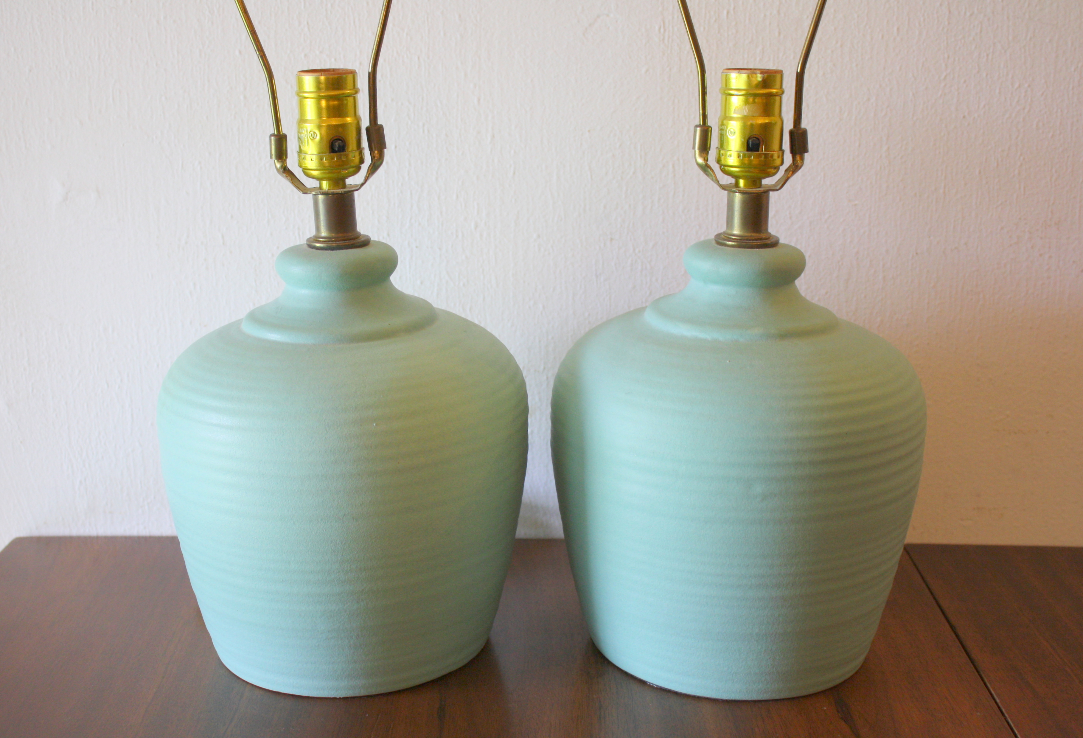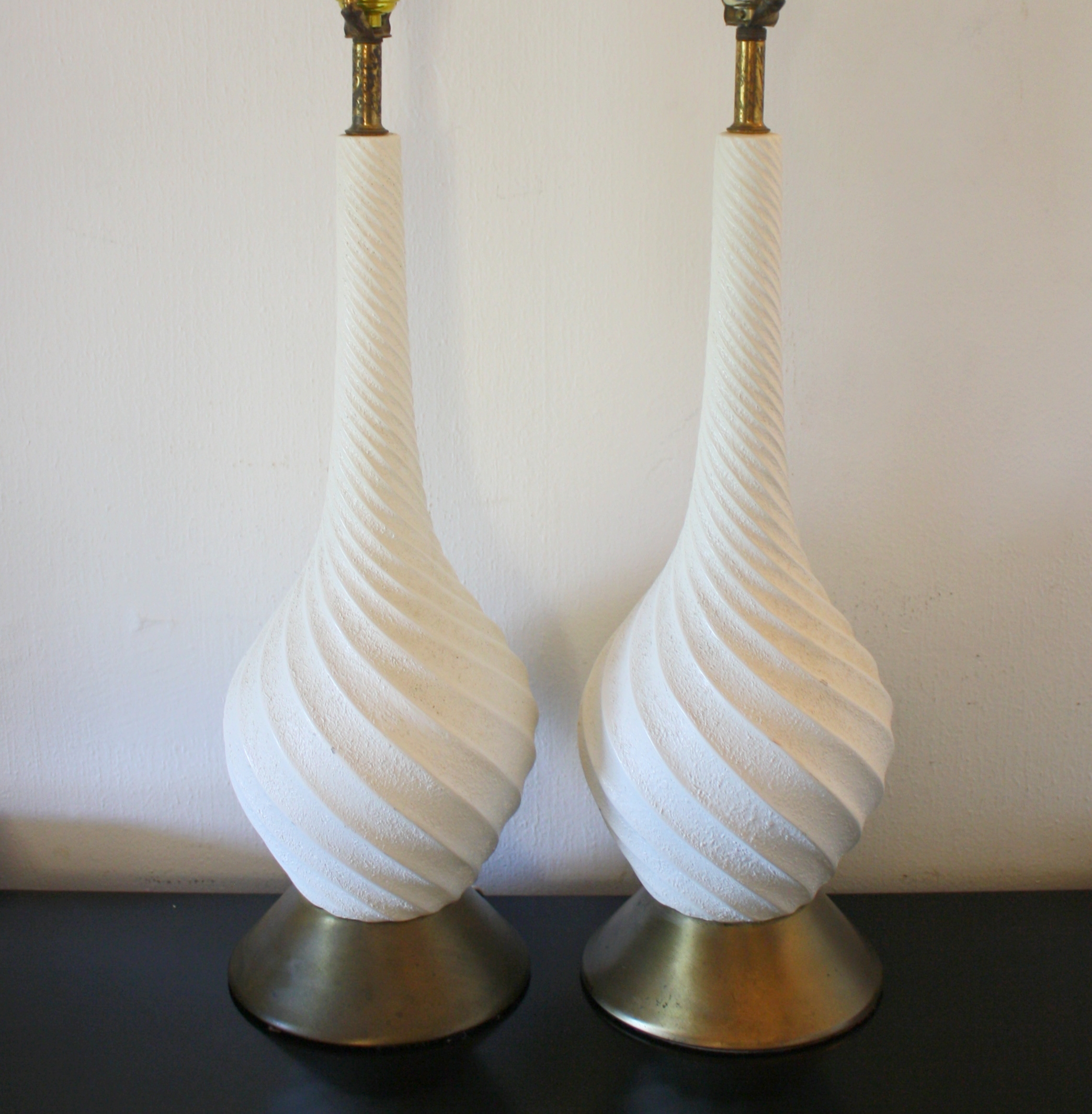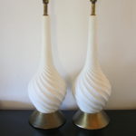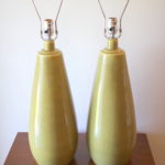 These are 3 pairs of mid century modern table lamps. The first is a pair of pottery lamps by Haeger in a pretty chartreuse. The second is a pair of pottery lamps in a pop of turquoise. The third is a pair of spiralling white pottery lamps with brass bases.