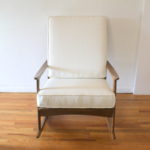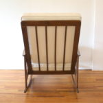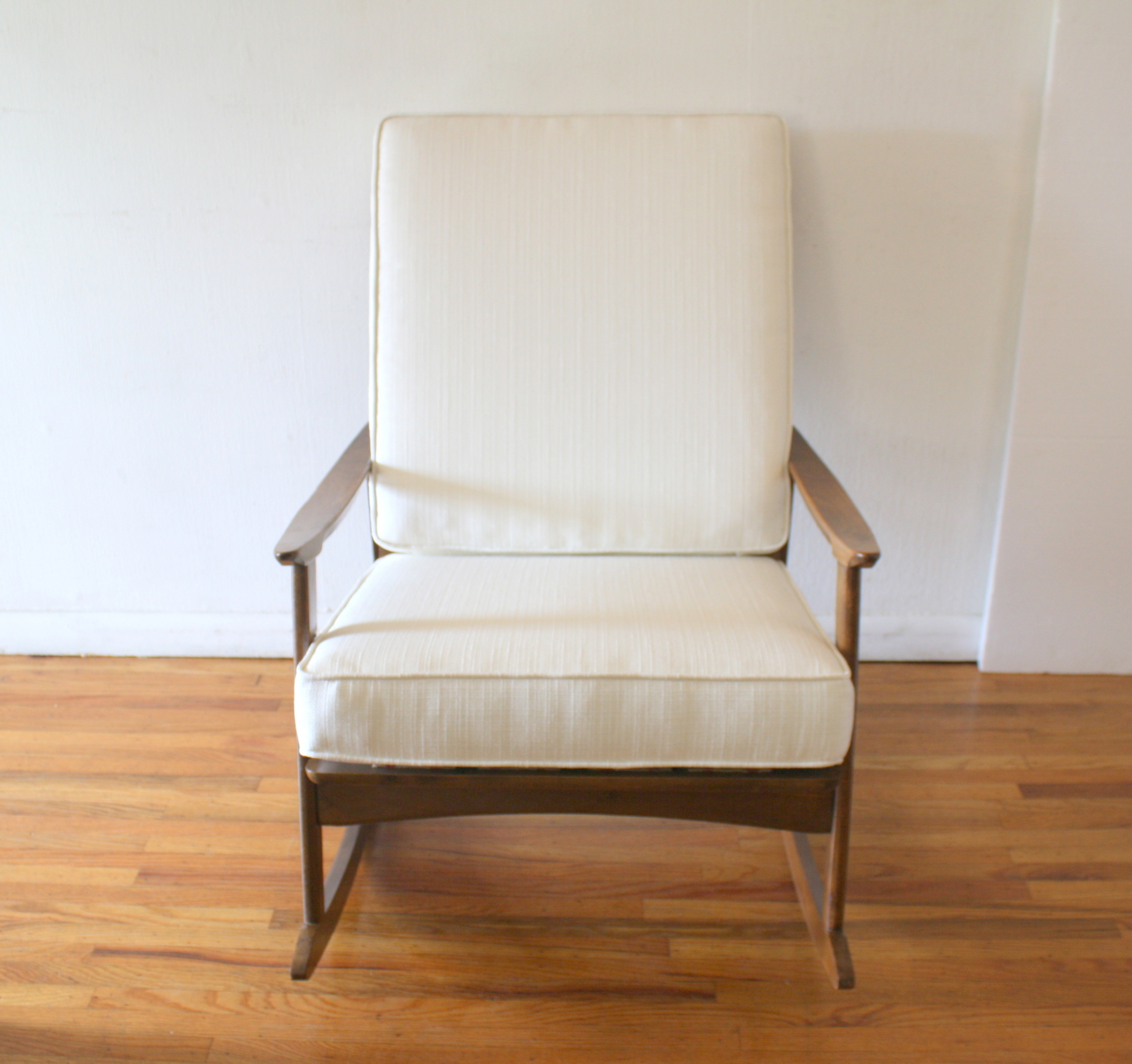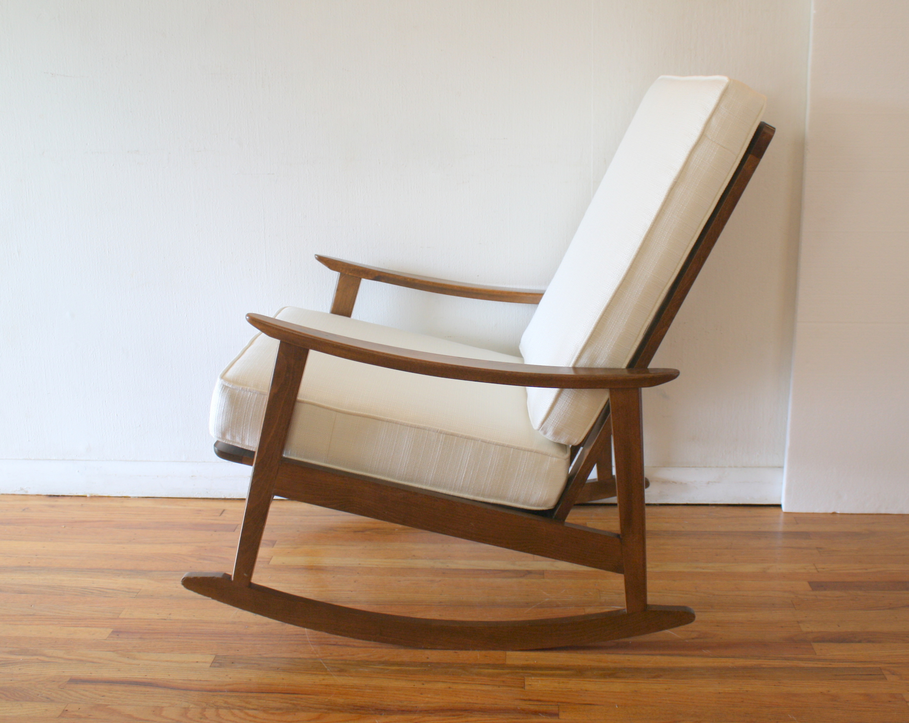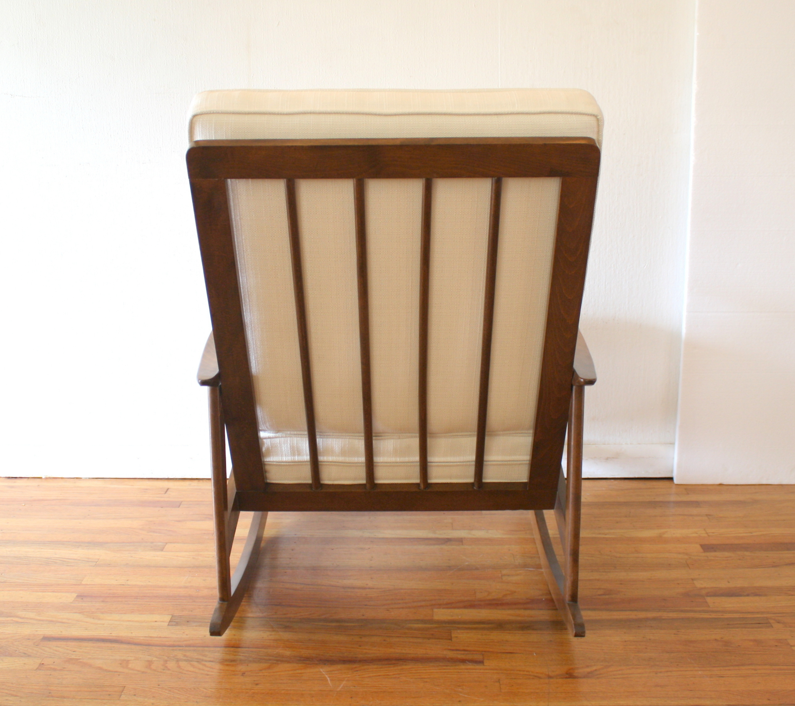 Mid Century Modern Rocking Chair This is a mid century modern rocker chair. It has a solid wood frame with a slatted back, and 2 new upholstered cushions in a cream tweed. Dimensions: 23″seat width, 20″ seat depth, 18.5″ seat height x 36″ back height. *SOLD*
